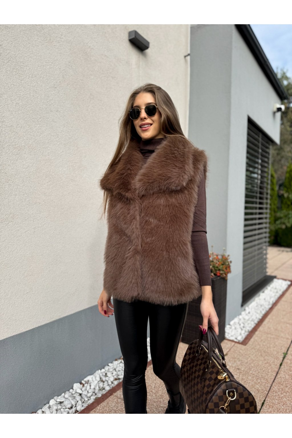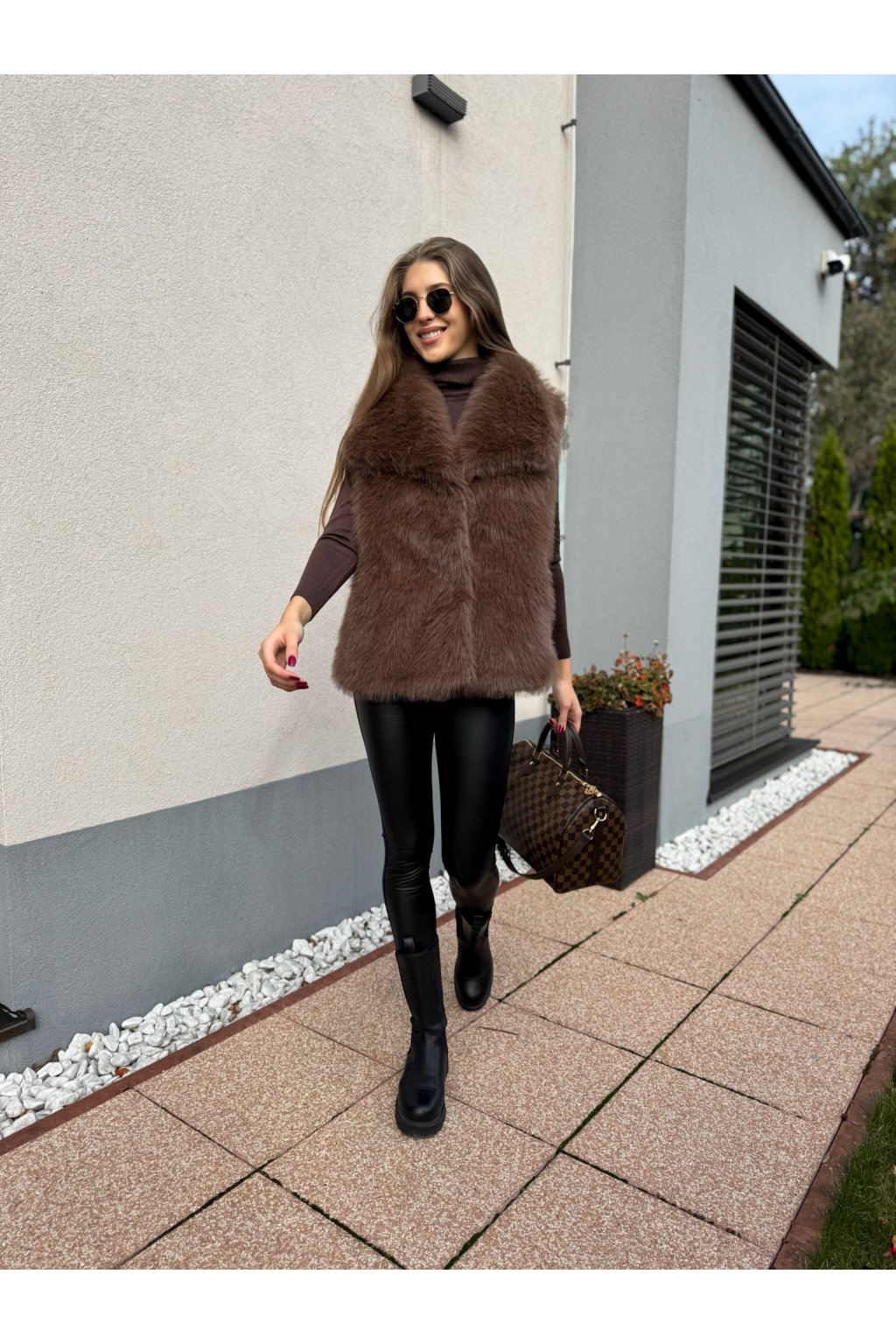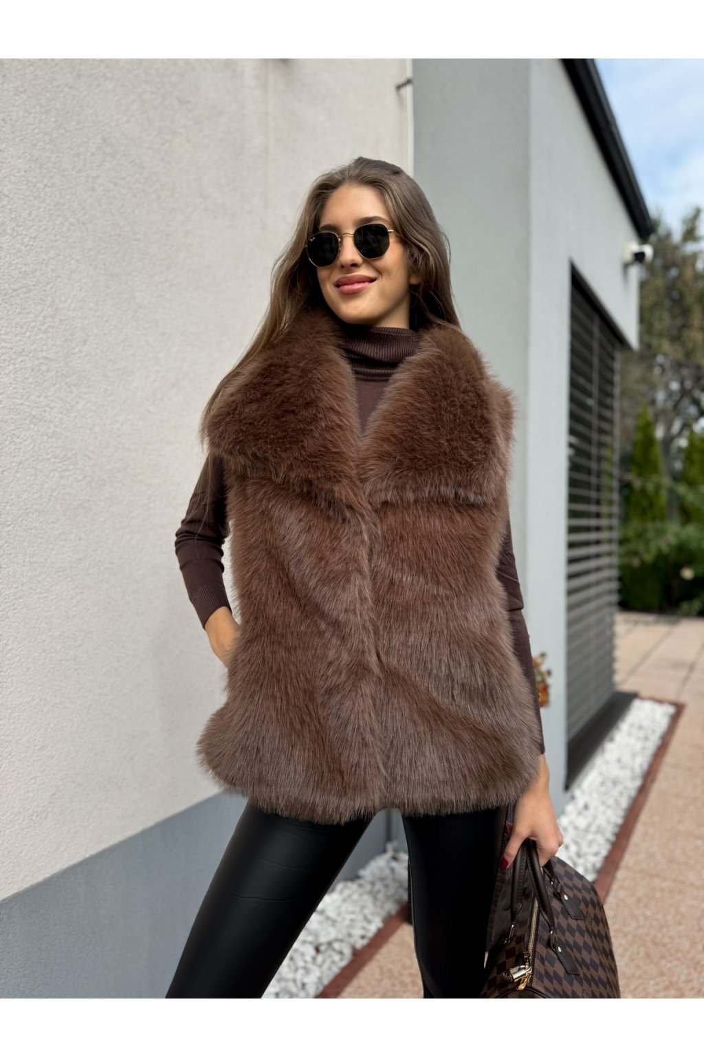 Trendy kožešinová vesta v univerzální velikosti, která sedne každé postavě. Velký límec dodává outfitu elegantní šmrnc, zatímco měkký, lesklý a hřejivý materiál zajišťuje pohodlí a styl po celý den. Vesta se zapíná na praktické cvočky a moderní hnědý odstín ji činí snadno kombinovatelnou s ostatními kousky šatníku.