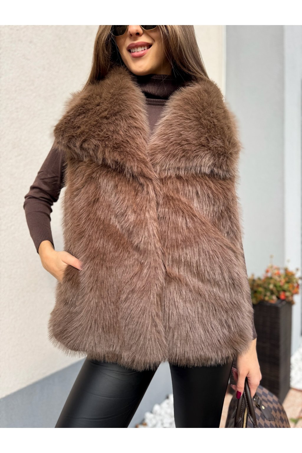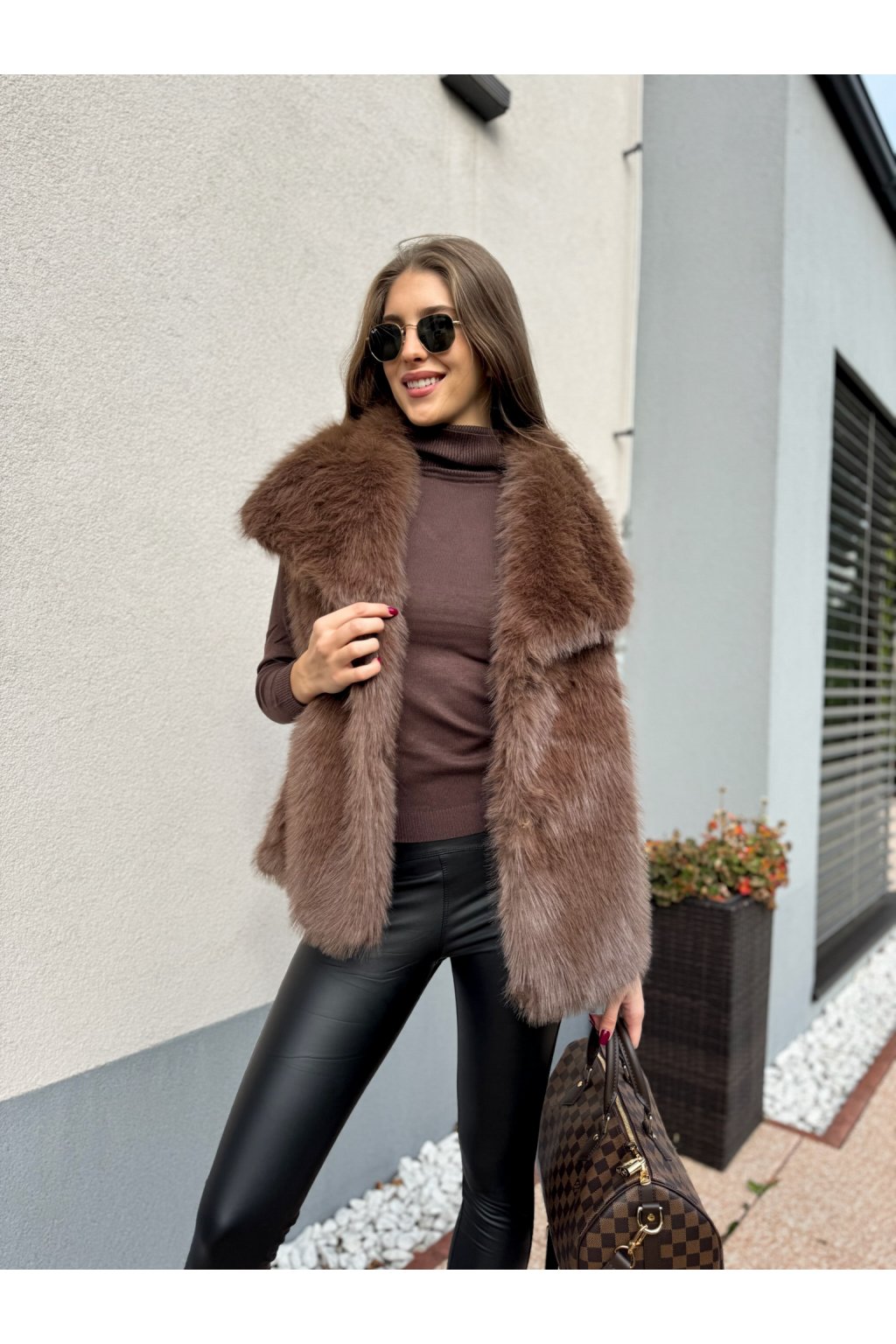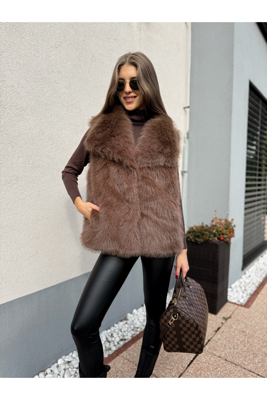 Trendy kožešinová vesta v univerzální velikosti, která sedne každé postavě. Velký límec dodává outfitu elegantní šmrnc, zatímco měkký, lesklý a hřejivý materiál zajišťuje pohodlí a styl po celý den. Vesta se zapíná na praktické cvočky a moderní hnědý odstín ji činí snadno kombinovatelnou s ostatními kousky šatníku.