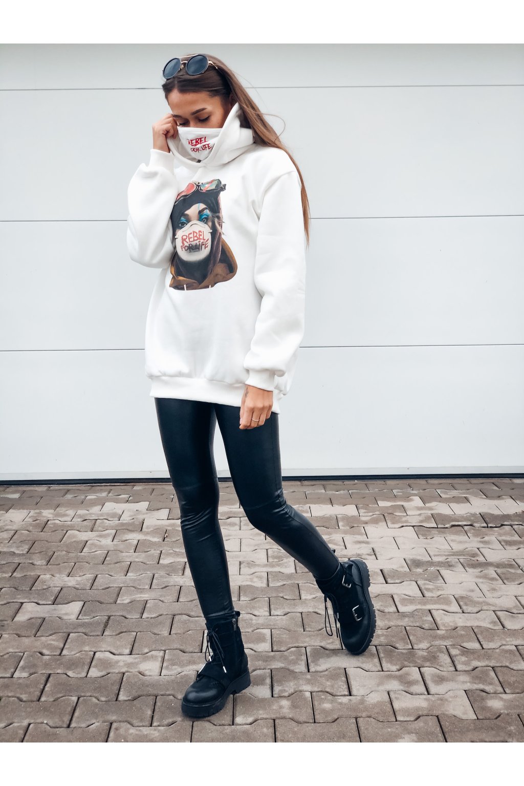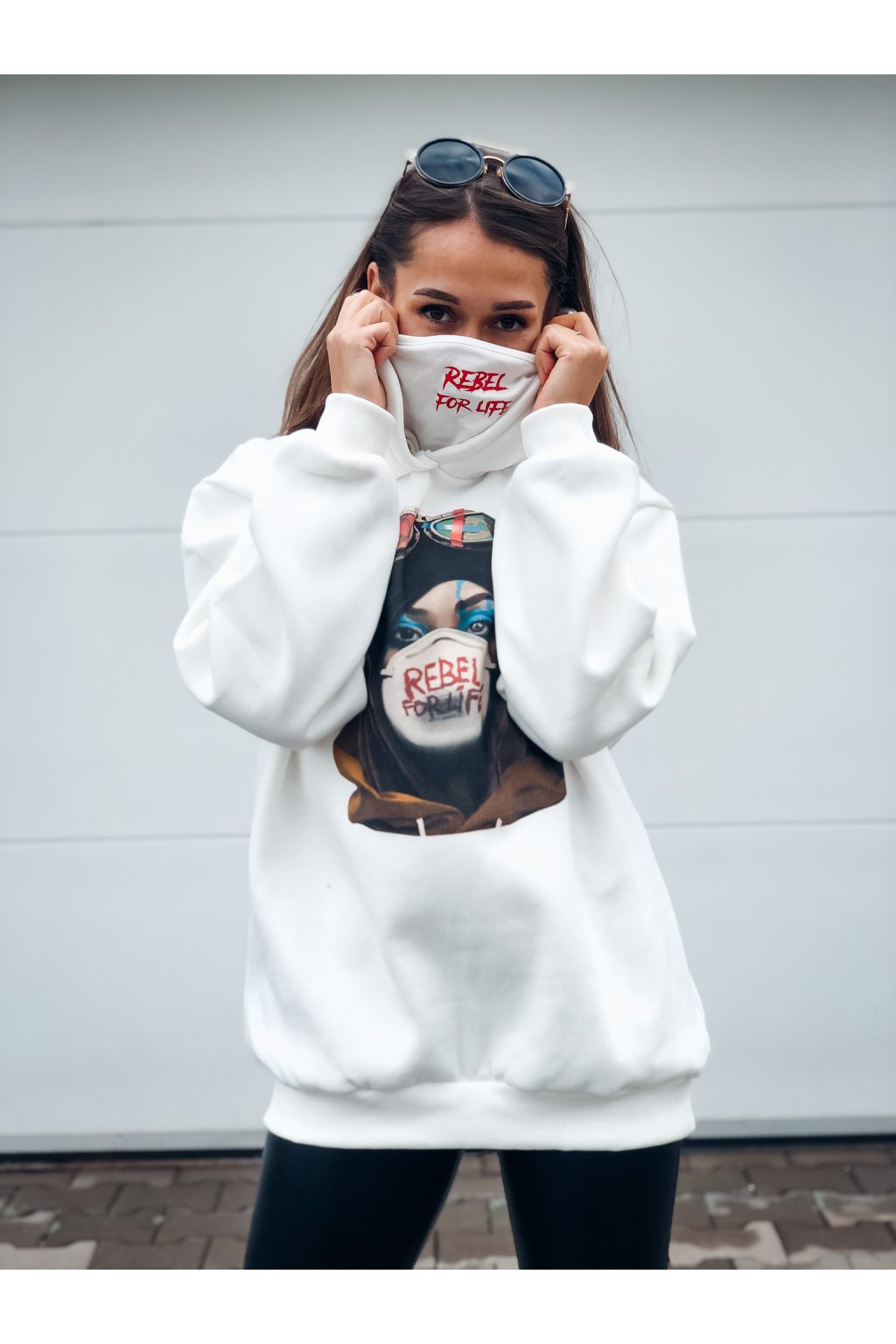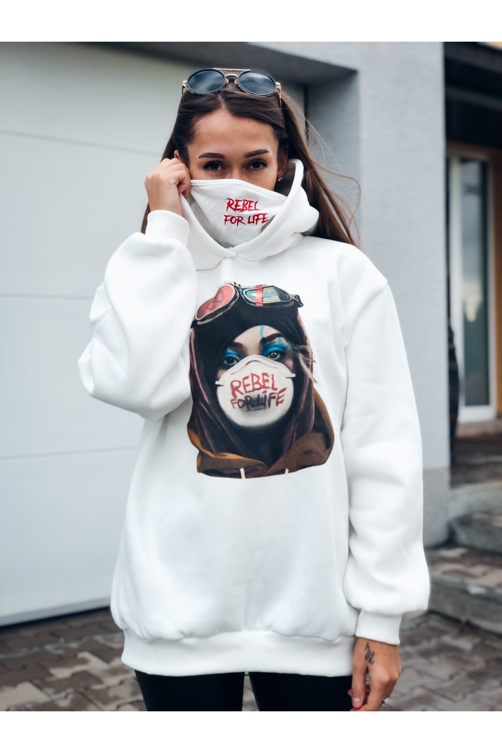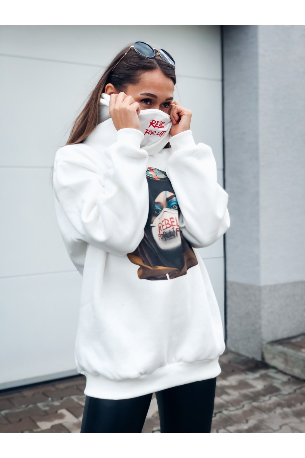 Stylová oversize mikina s rouškou, 2v1 s doplňkem po stranách rukávů. Rouška je k mikině přišitá, ale není nutné ji využívat, při nevyužití poslouží jako šátek na krk. Mikina má kapuci a je vyrobena z kvalitní počesané teplákoviny, která je tepleješí a mohutnější než klasická tenká teplákovina. Nosit ji můžete k legínám či riflím. Naprosto bomba kousek, který si zamilujete.