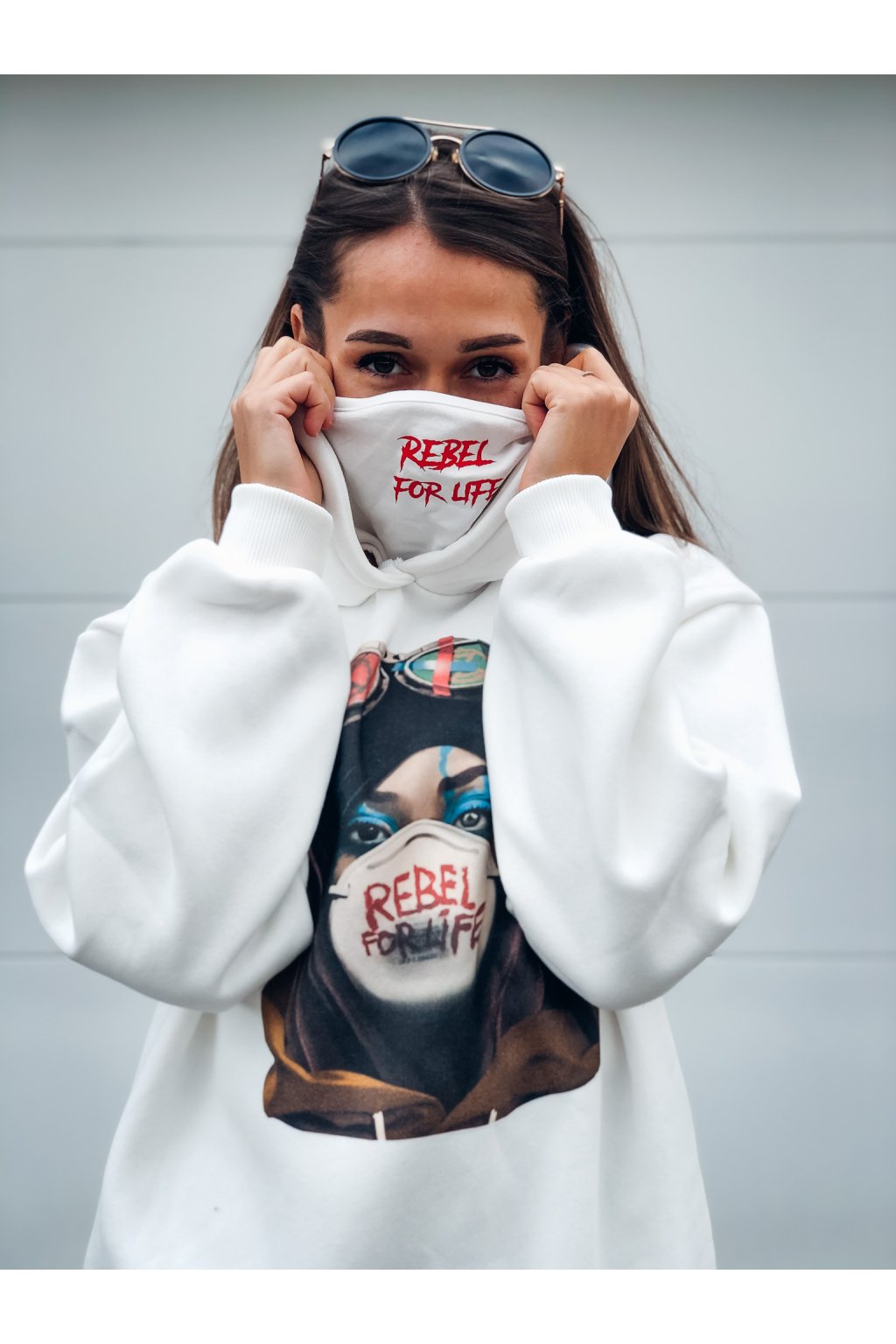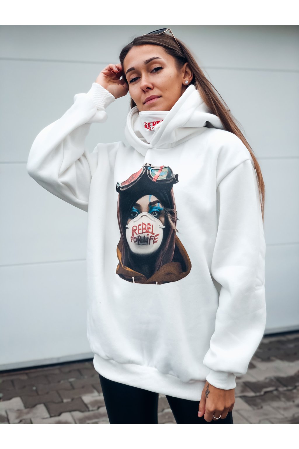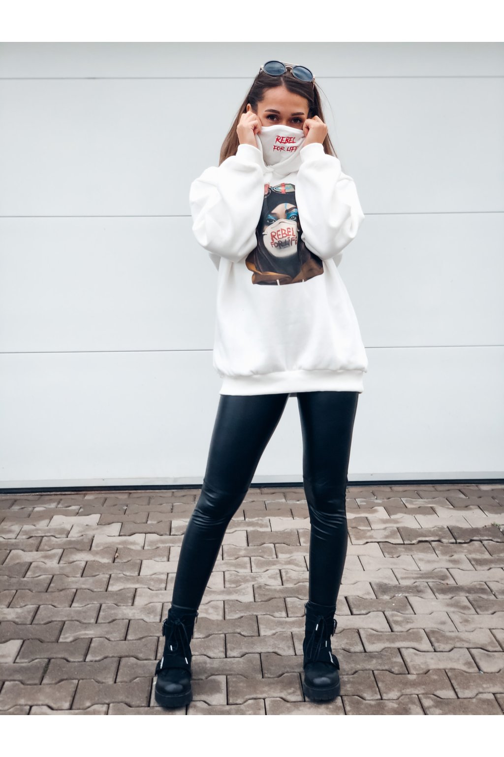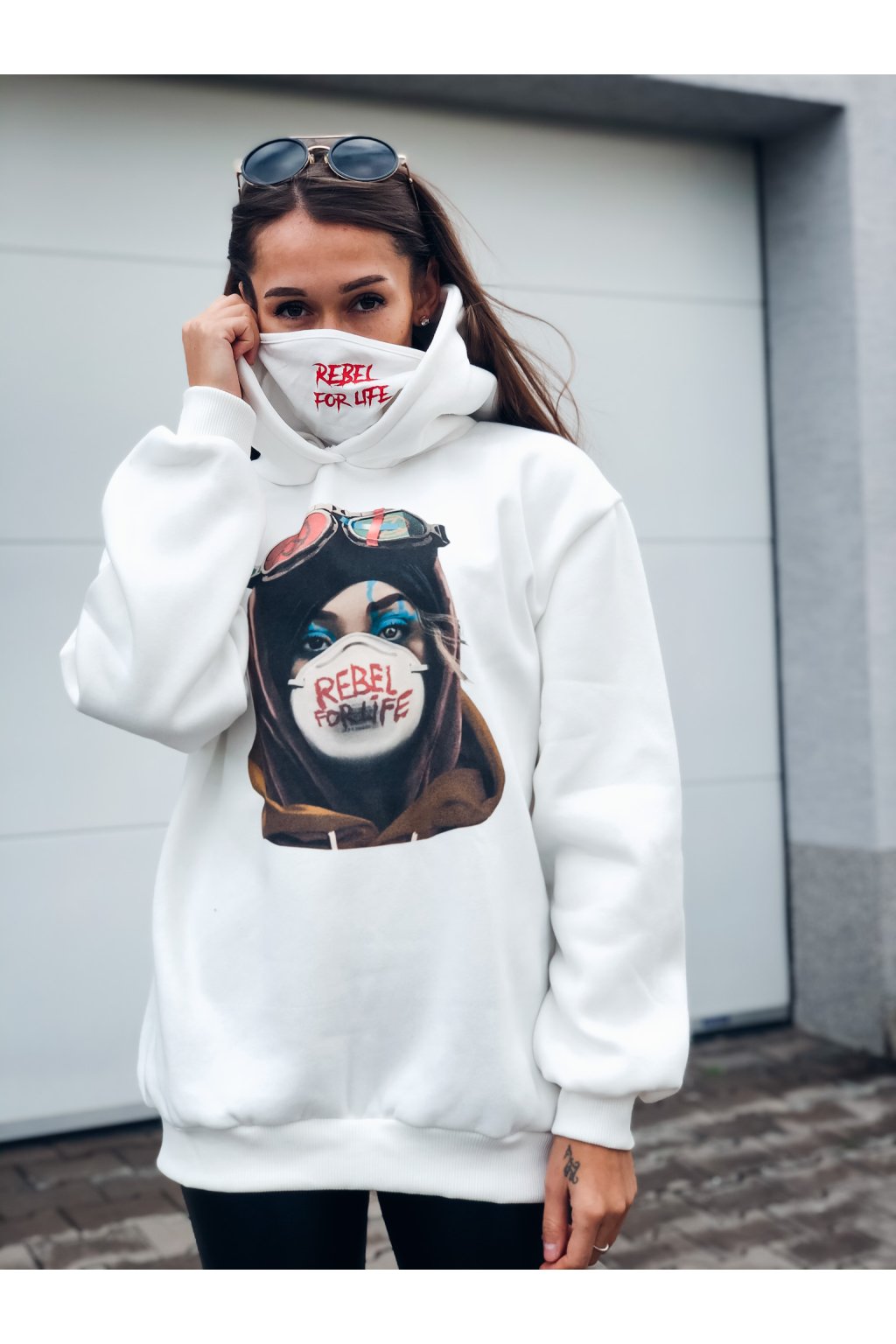 Stylová oversize mikina s rouškou, 2v1 s doplňkem po stranách rukávů. Rouška je k mikině přišitá, ale není nutné ji využívat, při nevyužití poslouží jako šátek na krk. Mikina má kapuci a je vyrobena z kvalitní počesané teplákoviny, která je tepleješí a mohutnější než klasická tenká teplákovina. Nosit ji můžete k legínám či riflím. Naprosto bomba kousek, který si zamilujete.