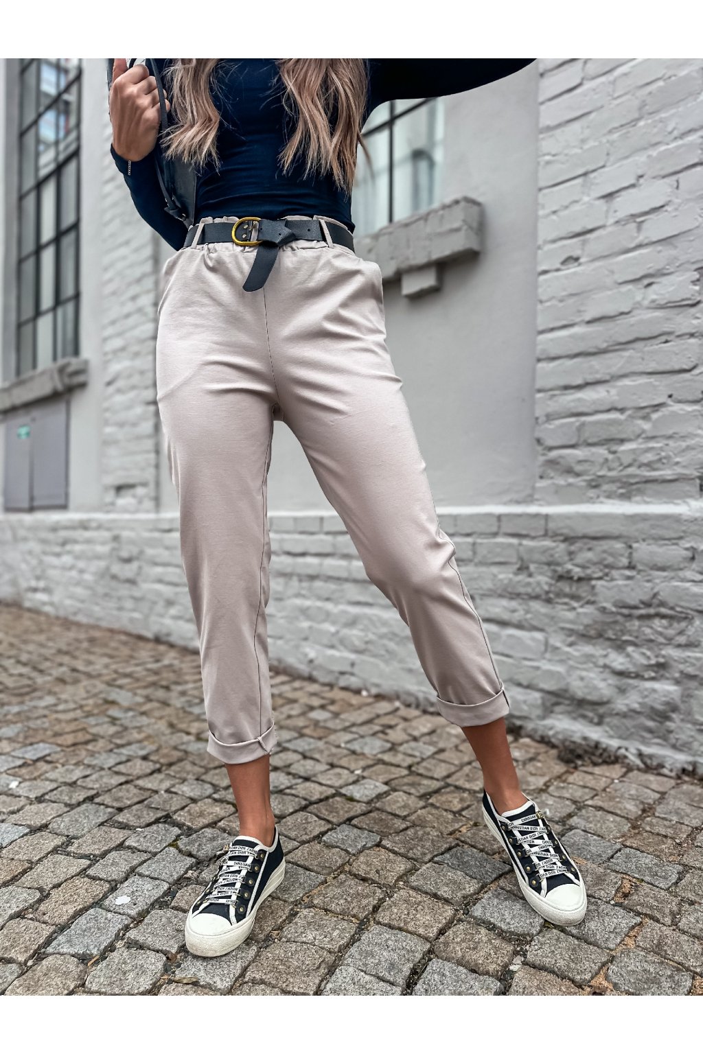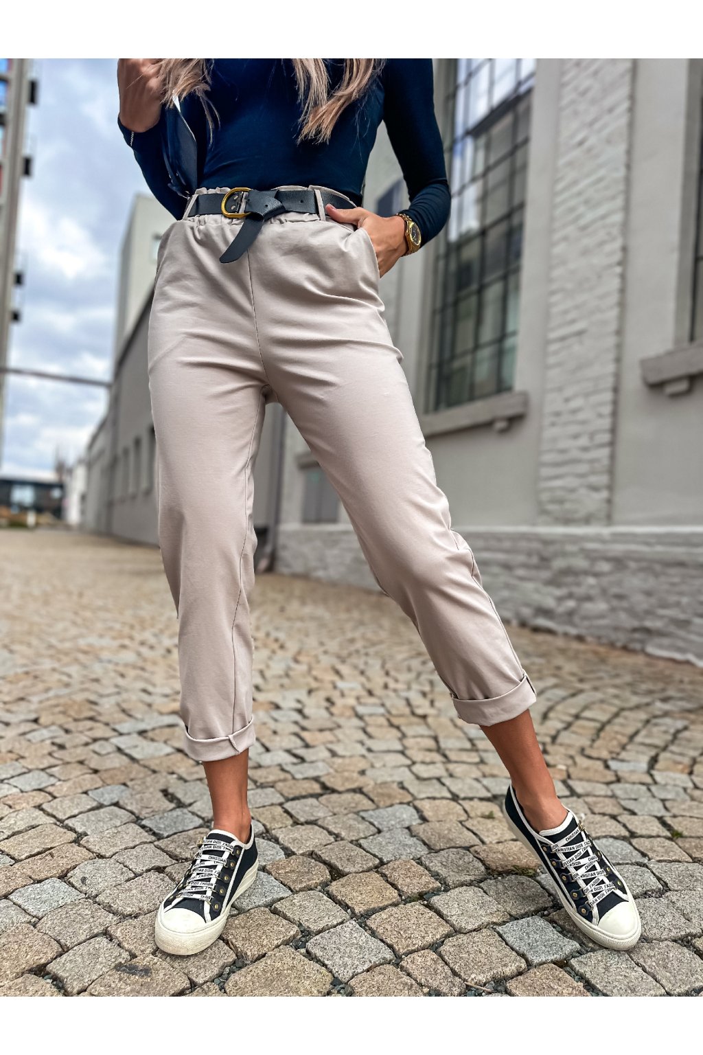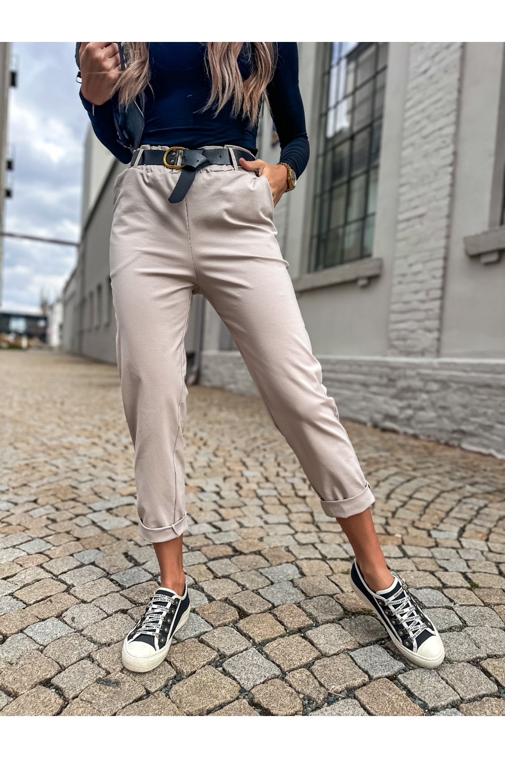 Stylové dámské kalhoty rovného střihu s páskem. Nakombinovat můžete s některým z našich tílek, triček a outfit můžete doplnit sakem.