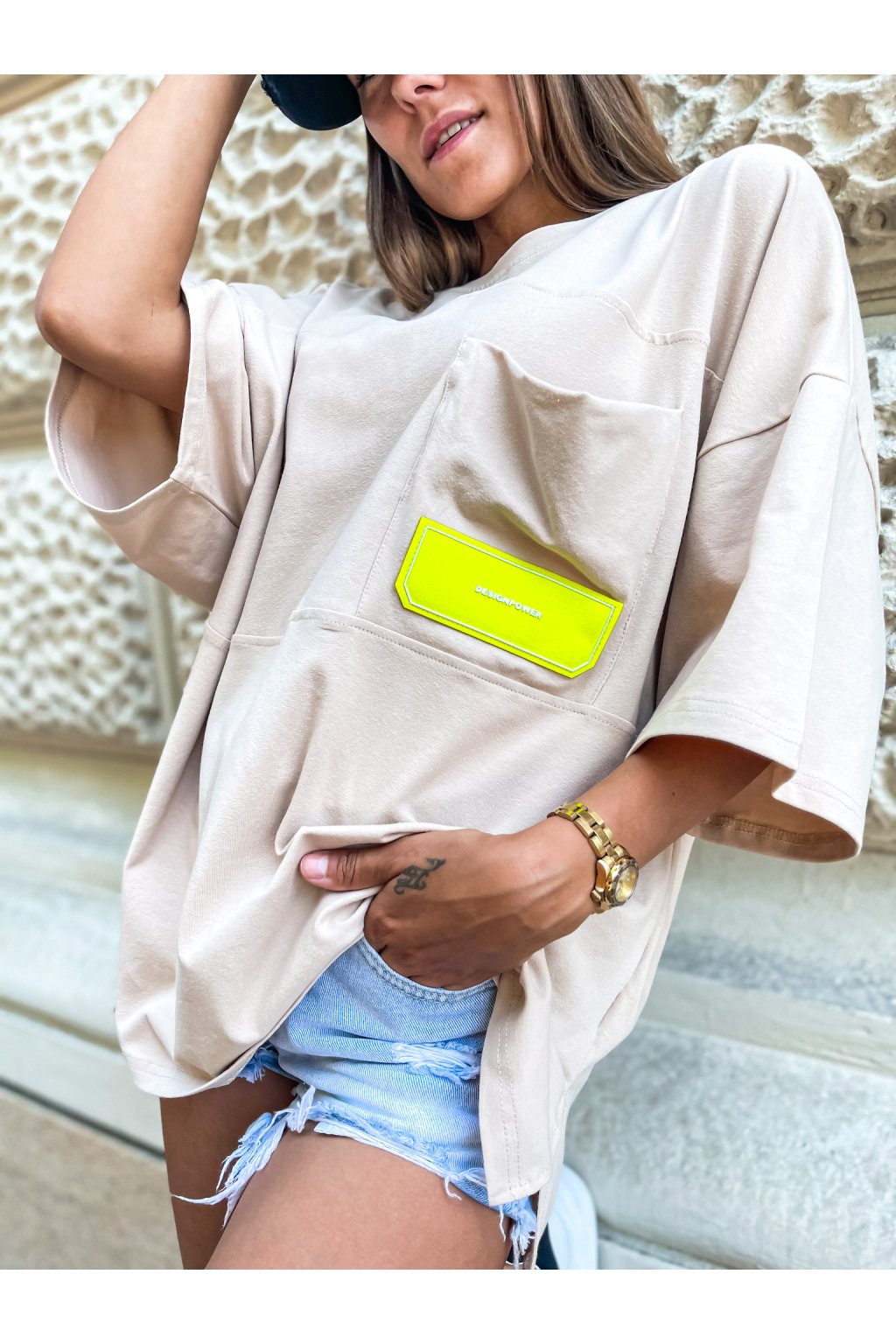 Stylové dámské oversize tričko s rozparky po obou stranách, kapsou a nášivkou. Nakombinovat můžete s kraťasemi s naší nabídky. Tričko vypadá skvěle i k boyfriend nebo klasickým riflím.