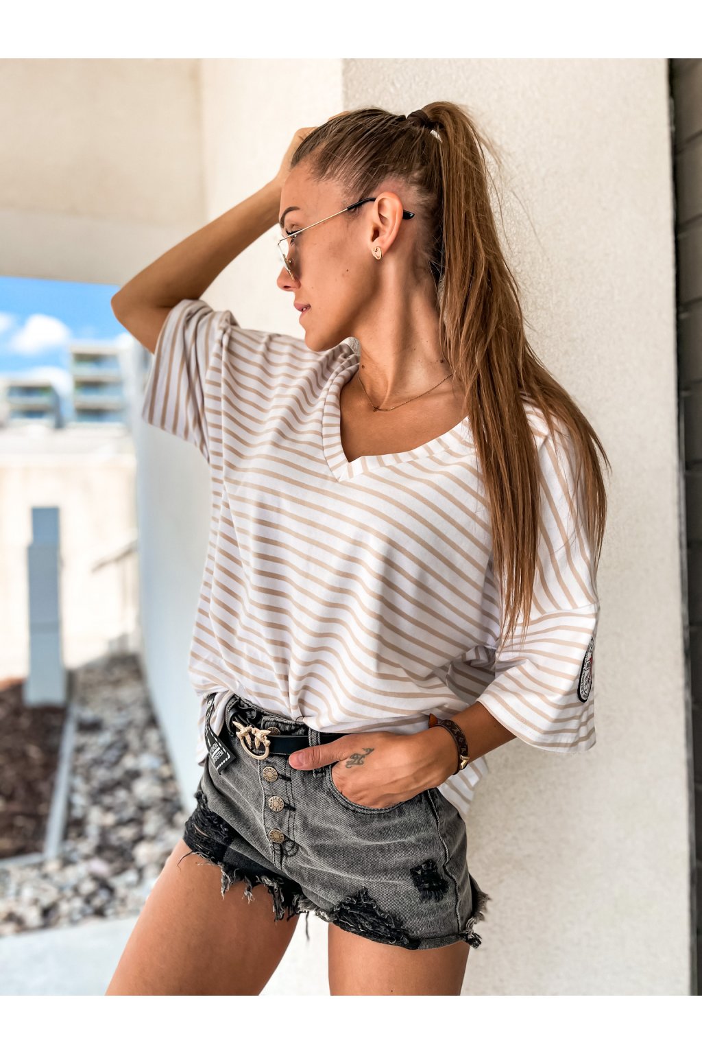 Stylové oversize tričko V Neck s nášivkami a lehce odhalenými zády. Stylový kousek, který je ideální na jaro, léto. Sladit můžete s klasickými i boyfriend riflemi nebo kraťásky.