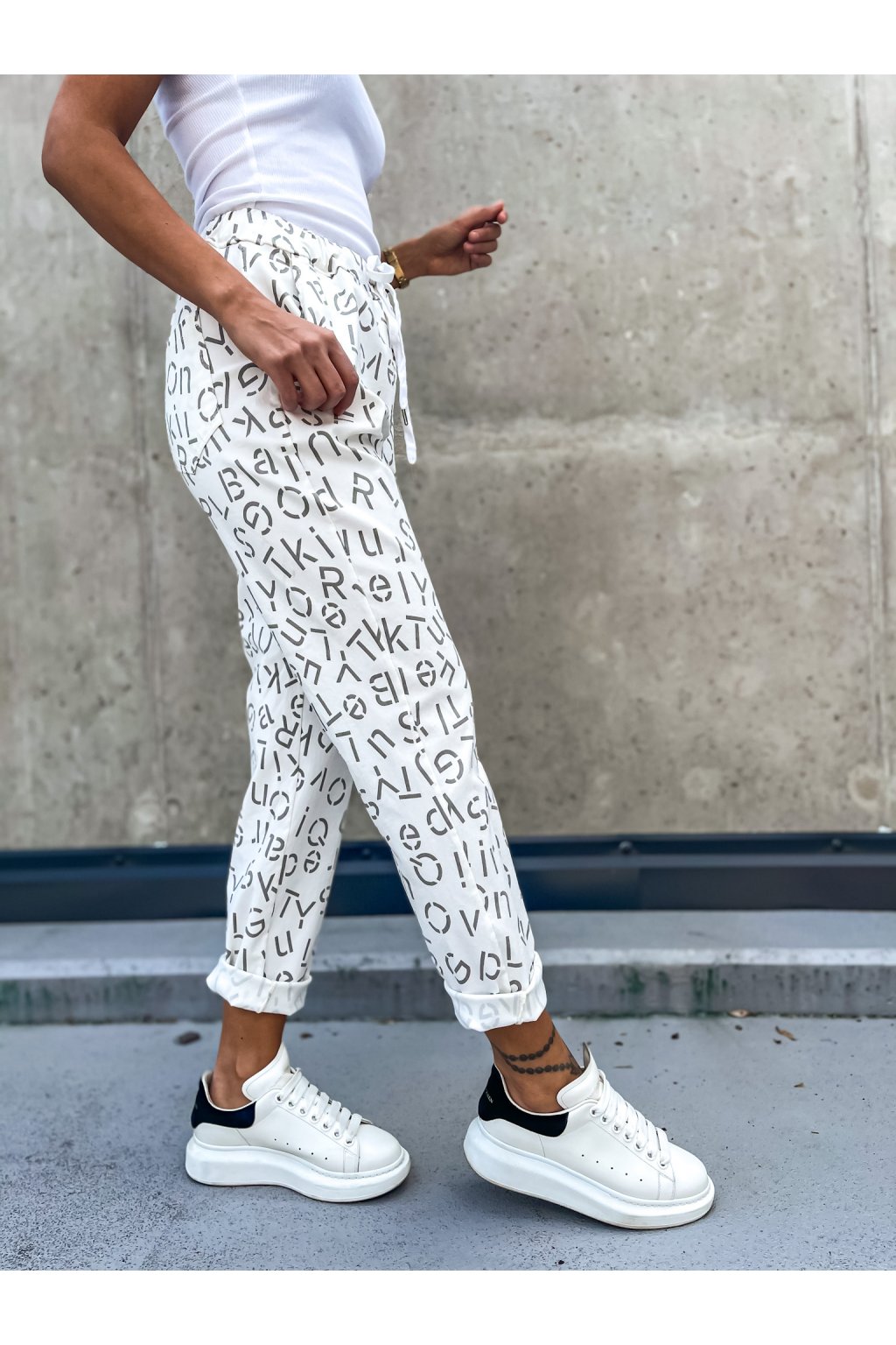 Dámské stylové plátěné kalhoty s písmeny. V pase jsou na gumu a můžete si je stáhnout šňůrkami. Je možné je nosit do pasu, ale i bederně se spadlejším sedem. Je možné je nosit ohrnuté jako na fotce.