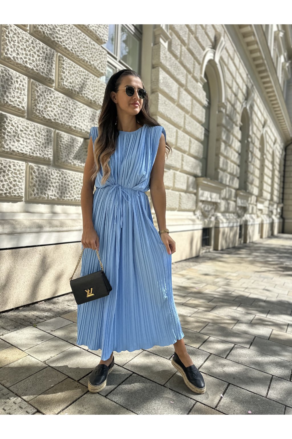 Dámské plísované šaty s páskem a ramenními vycpávkami Baby Blue
