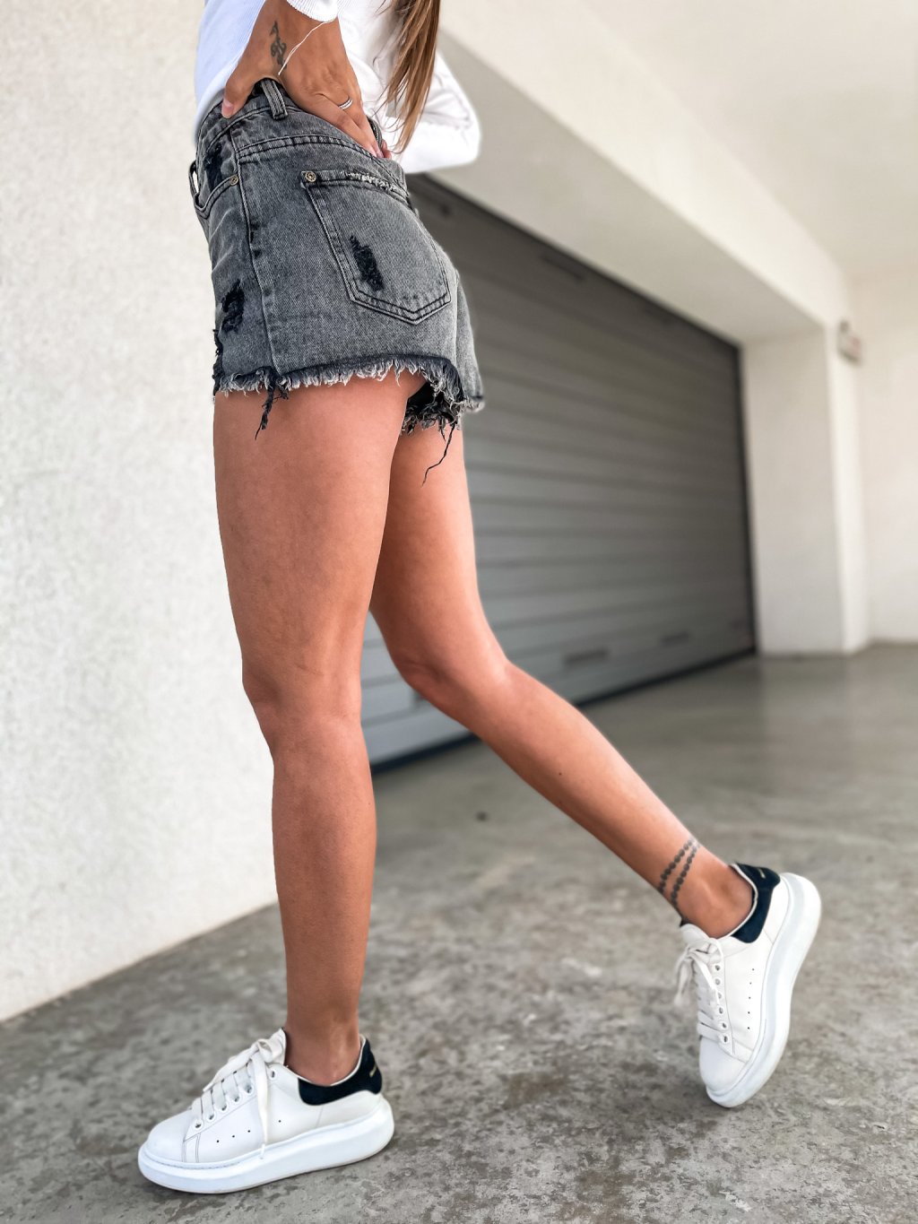 Stylové potrhané kraťasy s vysokým pasem v melírované tmavě šedé barvě až do černa. Zkombinovat můžete s našimi tričkami, svetry, topy. Jsou lehce pružné.