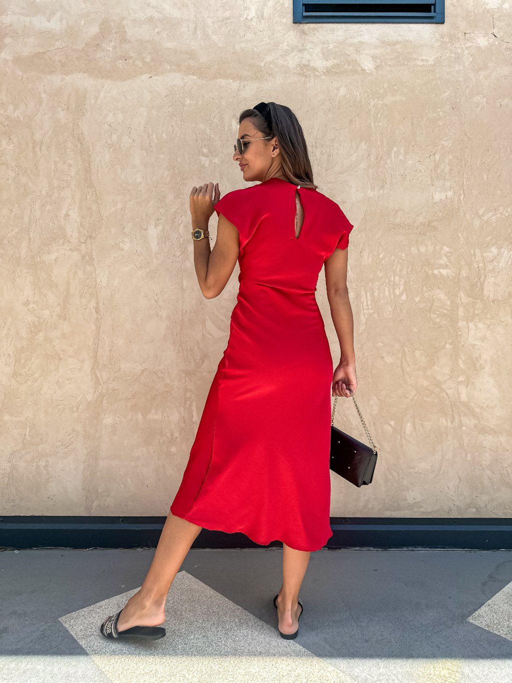 Dámské saténové midi šaty s uzlem Red