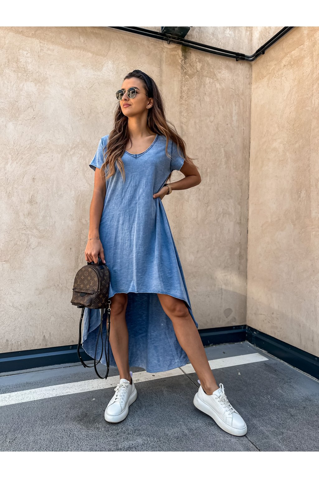 Stylové dámské šaty s výstřihem do V s nezakončeným spodním lemem a rukávy. Mají velmi zajímavý a originální střih, vzadu jsou delší než vepředu. Šaty jsou vzdušné a je možné je nakombinovat i na jaře a na podzim ke kožené nebo riflové bundě a vytvořit si tak pohodlný a stylový outfit. Hodí se jak k teniskám, tak pantoflím a na podzim k biker botám.