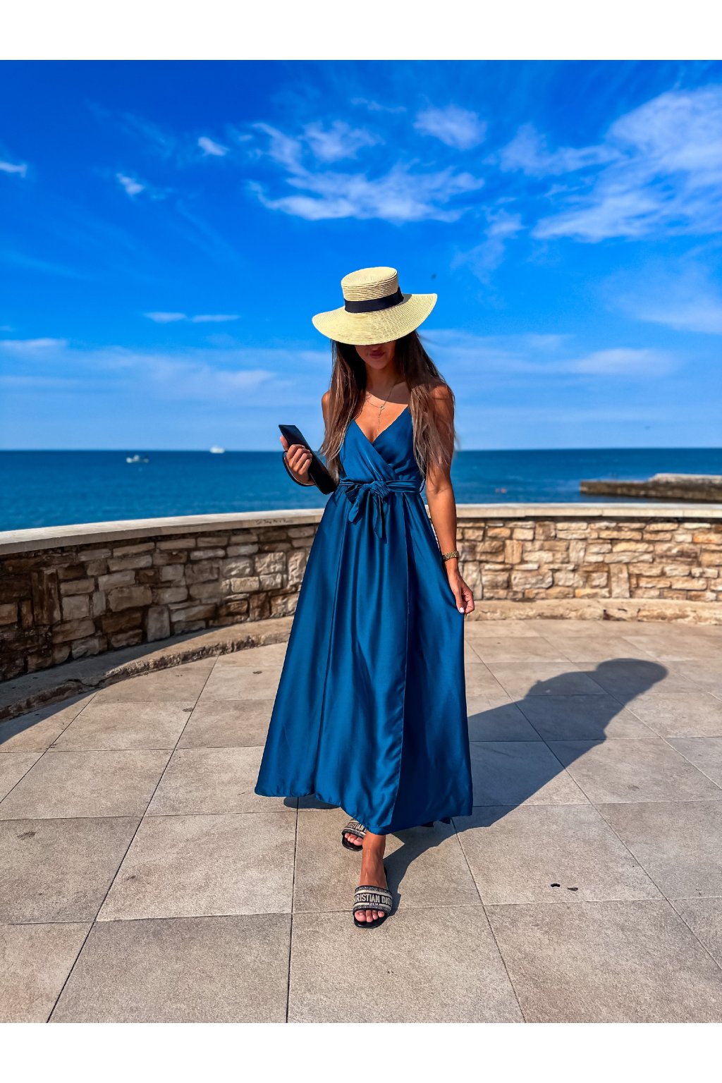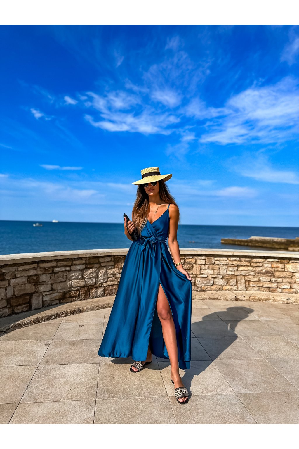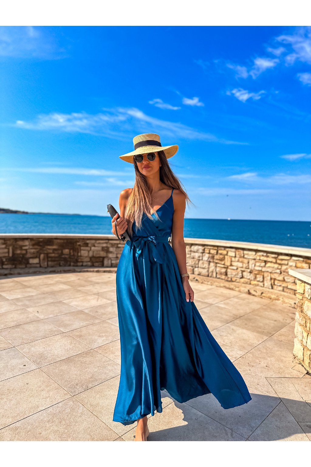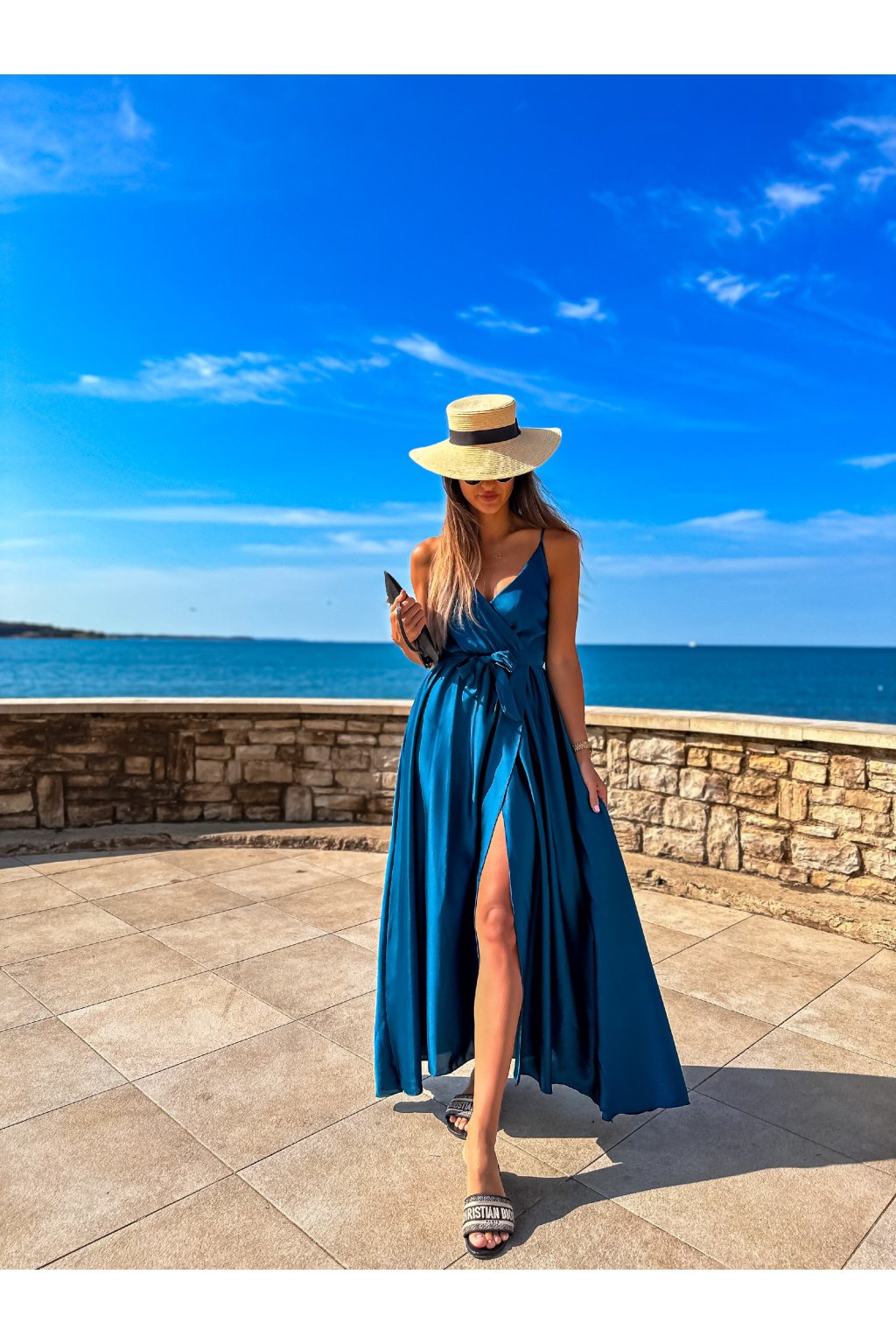 Luxusní dámské dlouhé šaty s překládaným výstřihem, páskem na uvázání a nastavitelnými ramínky. Ideální šaty na společenské události, ale třeba i na večer do města nebo k moři. Materiál alá satén.