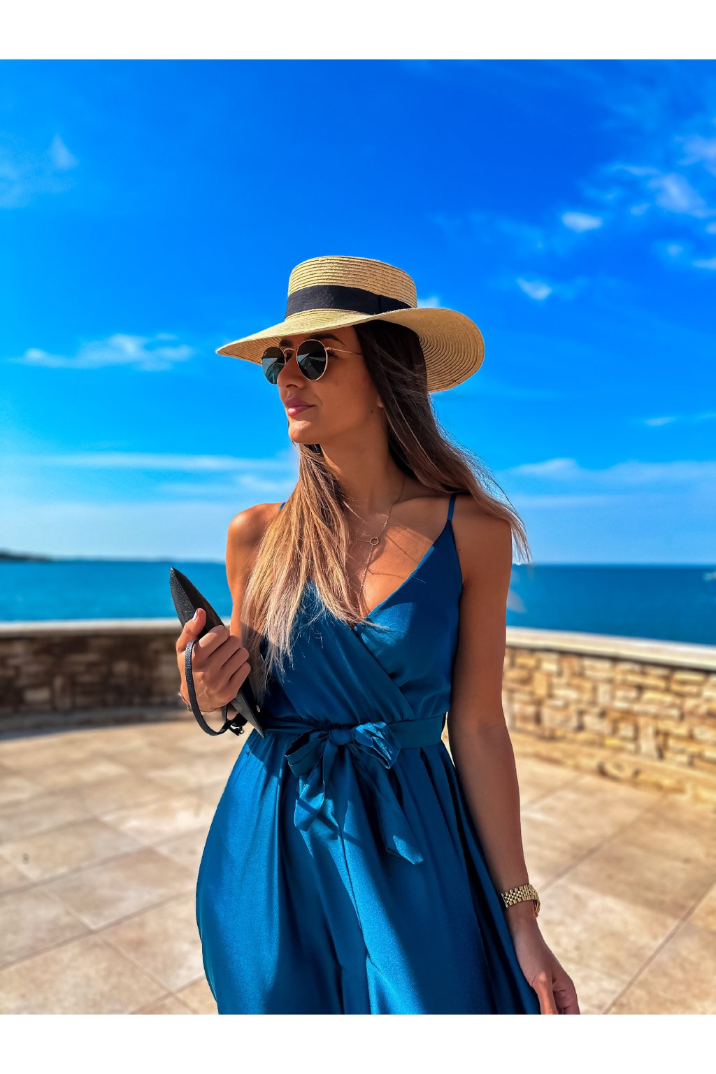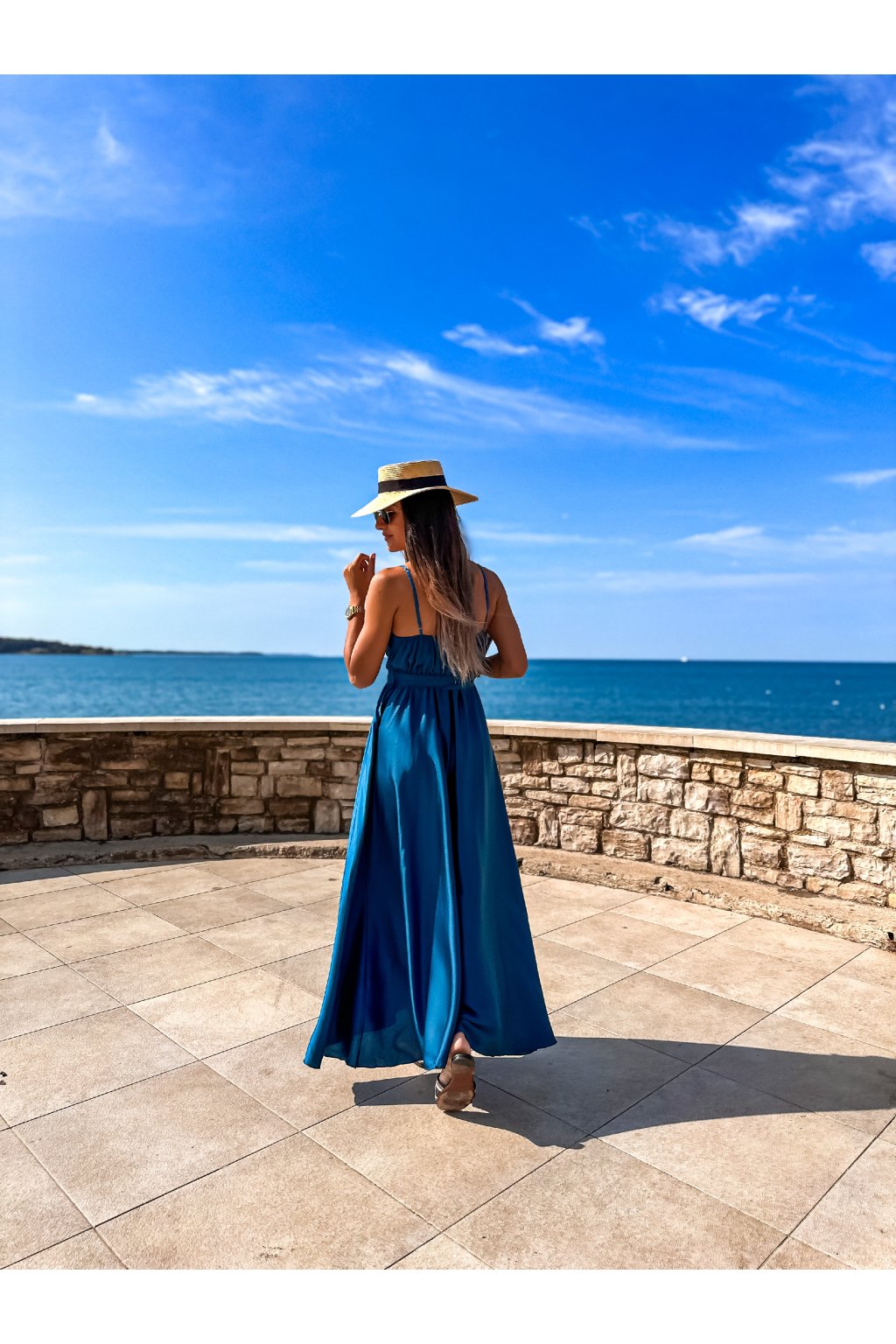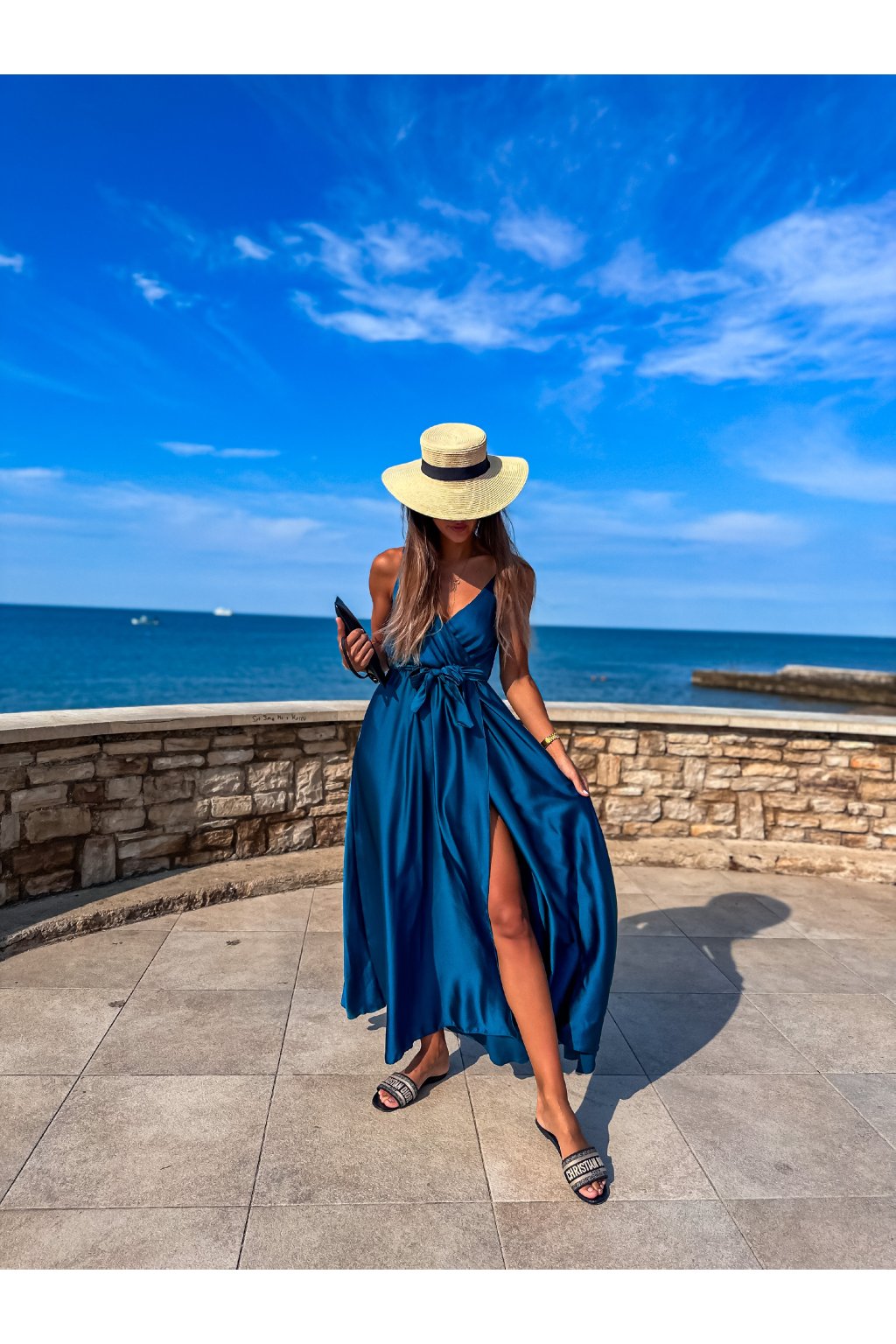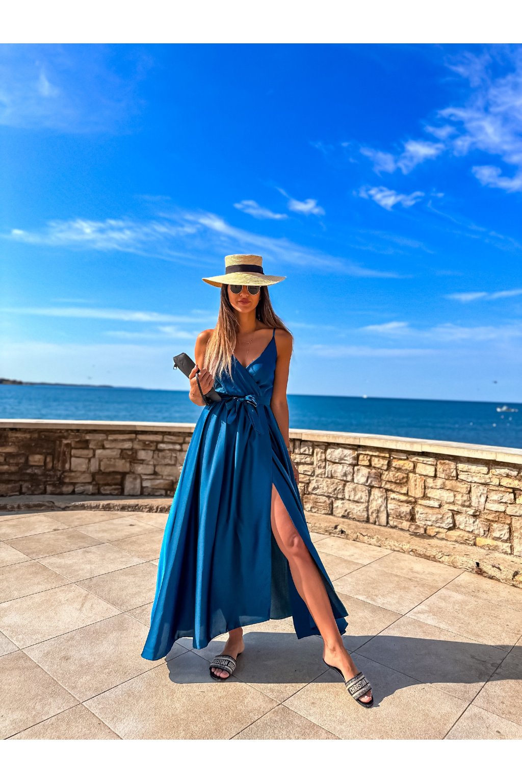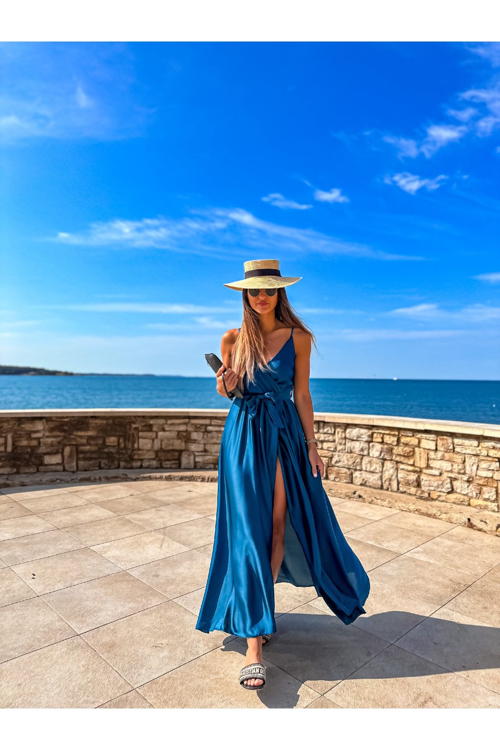 Luxusní dámské dlouhé šaty s překládaným výstřihem, páskem na uvázání a nastavitelnými ramínky. Ideální šaty na společenské události, ale třeba i na večer do města nebo k moři. Materiál alá satén.