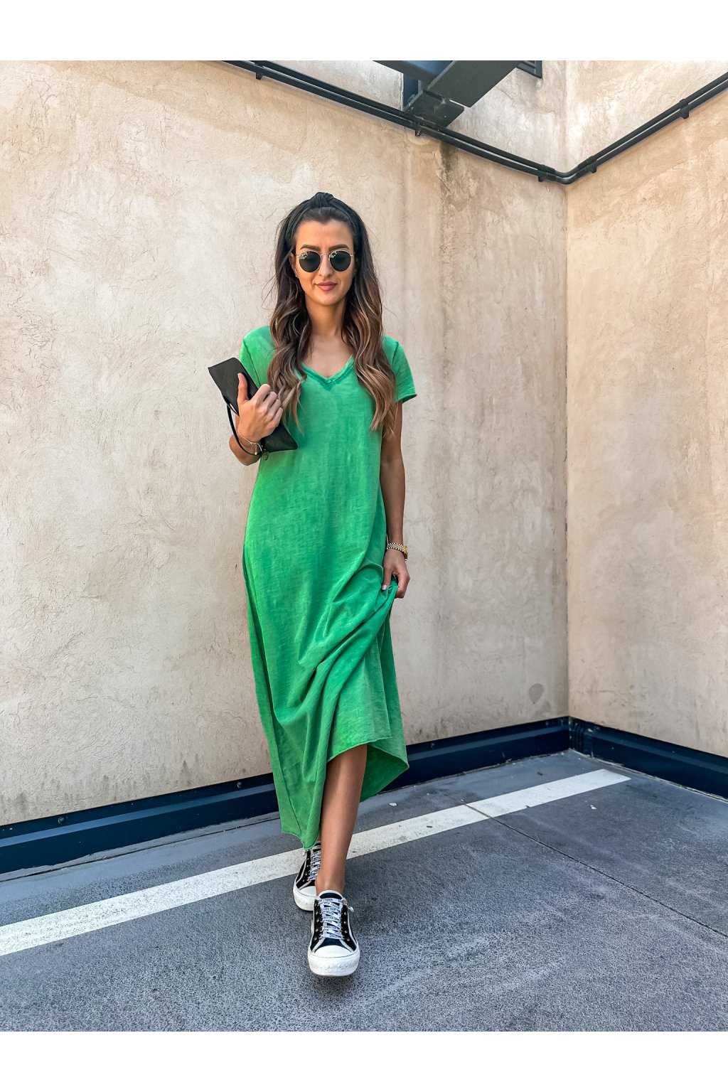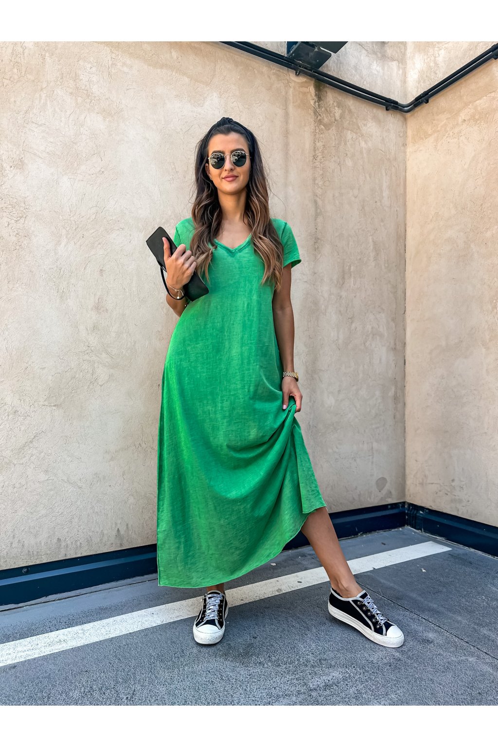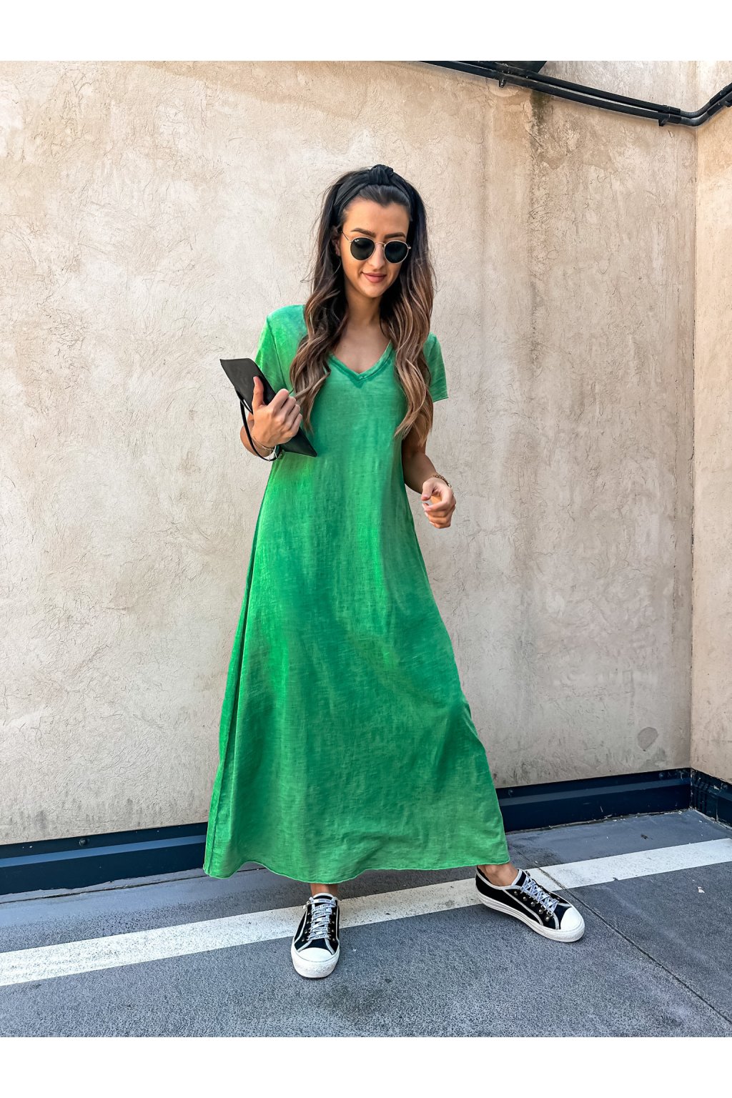 Stylové dámské šaty s výstřihem do V s nezakončeným spodním lemem a rukávy. Šaty jsou vzdušné a je možné je nakombinovat i na jaře a na podzim ke kožené nebo riflové bundě a vytvořit si tak pohodlný a stylový outfit. Hodí se jak k teniskám, tak pantoflím a na podzim k biker botám.