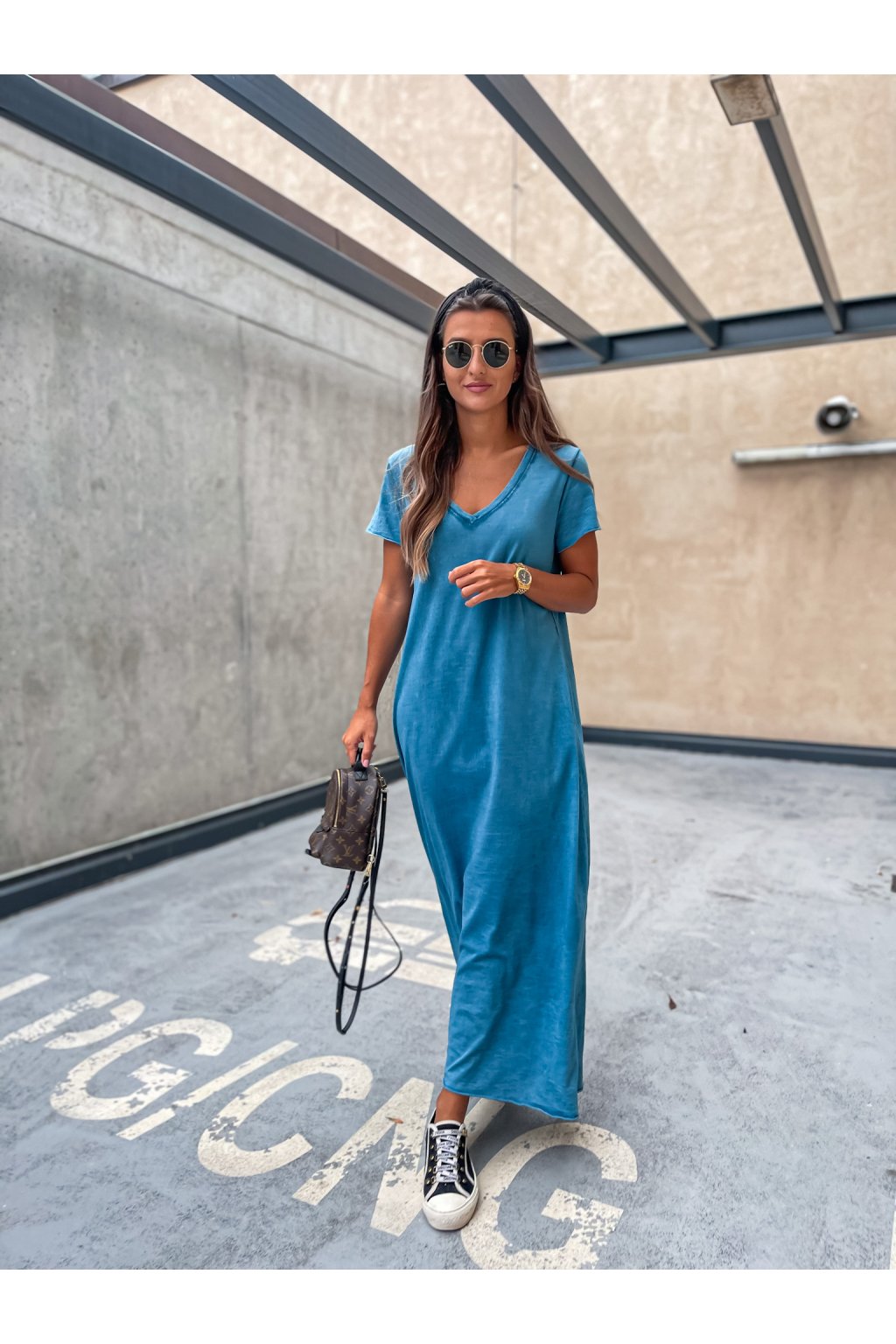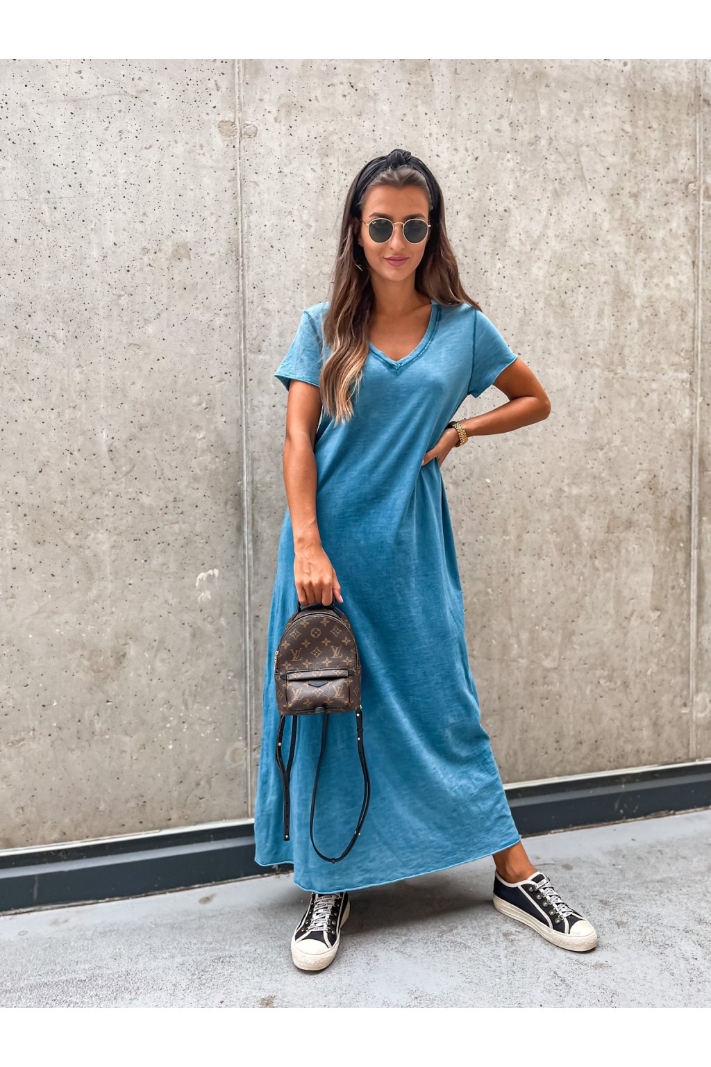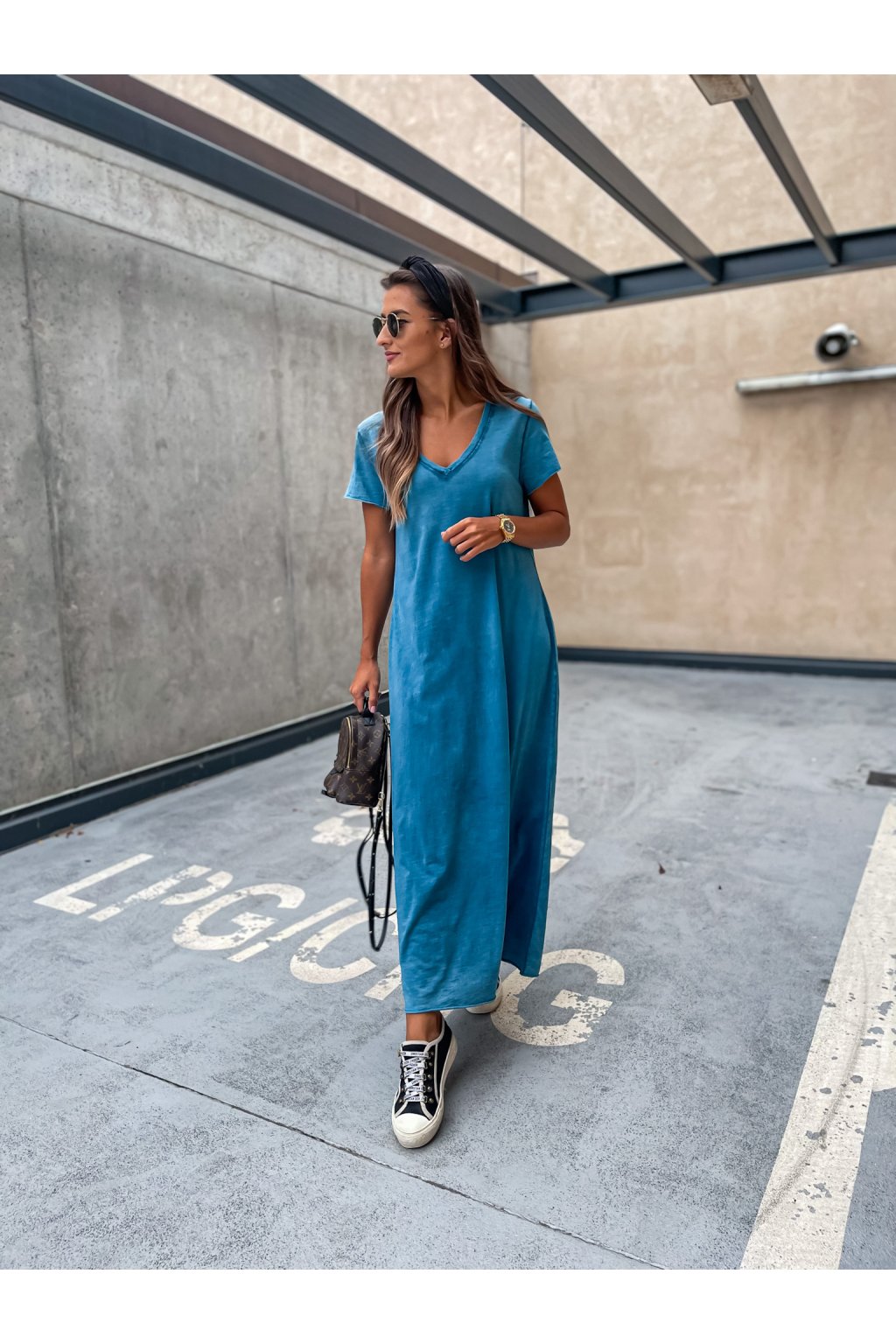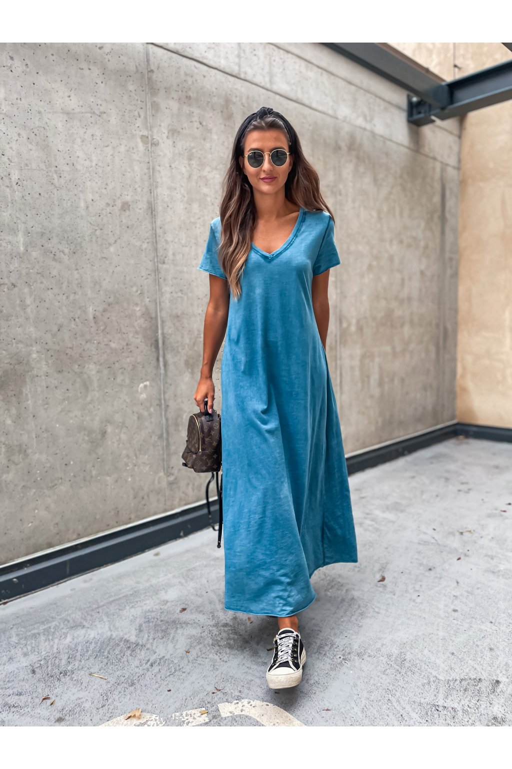 Stylové dámské šaty s výstřihem do V s nezakončeným spodním lemem a rukávy. Šaty jsou vzdušné a je možné je nakombinovat i na jaře a na podzim ke kožené nebo riflové bundě a vytvořit si tak pohodlný a stylový outfit. Hodí se jak k teniskám, tak pantoflím a na podzim k biker botám.