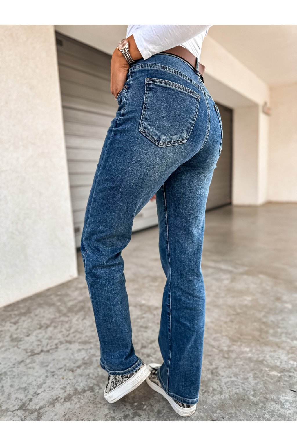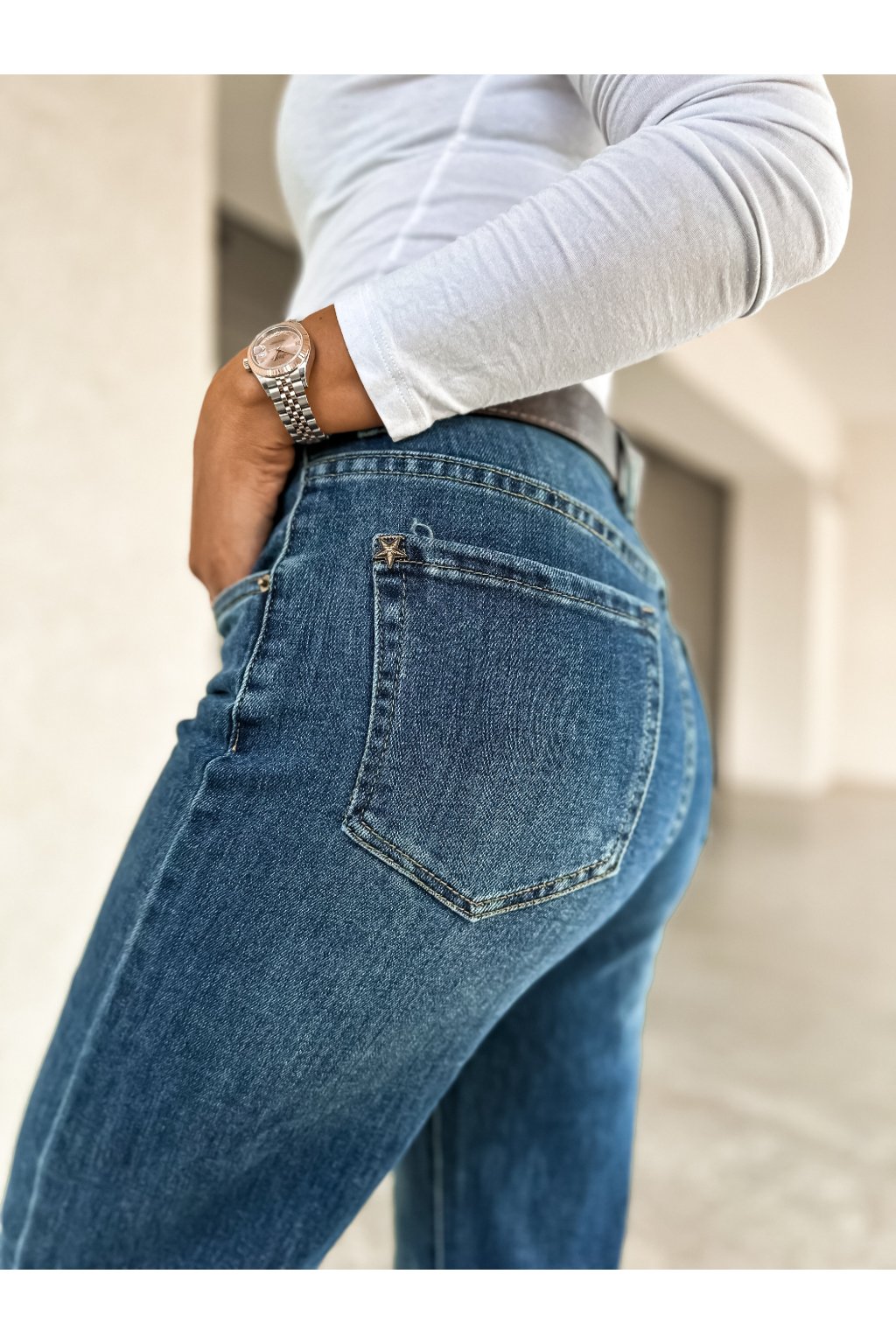 Stylové široké rifle v tmavě modré barvě s páskem. Rifle jsou pružné a velikosti odpovídají. Nakombinovat můžete s topy, mikinami nebo cardigany.