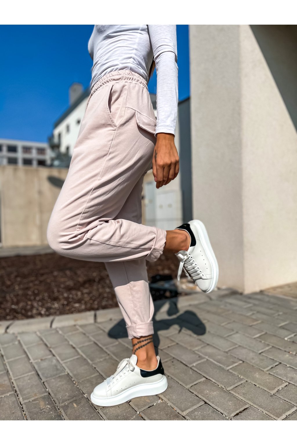 Dámské stylové teplákové kalhoty Dastin. Tepláčky mají falešnou kapsu na levé zadní straně a dvě postranní klasické kapsy. Můžte si je stáhnout v pase šňůrkami a je možné je nosit ohrnuté jako na fotce.