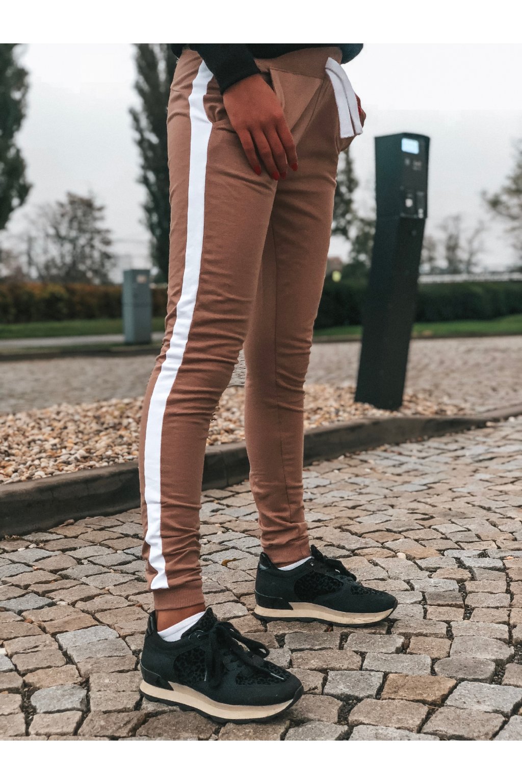 Stylové teplákové kalhoty s pruhem v barvě Caramel. Kalhoty mají gumu v pase, sedí na XS, S a menší M. Zkombinujte s některým z tričkem z naší nabídky. Tepláčky mají dvě přední kapsy. Produkt byl vybrán pečlivě, s láskou a důrazem na vysokou kvalitu materiálu.