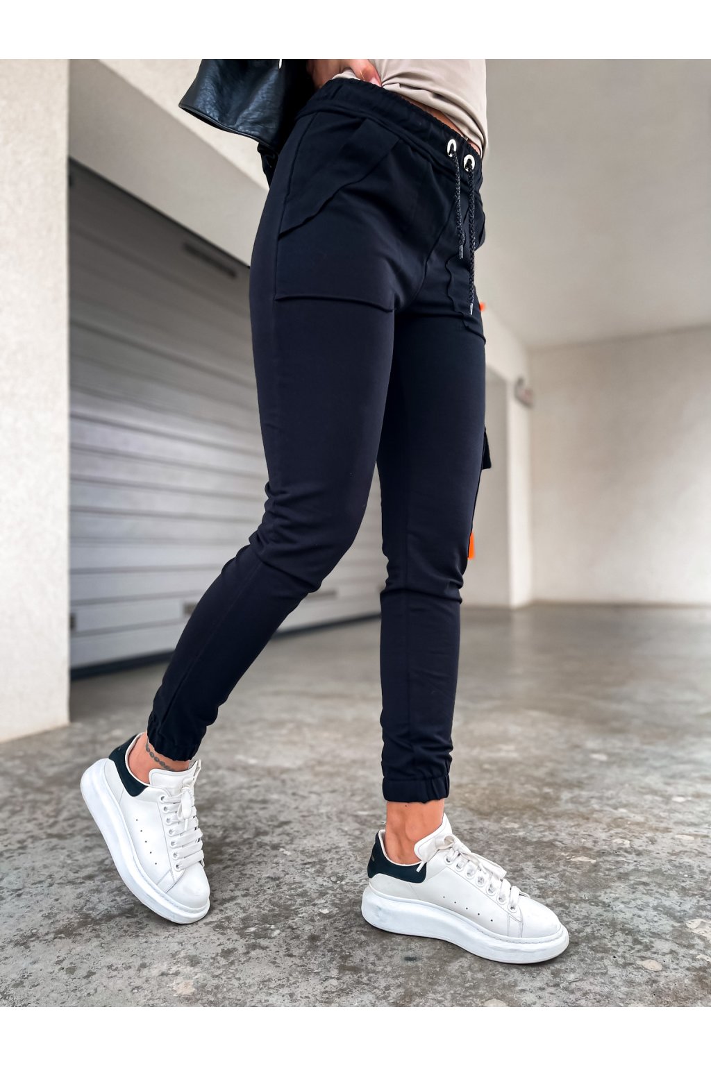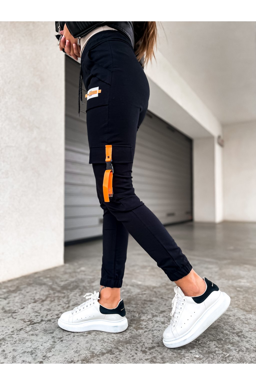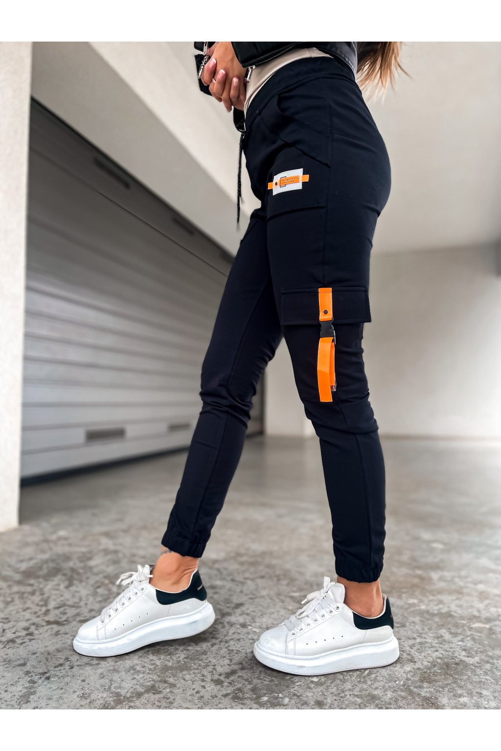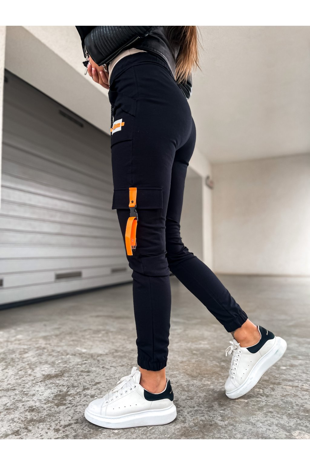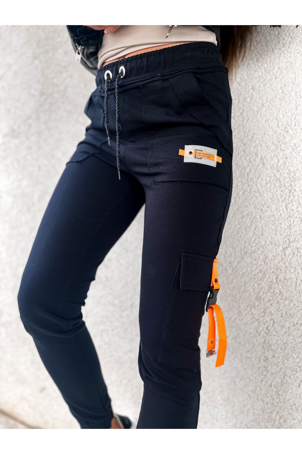 Dámské stylové tepláky s oranžovými doplňky. Tepláky mají kapsy po stranách a jednu kapsu na nohavici. Mají gumu v pase a dají se stahovat šňůrkami. Sedí opravdu skvěle a dělají krásnou postavu.
