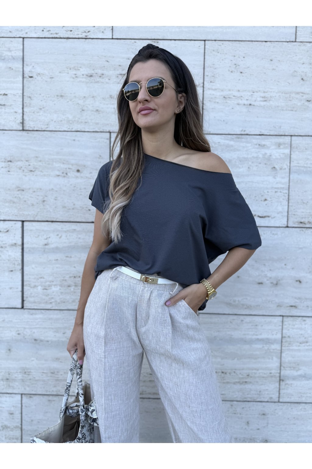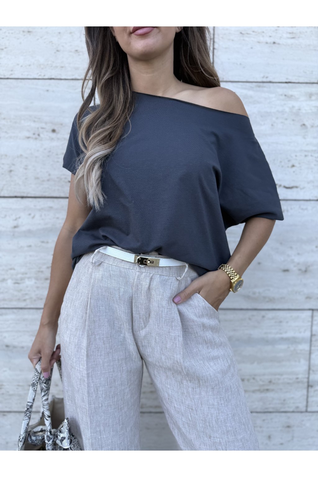 Stylové, dámské tričko s nezakončenými prvky - rukáv, u krku i spodní část. Tričko je možné nosit klasicky na obou ramenách nebo s jedním spadeným. Za nás velmi povedený a oblíbený kousek.