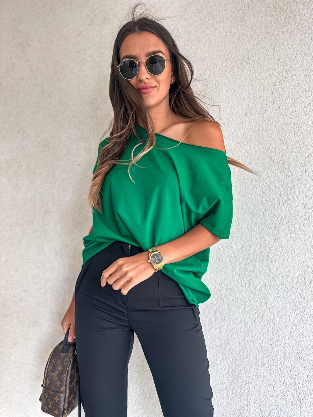 Stylové, dámské tričko s nezakončenými prvnky - rukáv, u krku i spodní část. Tričko je možné nosit klasicky na obou ramenách nebo s jedním spadeným. Za nás velmi povedený a oblíbený kousek.