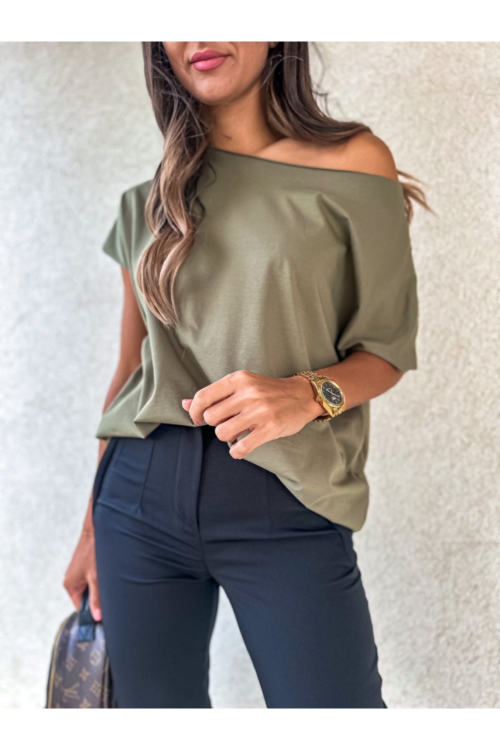 Stylové, dámské tričko s nezakončenými prvnky - rukáv, u krku i spodní část. Tričko je možné nosit klasicky na obou ramenách nebo s jedním spadeným. Za nás velmi povedený a oblíbený kousek.