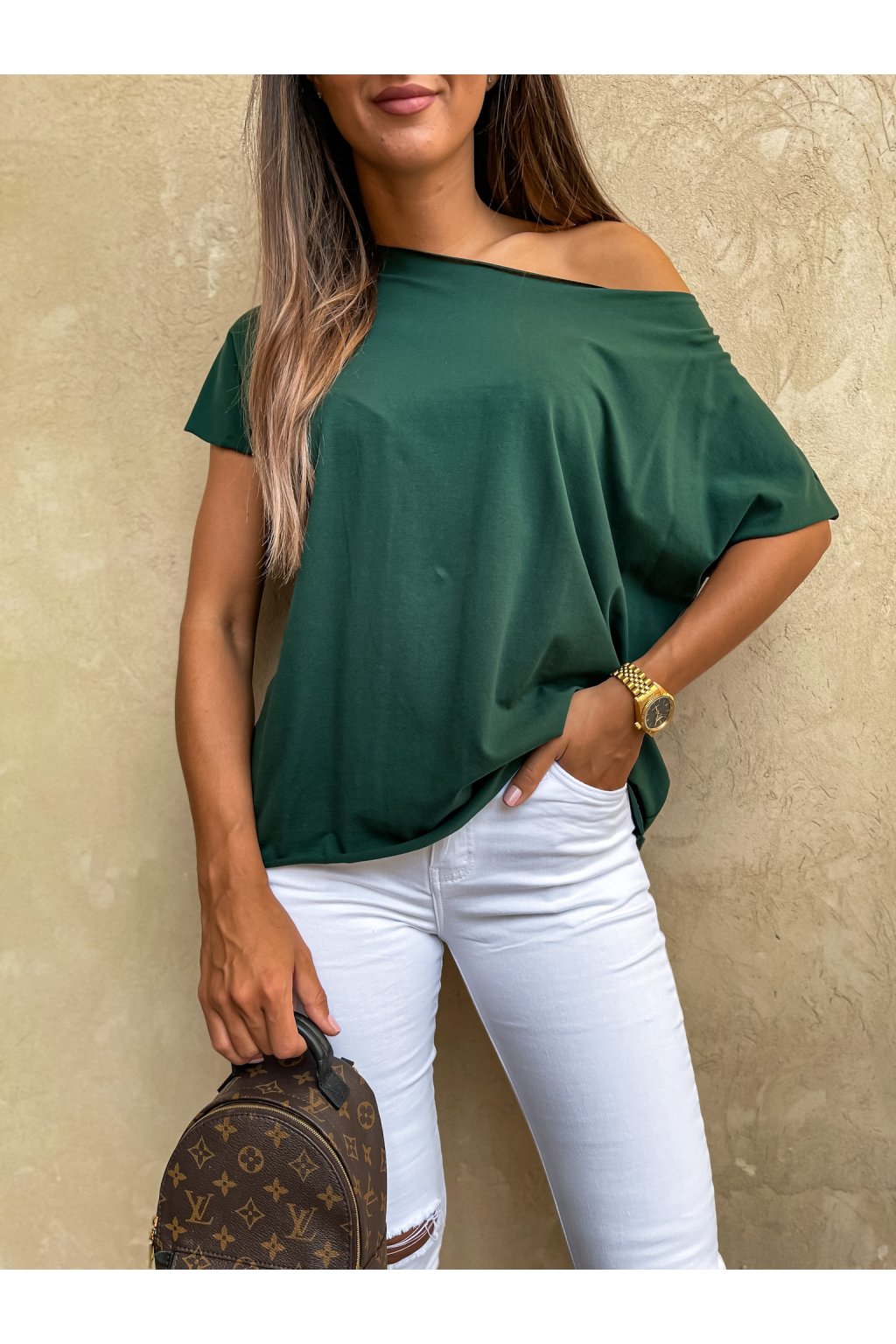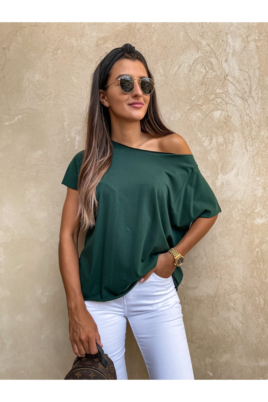 Stylové, dámské tričko s nezakončenými prvnky - rukáv, u krku i spodní část. Tričko je možné nosit klasicky na obou ramenách nebo s jedním spadeným. Za nás velmi povedený a oblíbený kousek.