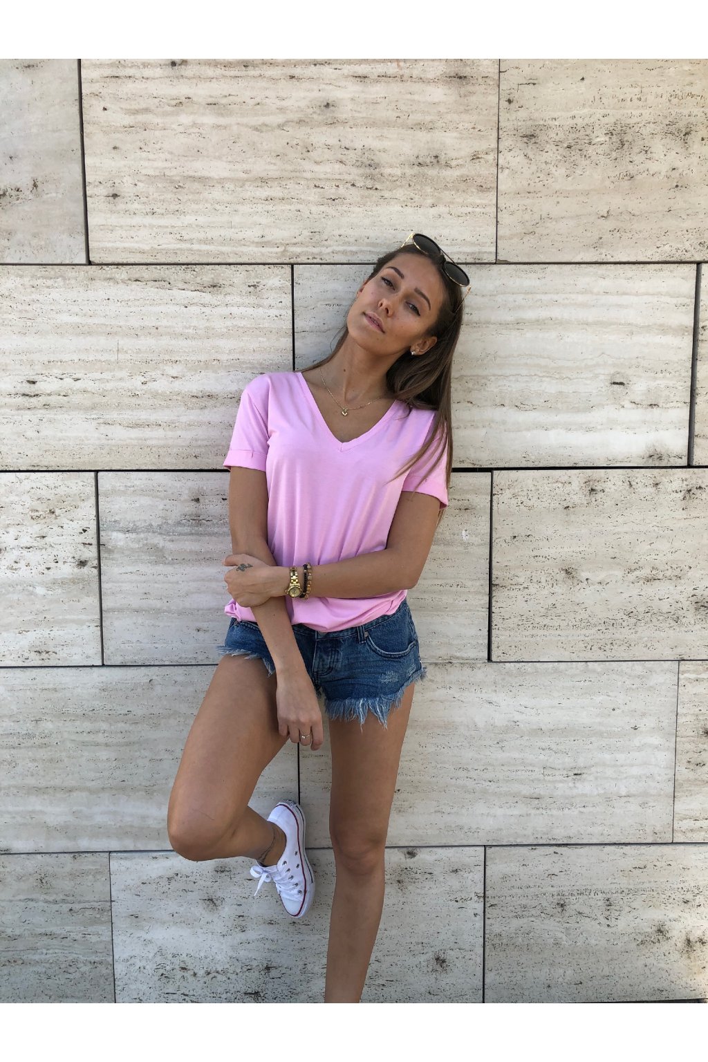 Luxusní dámské tričko V neck Pink vyrobeno z bambusové textilie pod značkou našeho eshopu “ESHOPAT”. Jsme na něj náležitě hrdí.