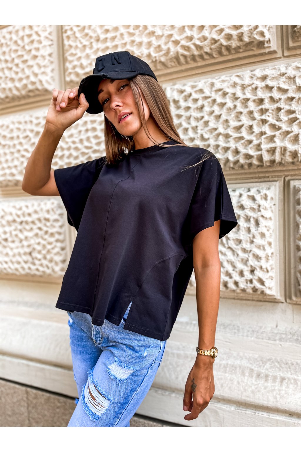 Stylové dámské tričko s rozparky po obou stranách a pruhem uprostřed trička (pouze zepředu). Originální basic kousek.