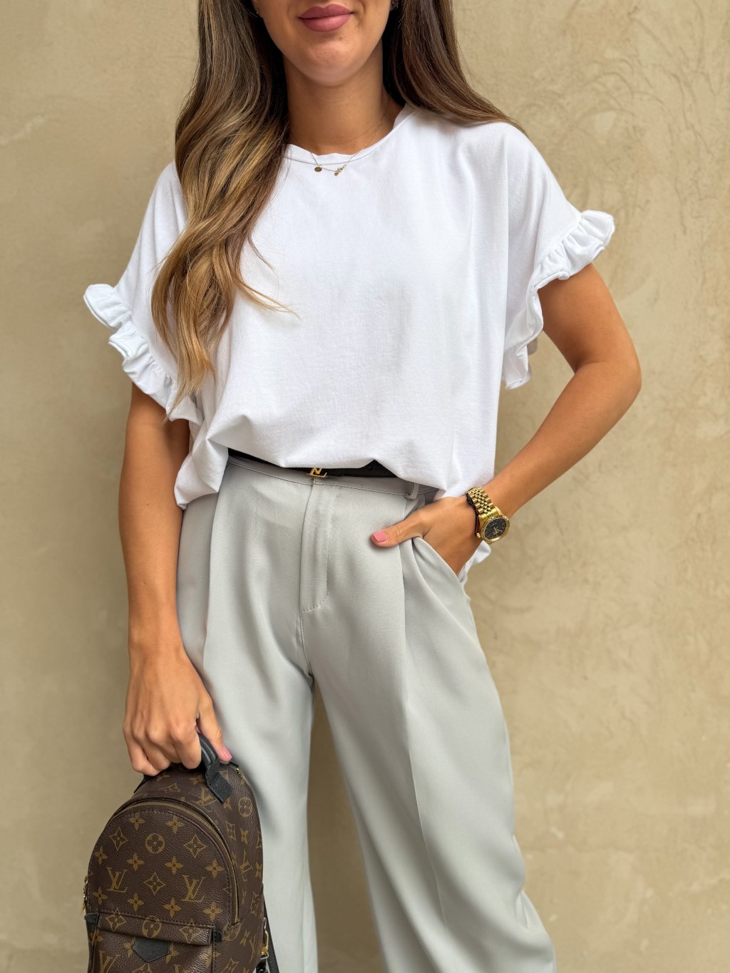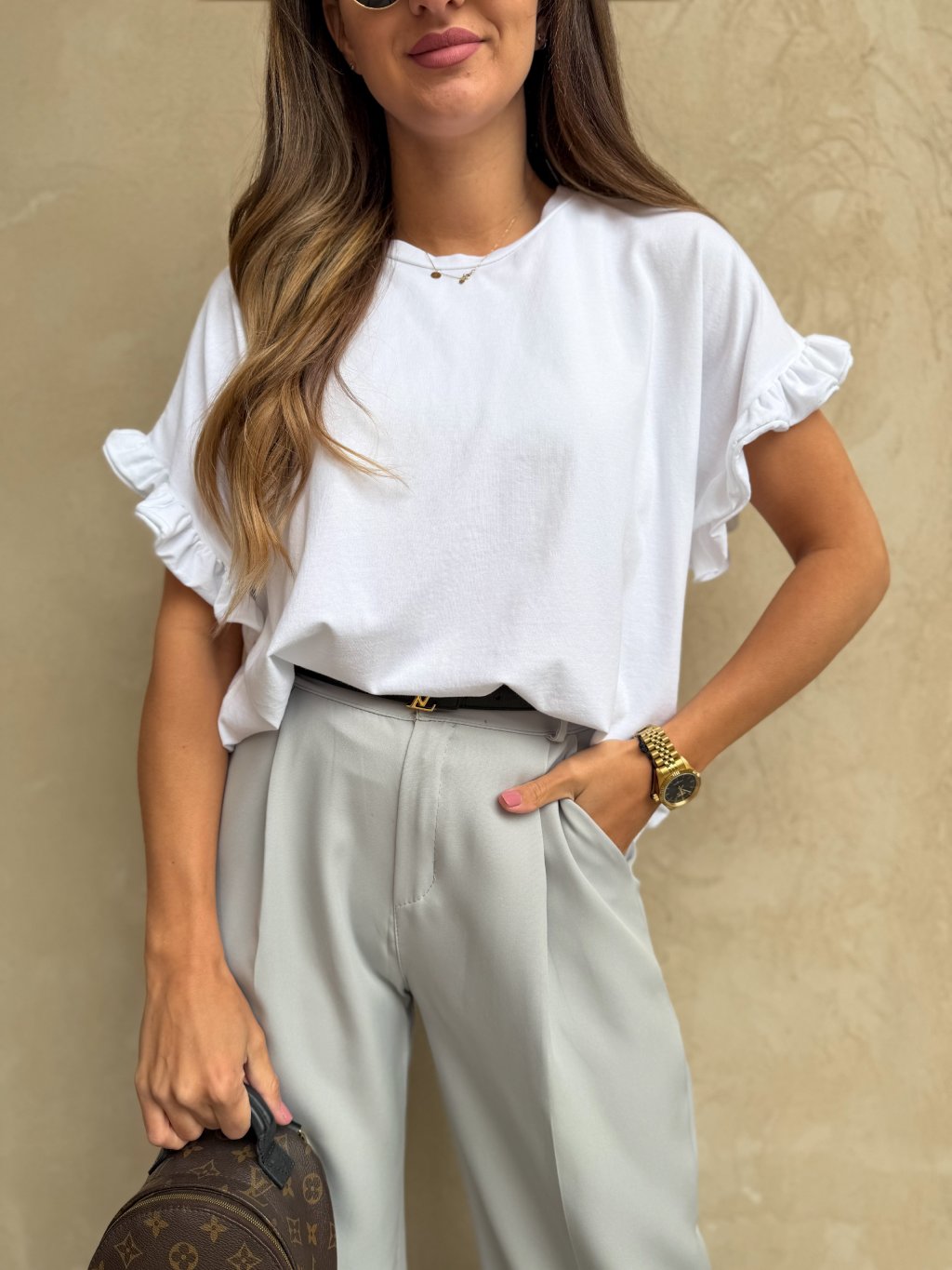 Lehké, příjemné tričko volného střihu ze 100% bavlny s volánkovým rukávem, které osvěží váš každý outfit.