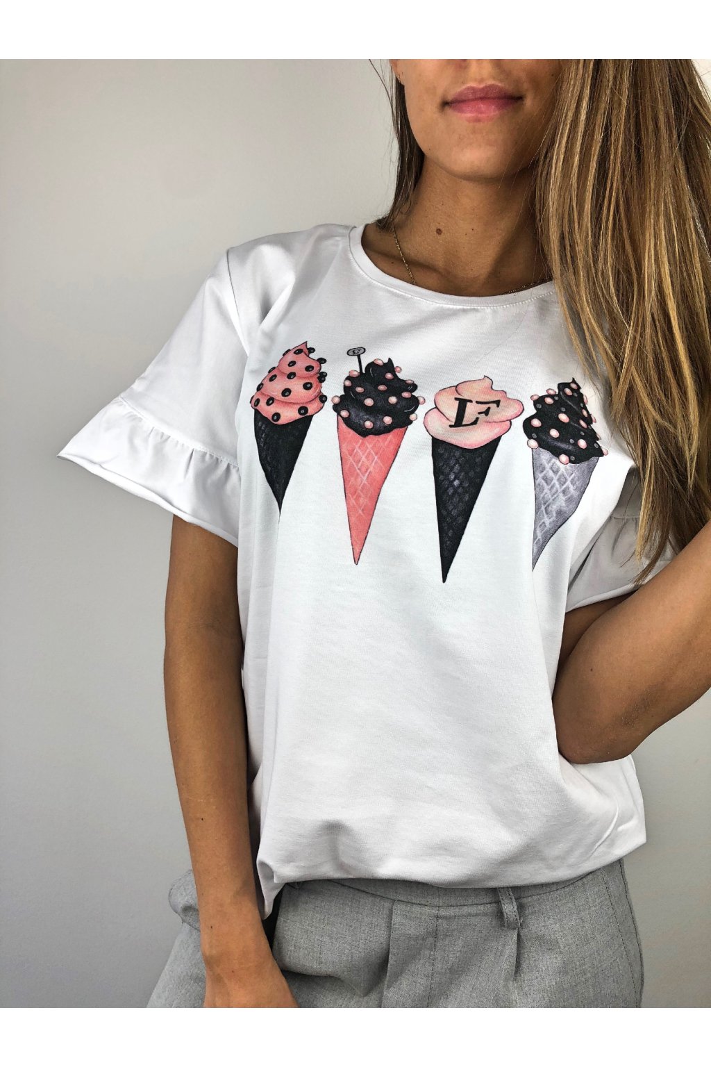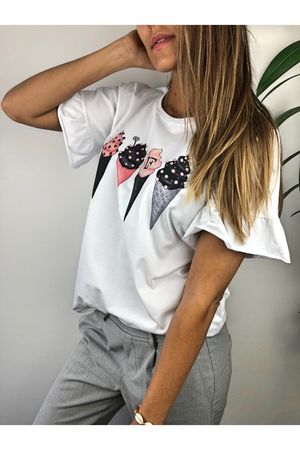 Dámské stylové tričko s volánky s potiskem v barvě White. Tričko je velmi pěkně střiženo a má pěkně zakončené rukávy.
