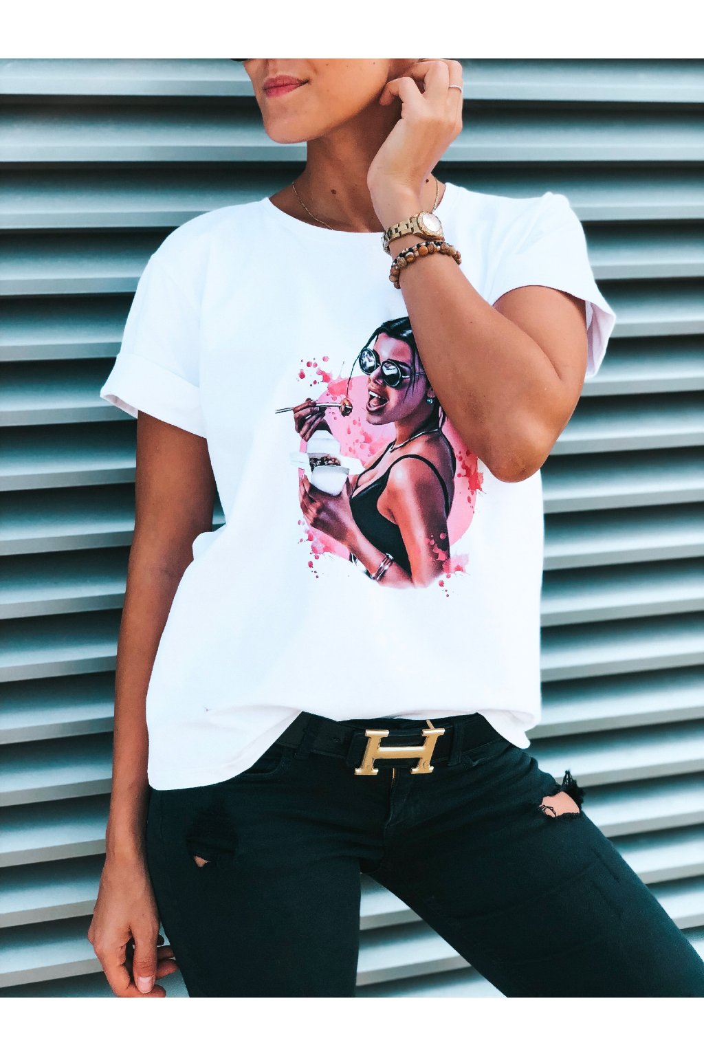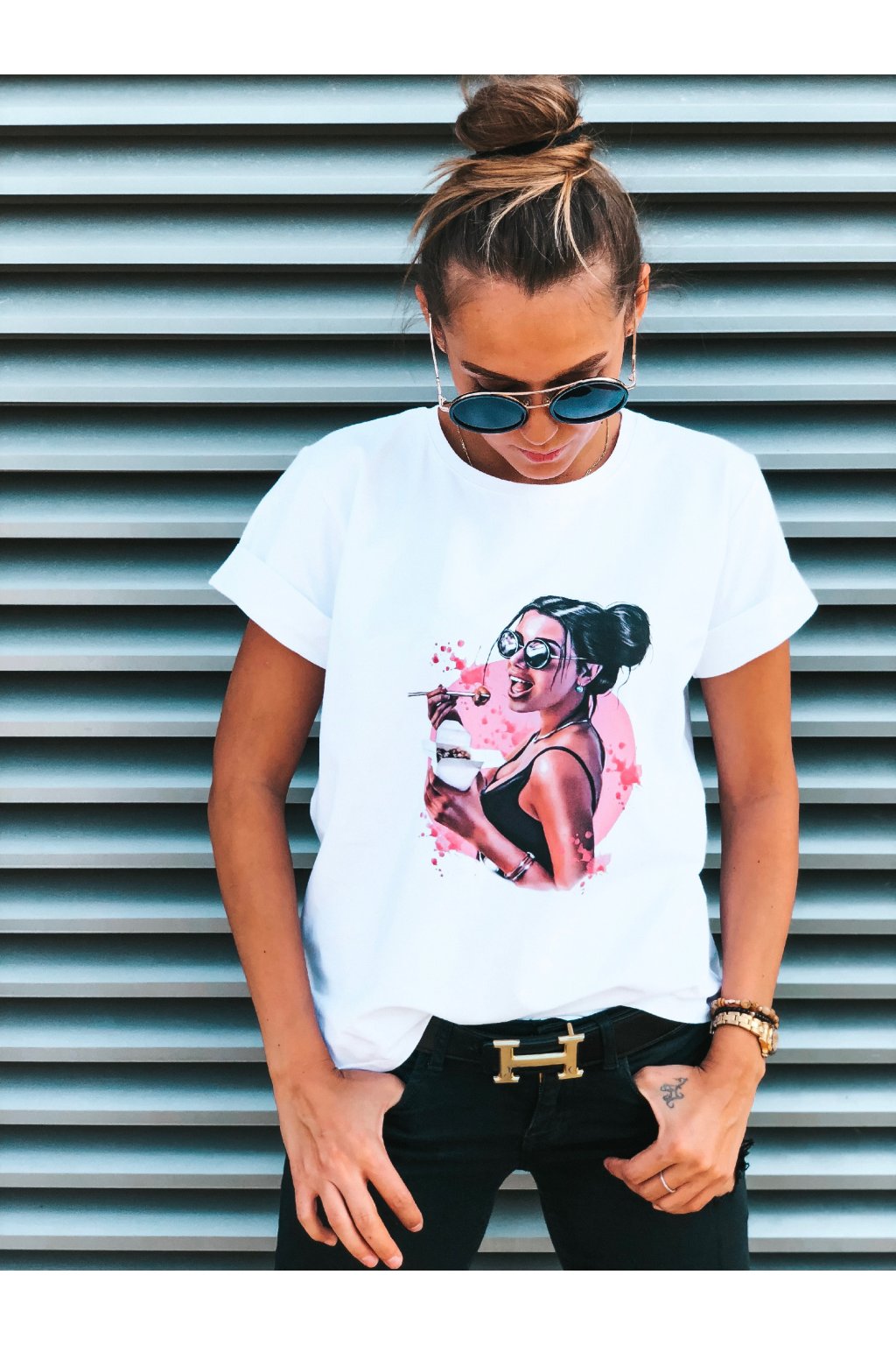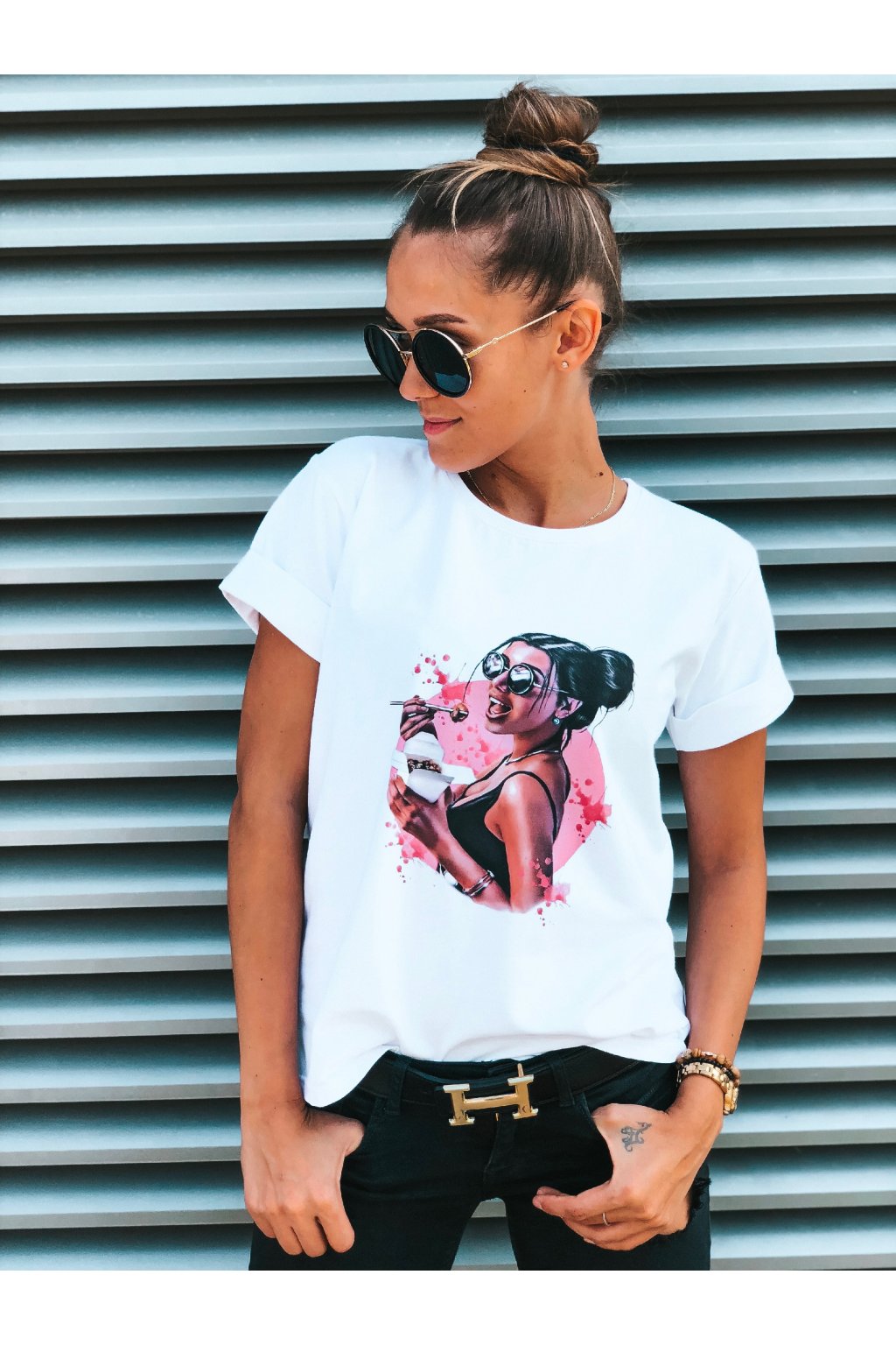 Dámské stylové tričko s potiskem v barvě White. Tričko je velmi pěkně střiženo a má pěkně zakončené rukávy.