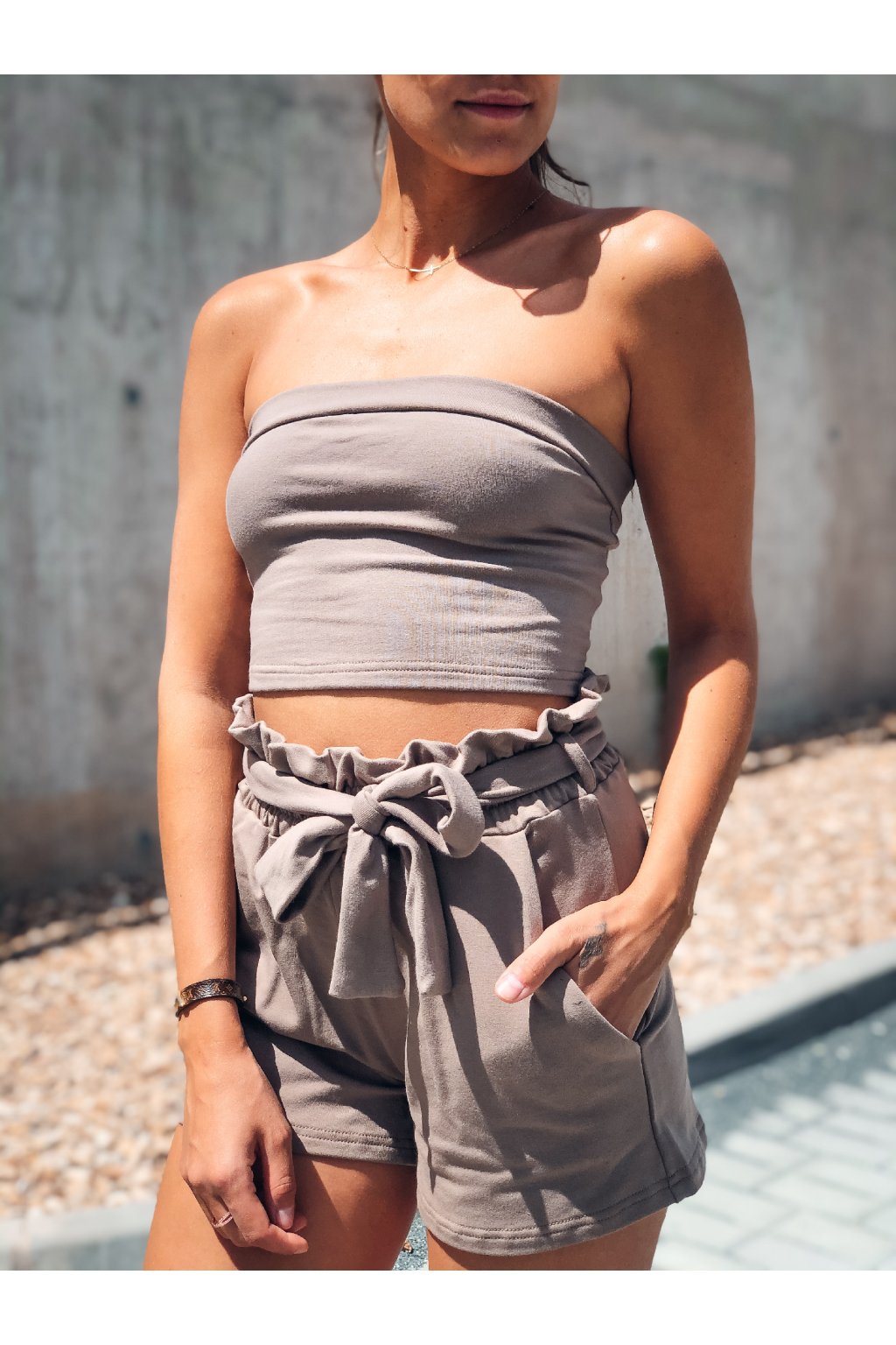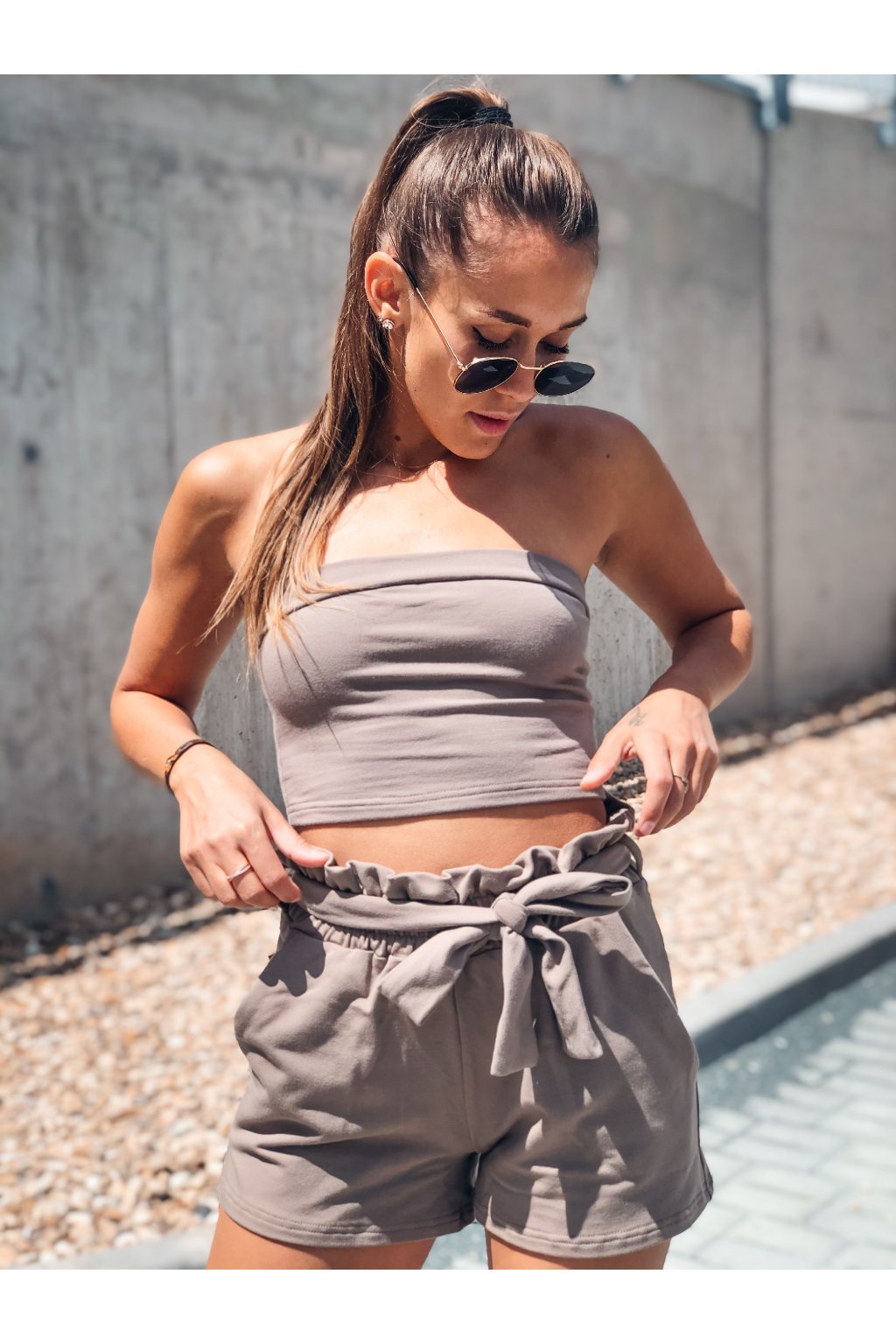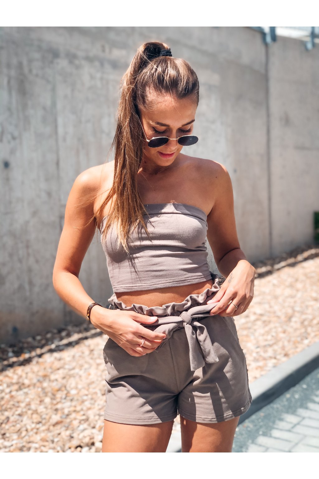 Stylový komplet Lady z příjemné teplákoviny. Kraťásky jsou do pasu na gumu a jsou doplněny o pásek stejné barvy.