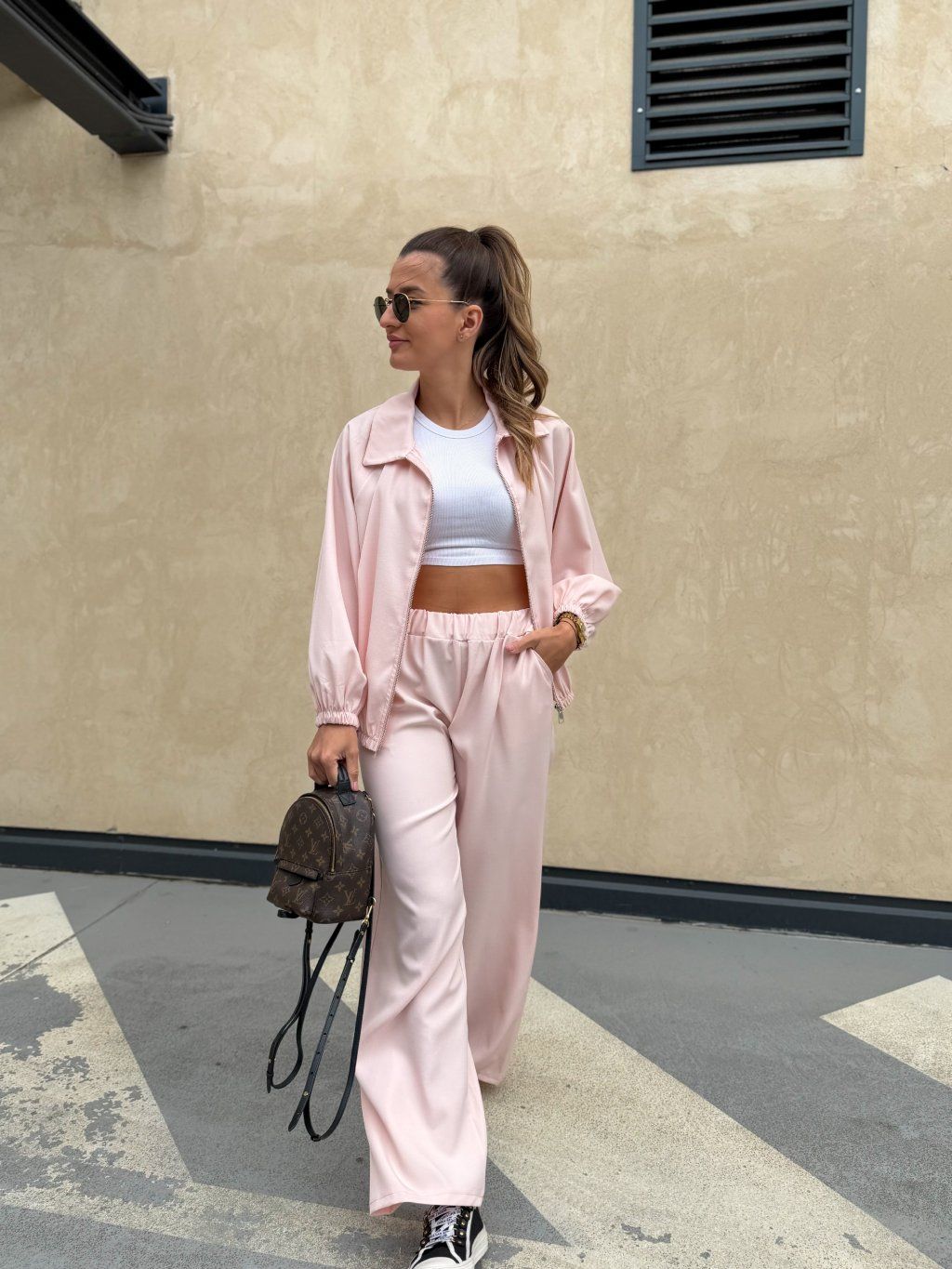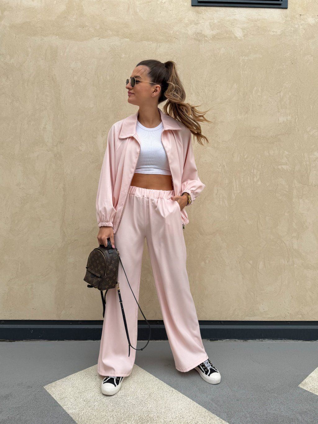 Luxusní dámský komplet složený z bomberu na zip a kalhot s širokými nohavicemi s gumou v pase. Kousky je možné nosit i jednotlivě. Komplet je z lehkého příjemného materiálu s podílem elastanu a je možné jej nakombinovat v rámci sportovního i elegantního outfitu. Originální a pohodlný kousek na každodenní i celodenní nošení.