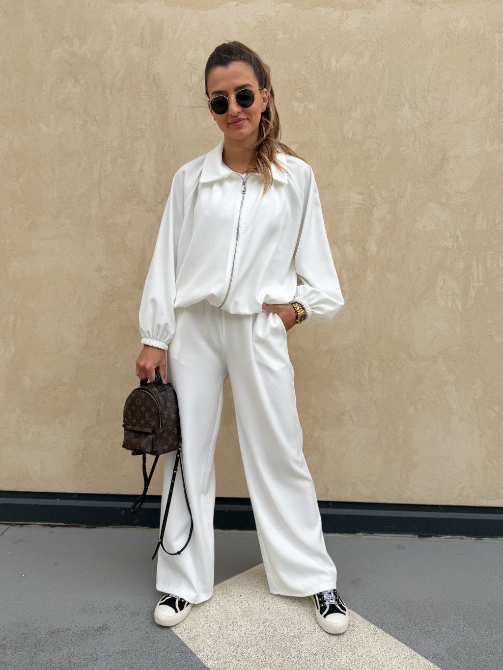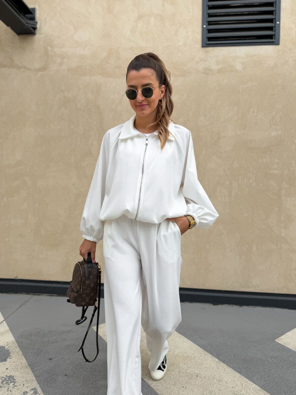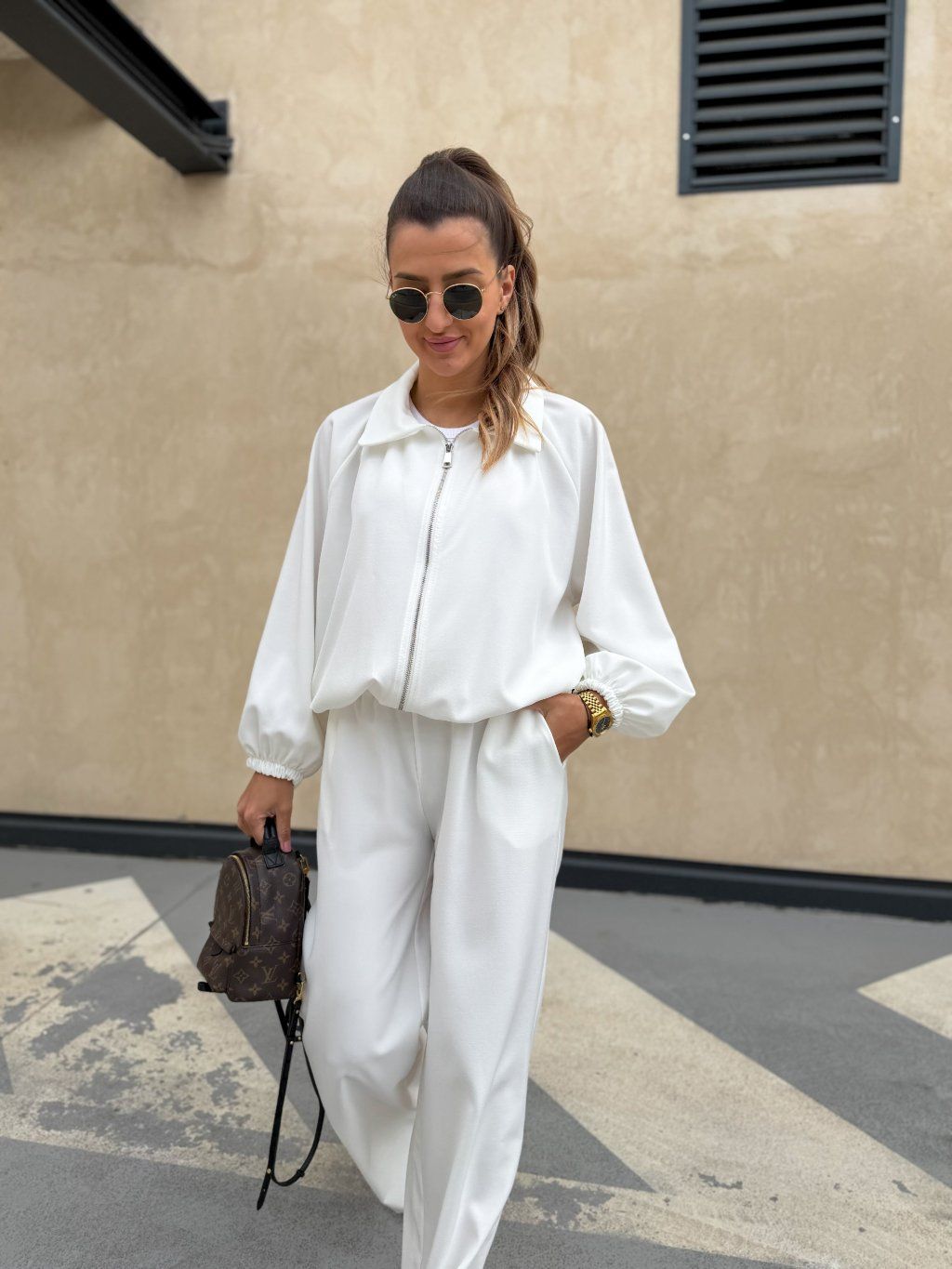 Luxusní dámský komplet složený z bomberu na zip a kalhot s širokými nohavicemi s gumou v pase. Kousky je možné nosit i jednotlivě. Komplet je z lehkého příjemného materiálu s podílem elastanu a je možné jej nakombinovat v rámci sportovního i elegantního outfitu. Originální a pohodlný kousek na každodenní i celodenní nošení.