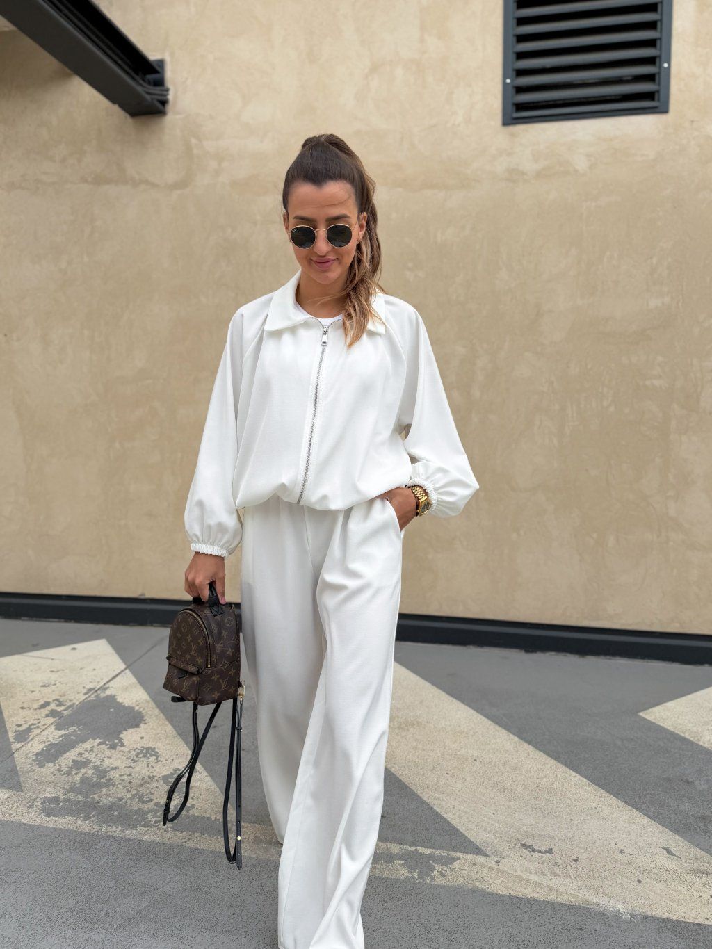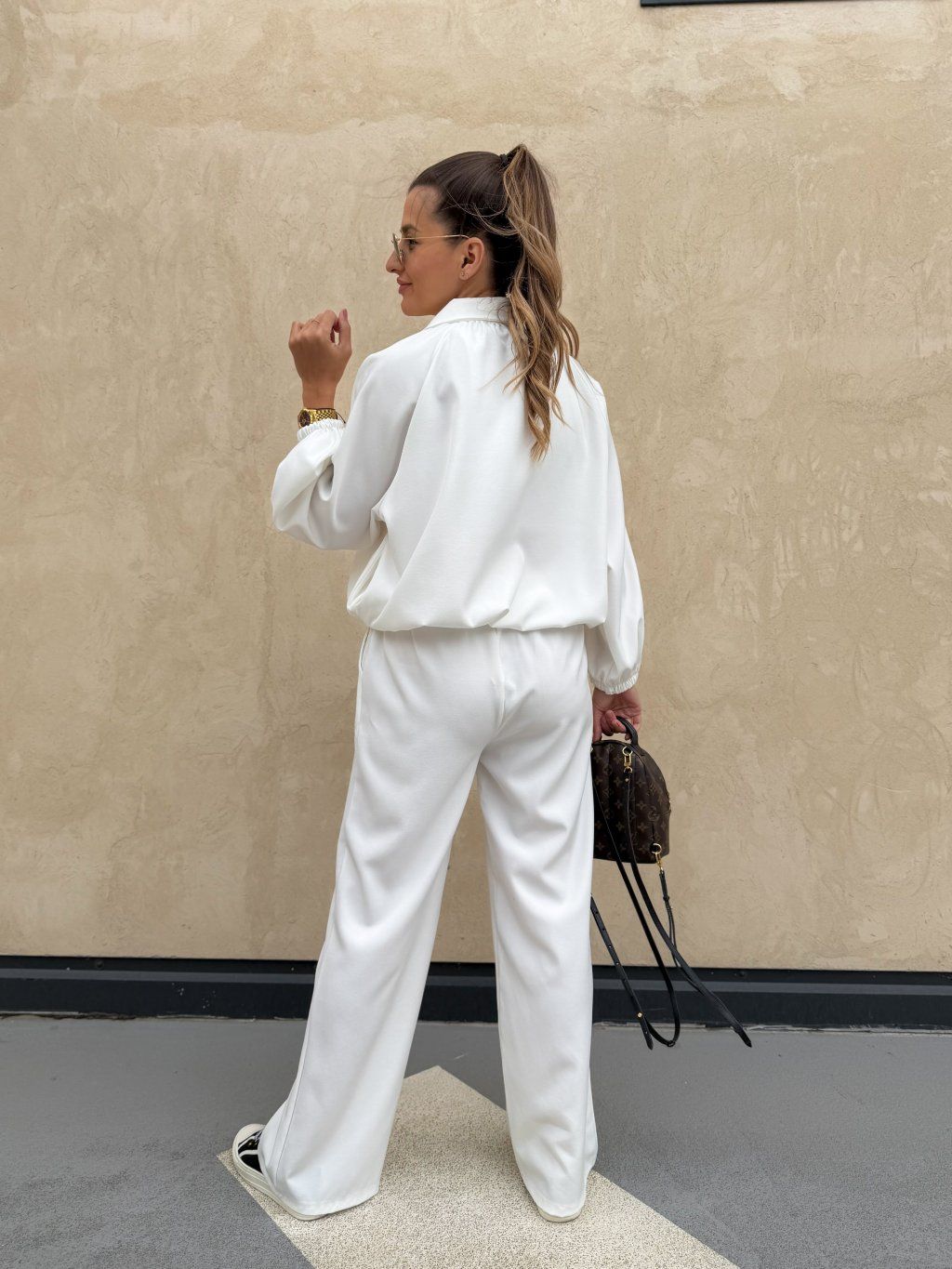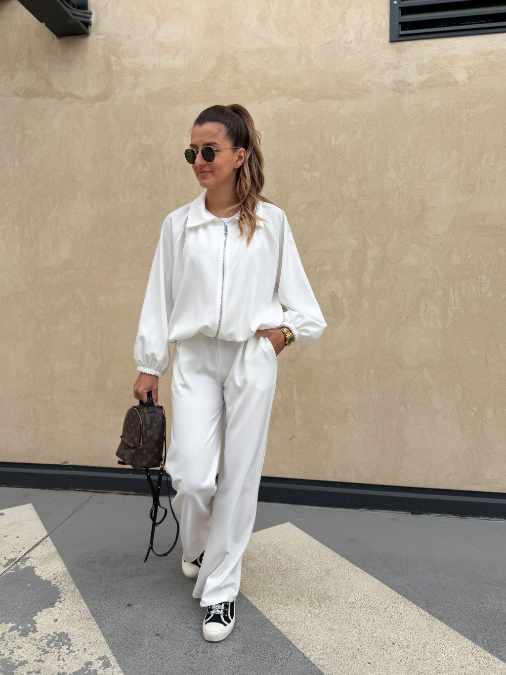 Luxusní dámský komplet složený z bomberu na zip a kalhot s širokými nohavicemi s gumou v pase. Kousky je možné nosit i jednotlivě. Komplet je z lehkého příjemného materiálu s podílem elastanu a je možné jej nakombinovat v rámci sportovního i elegantního outfitu. Originální a pohodlný kousek na každodenní i celodenní nošení.