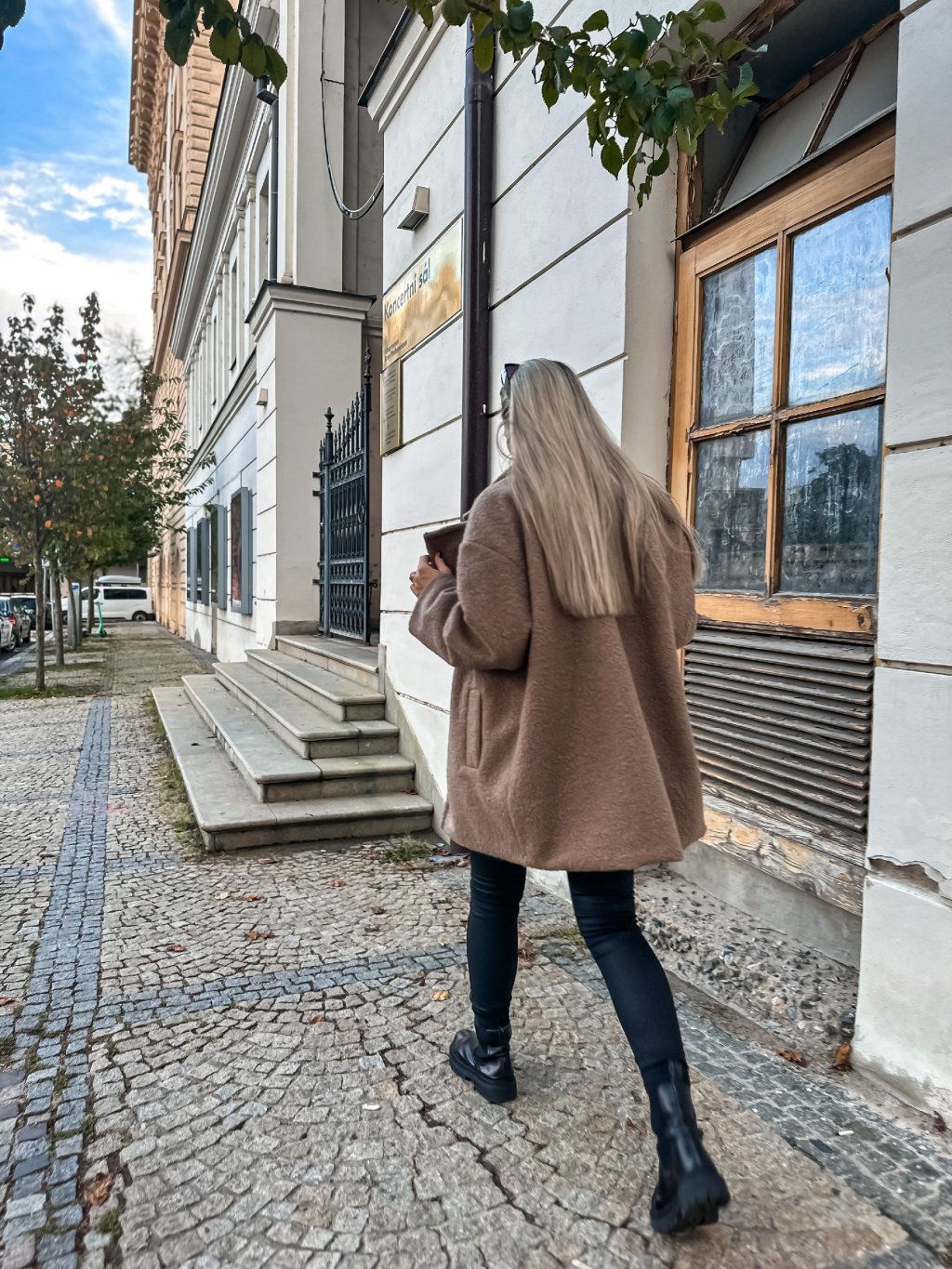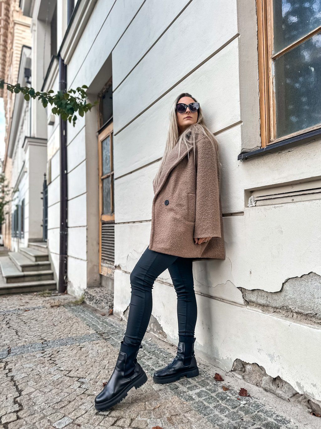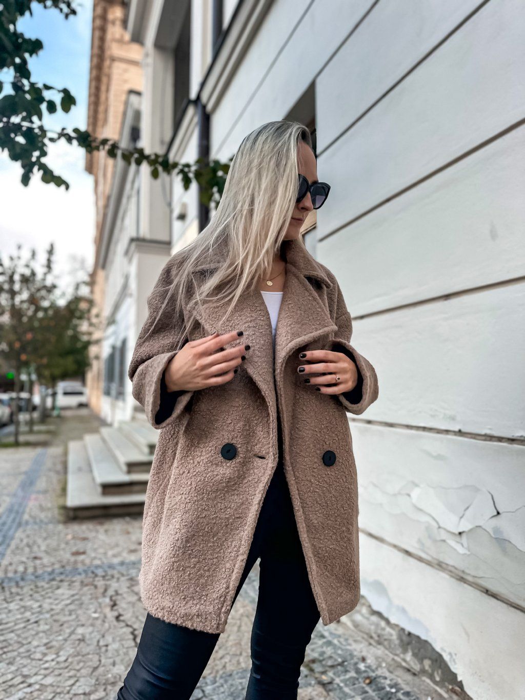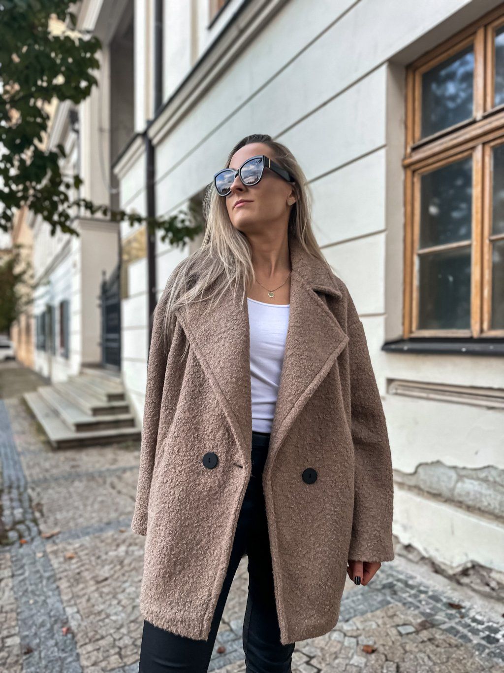 Stylový dámský oversize kabát s klopami do špičky, dlouhým rukávem, s předními kapsami a předním zapínáním na knoflíky.