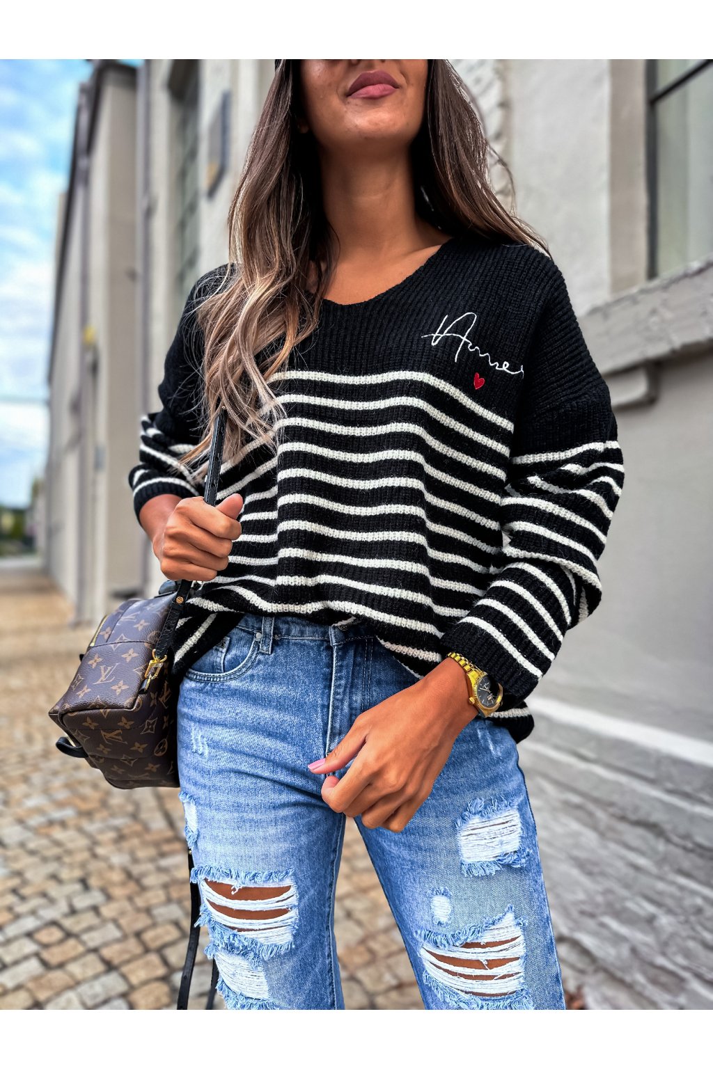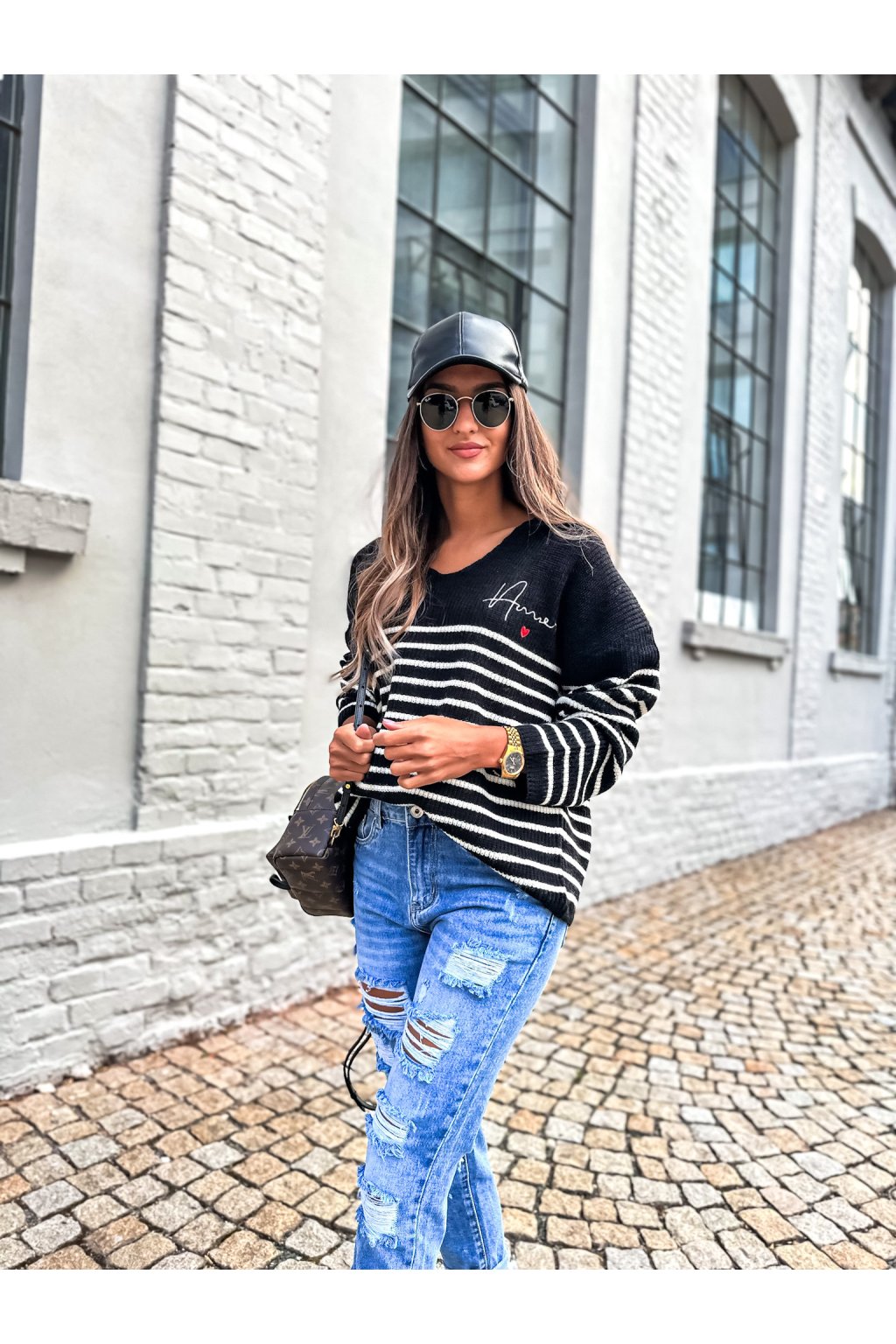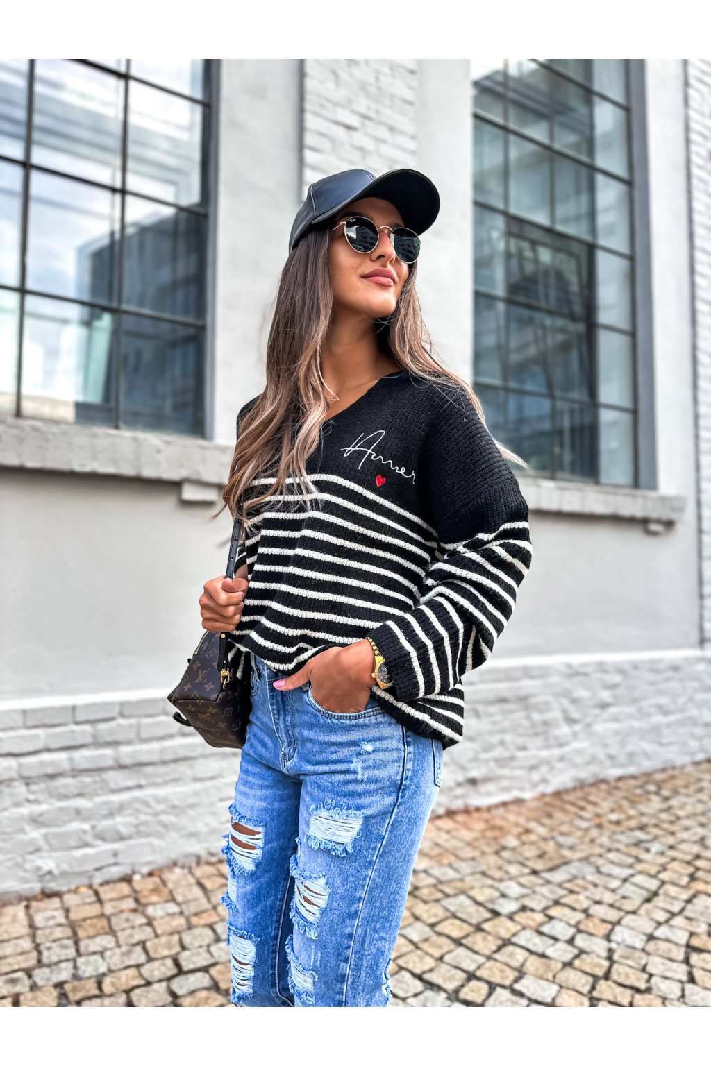 Stylový dámský svetr s pruhy a vyšitým nápisem se srdíčkem na levé straně. Stylový kousek, který nakombinujete jak k riflím, tak sukni, kalhotovým kraťskům. Svetr je lehce oversize. Opravdu velmi povedený a pohodlný kousek, který si zamilujete.
