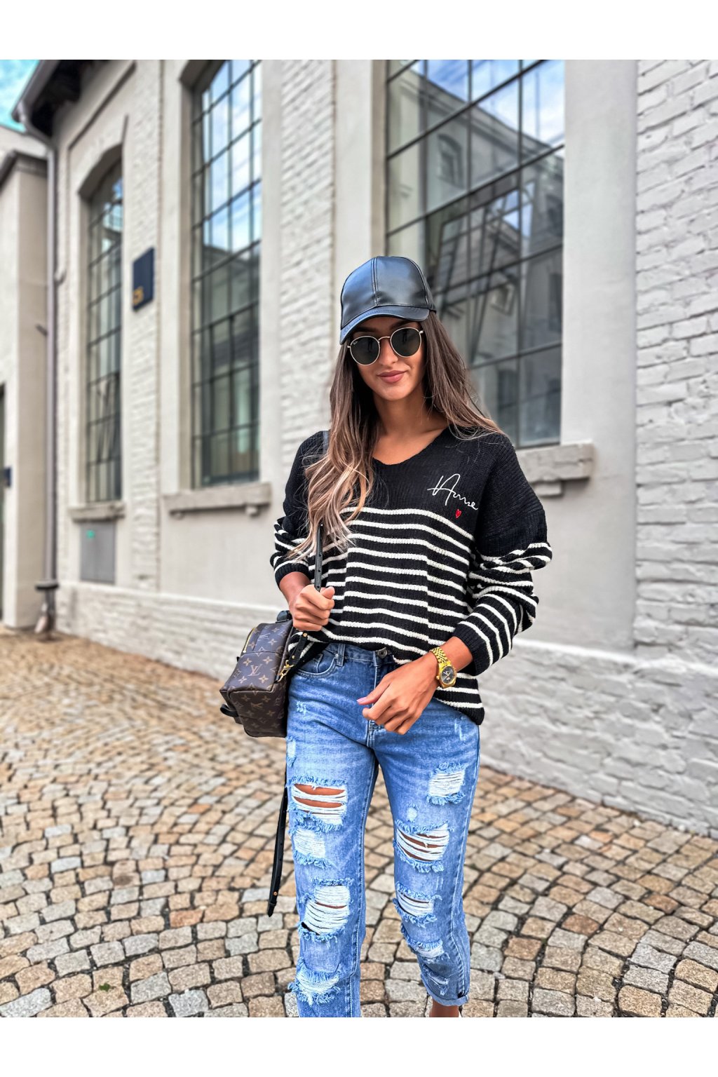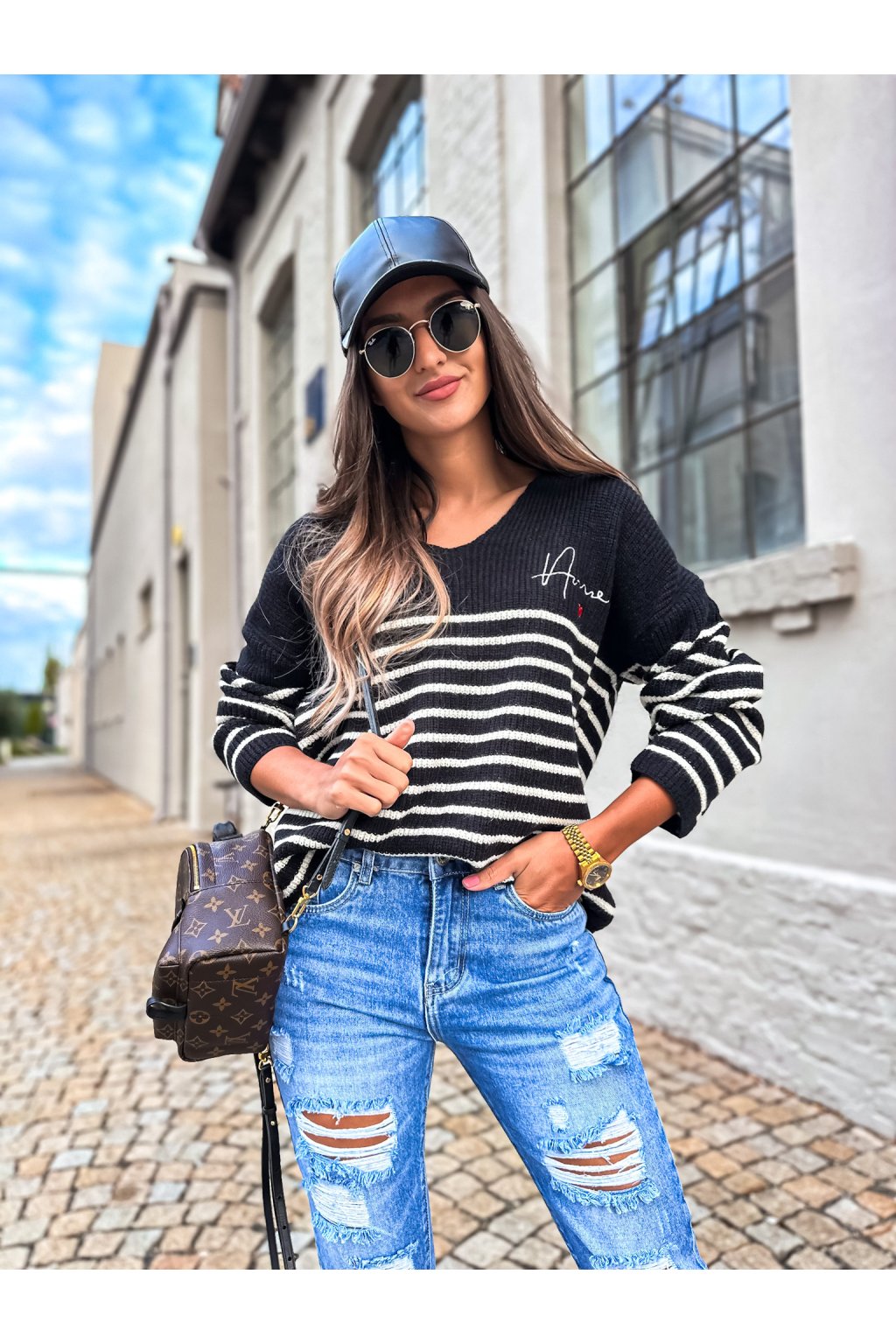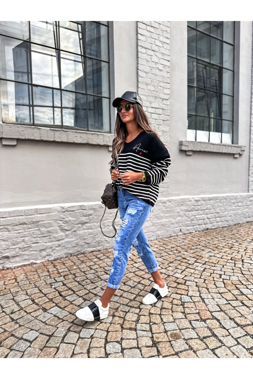 Stylový dámský svetr s pruhy a vyšitým nápisem se srdíčkem na levé straně. Stylový kousek, který nakombinujete jak k riflím, tak sukni, kalhotovým kraťskům. Svetr je lehce oversize. Opravdu velmi povedený a pohodlný kousek, který si zamilujete.
