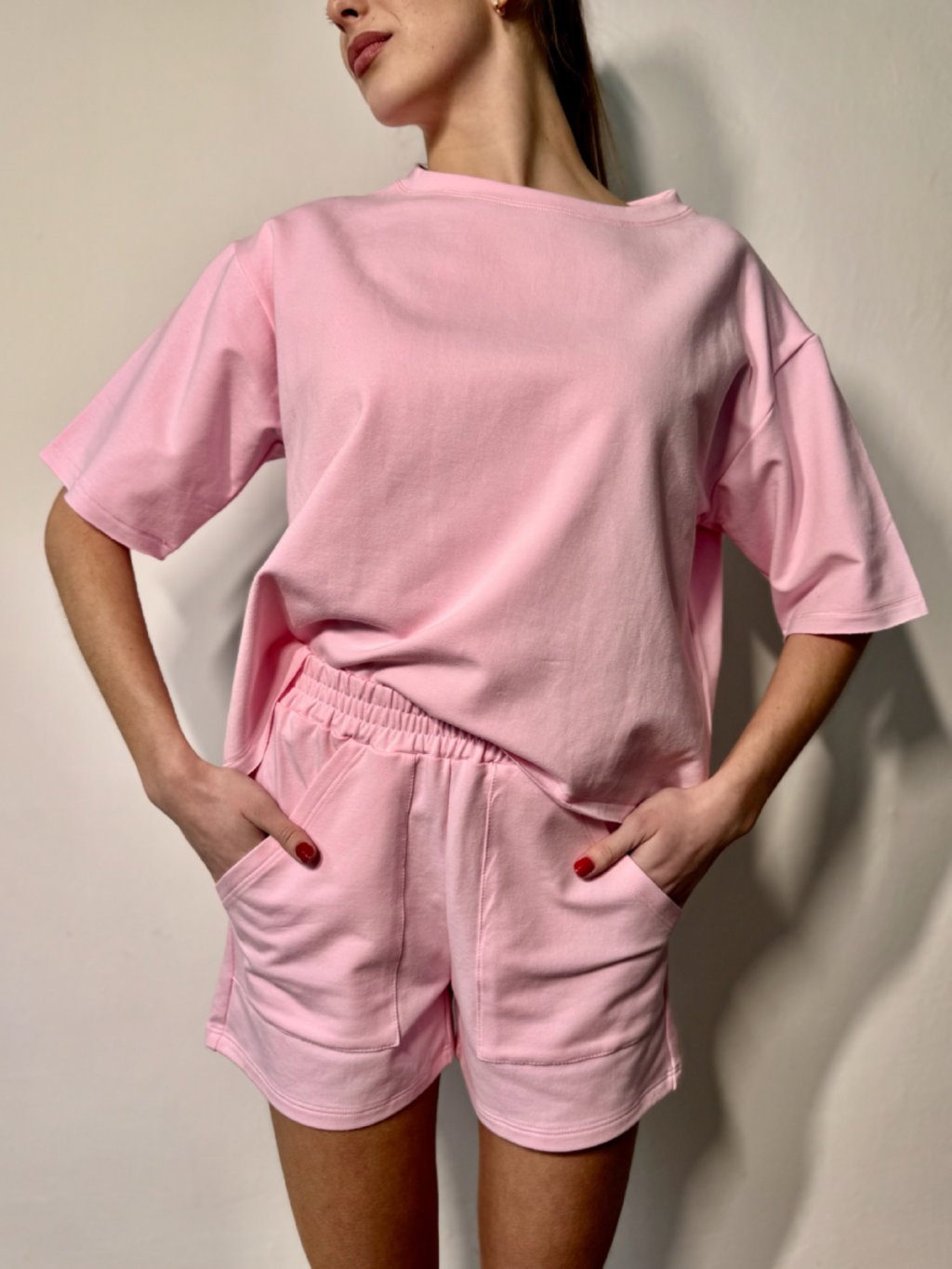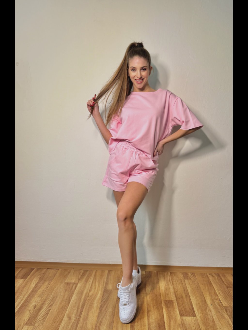 Stylový teplákový komplet jasné krásné barvy Summer se skládá z kraťasů s gumou v pase a kapsami a trička s krátkým rukávem. Obojí ze stejného, tenkého teplákového materiálu. Lze nosit i zvlášť.