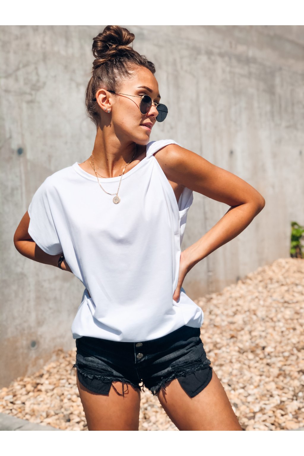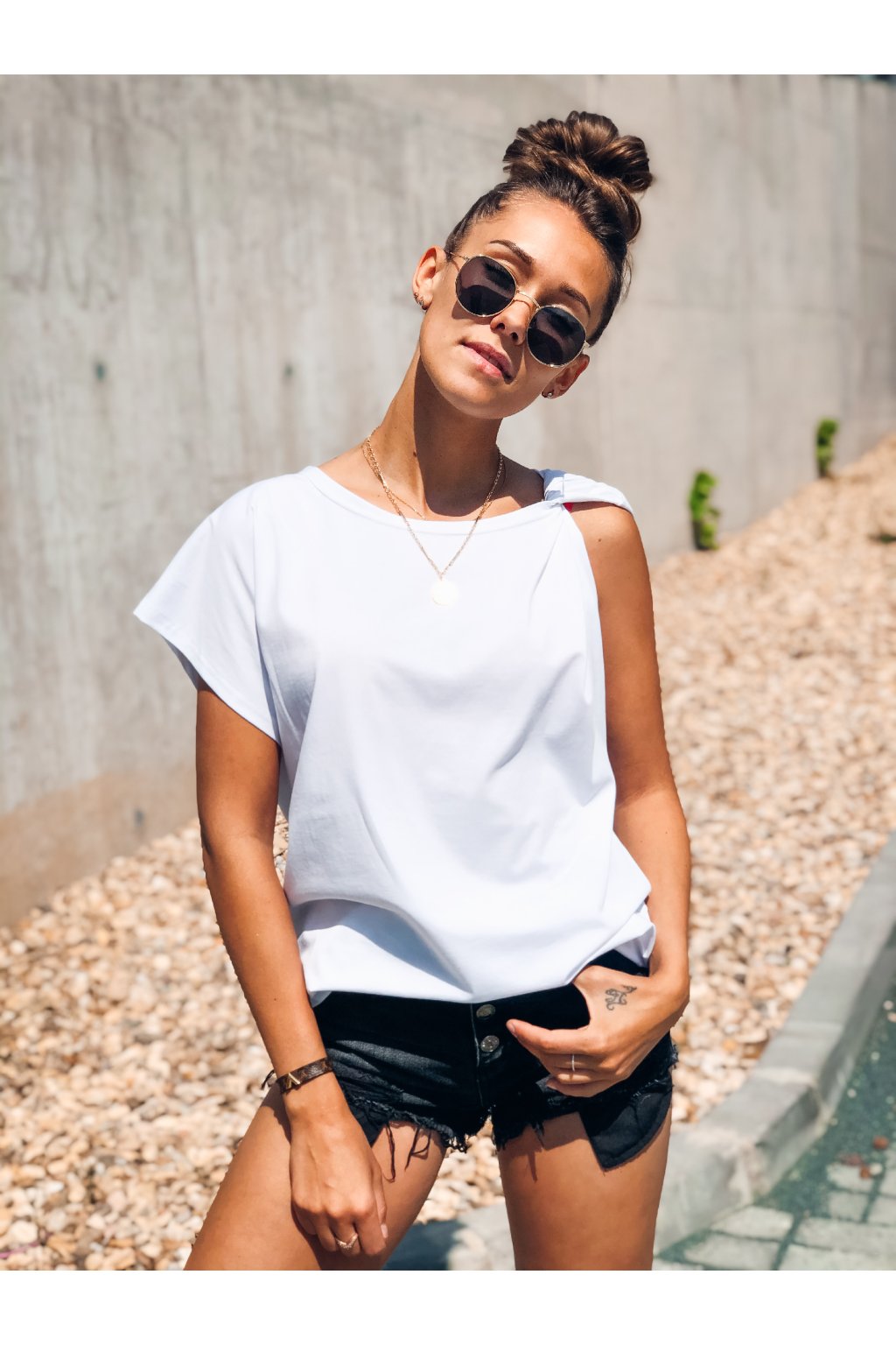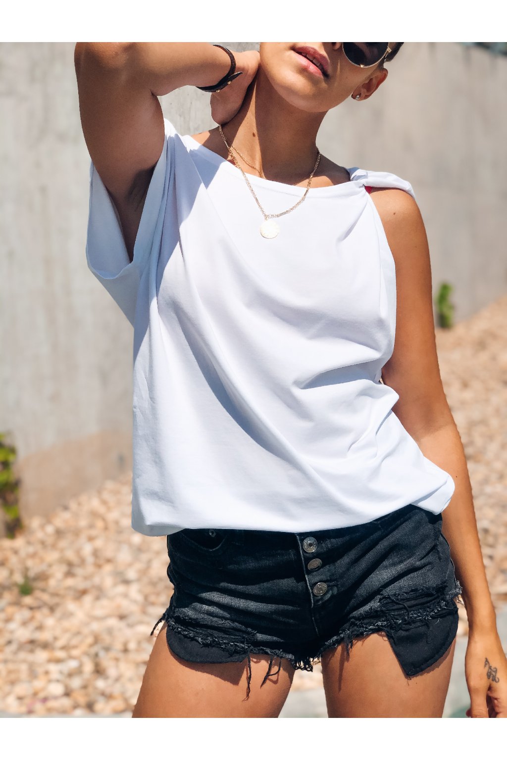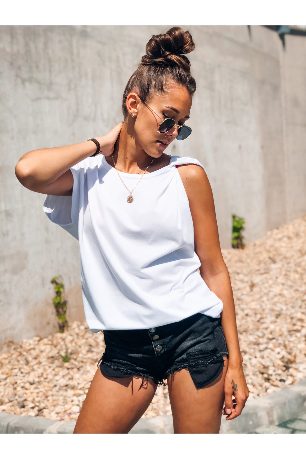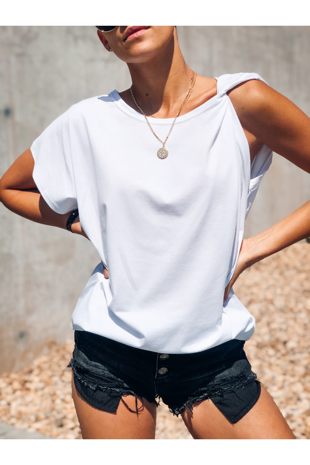 Luxusní top Malibu. Tričko má na jedné straně klasický rukáv a na druhé zauzlený rukáv. Originální kousek, který oživí jakýkoliv outfit. Velmi příjemný materiál, ideální na léto.