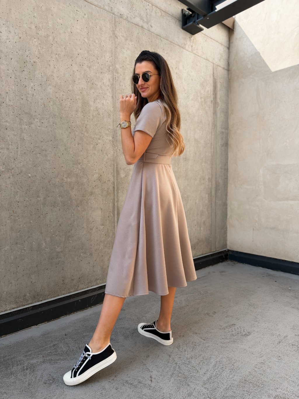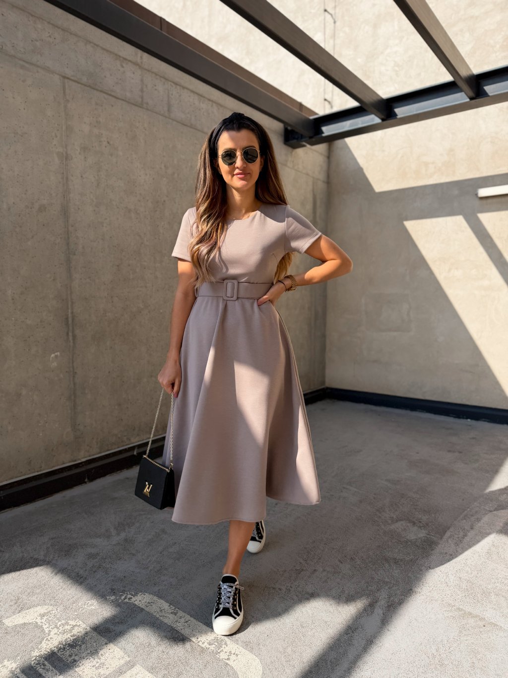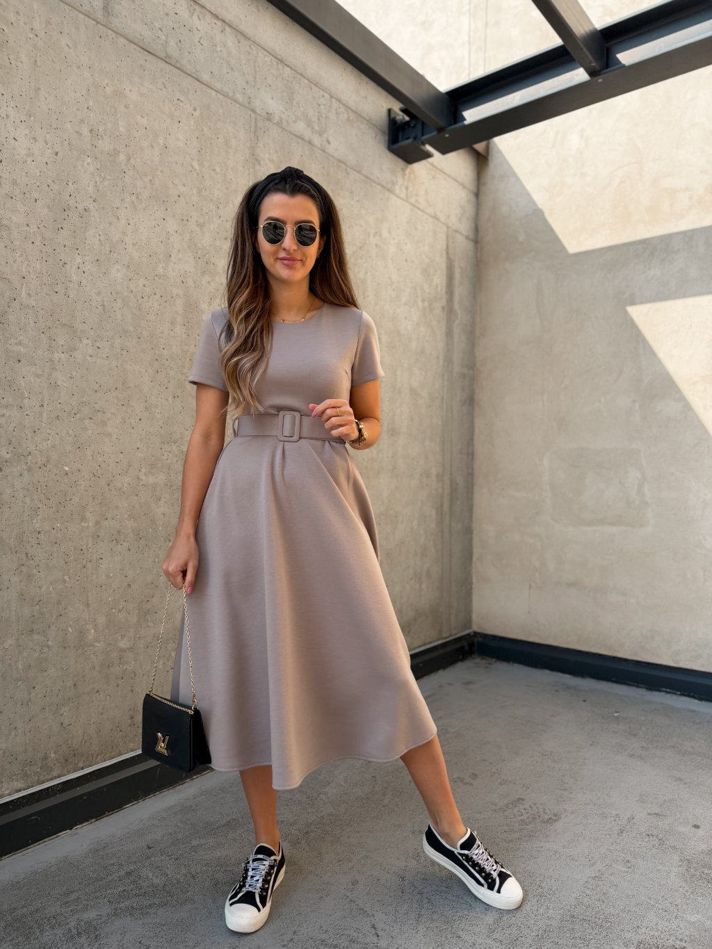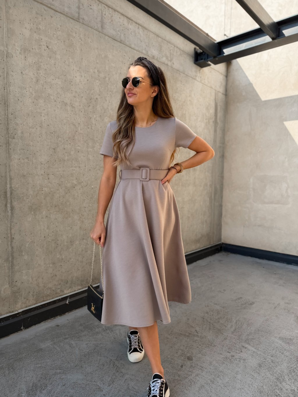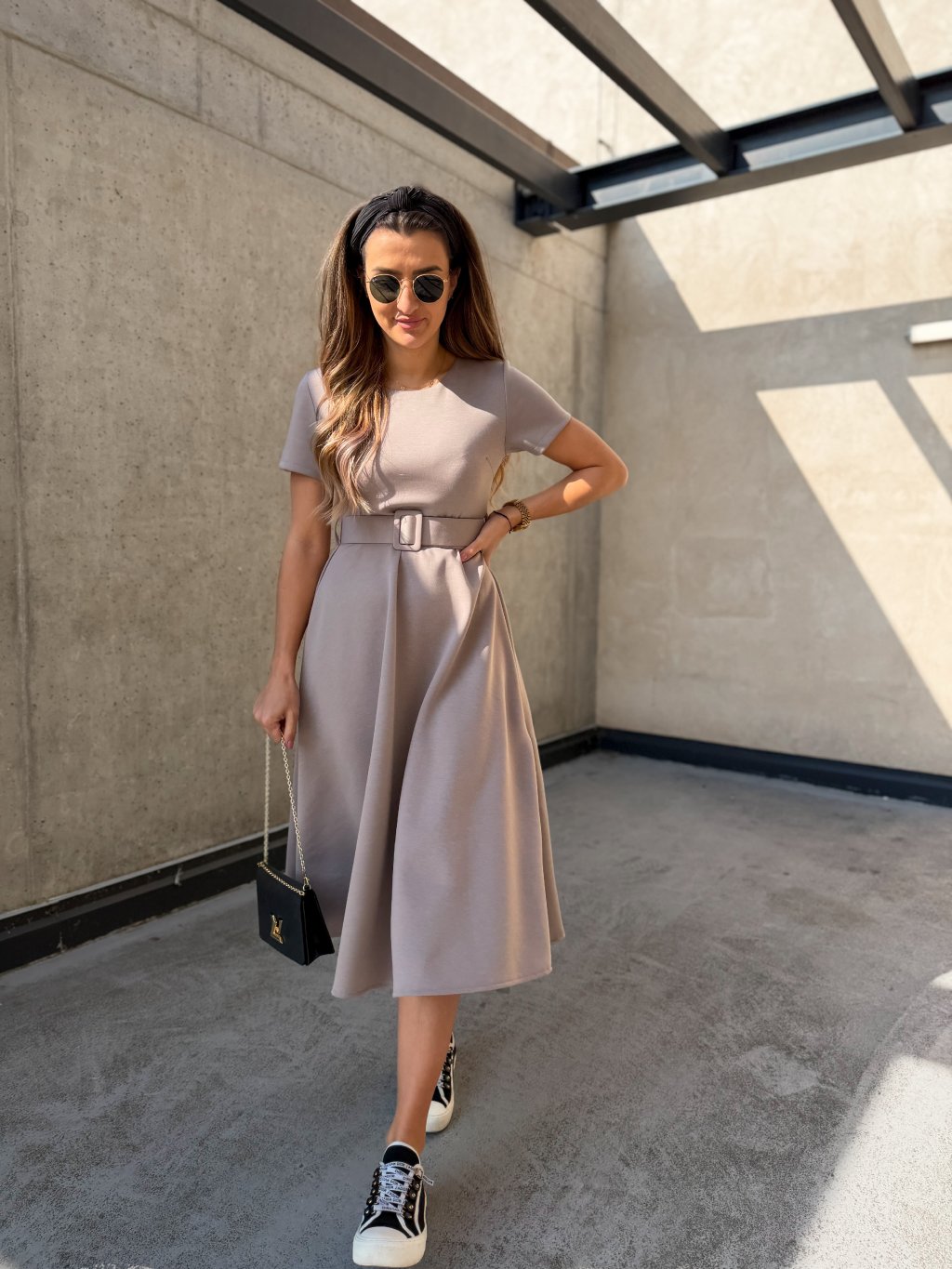 Hladké midi šaty s páskem Cappuccino