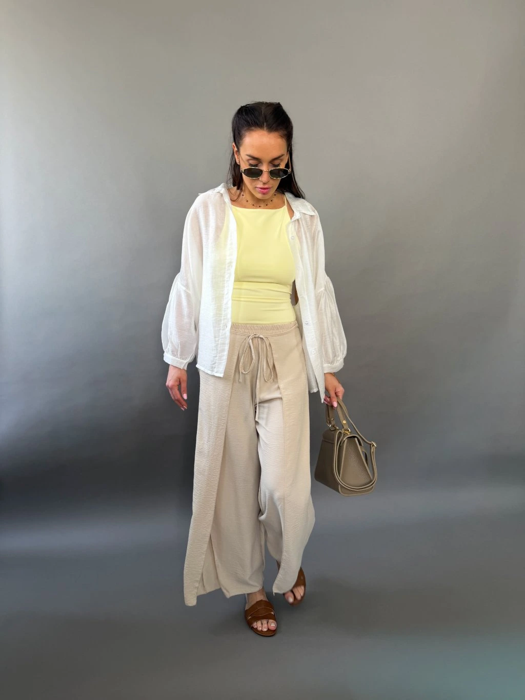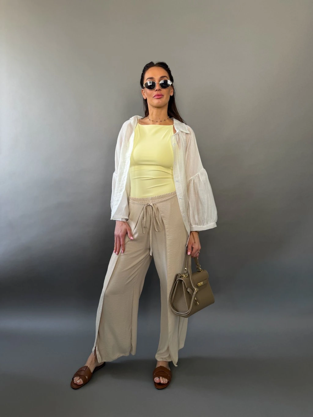 Luxusní dámské kalhoty s vázankou a lehkým rozparkem. Nakombinujte například s našimi topy a riflovými bundičkami. Vytvořte si pohodlný, svěží a stylový jarní outfit. Kalhoty jsou střihově kratší a sedí do výšky 168 cm.
