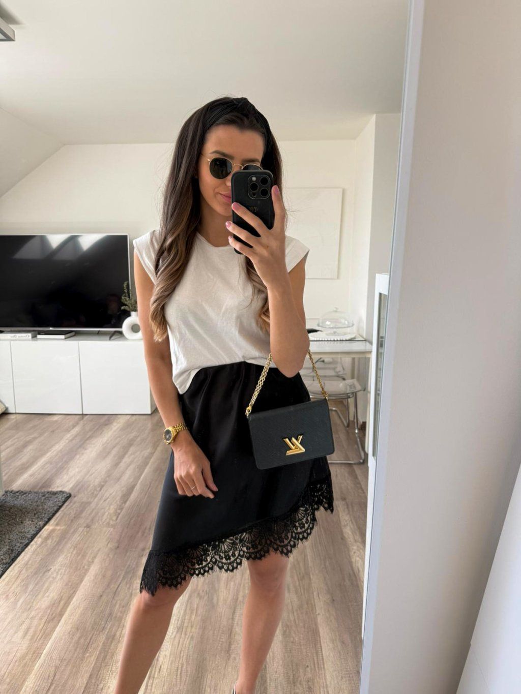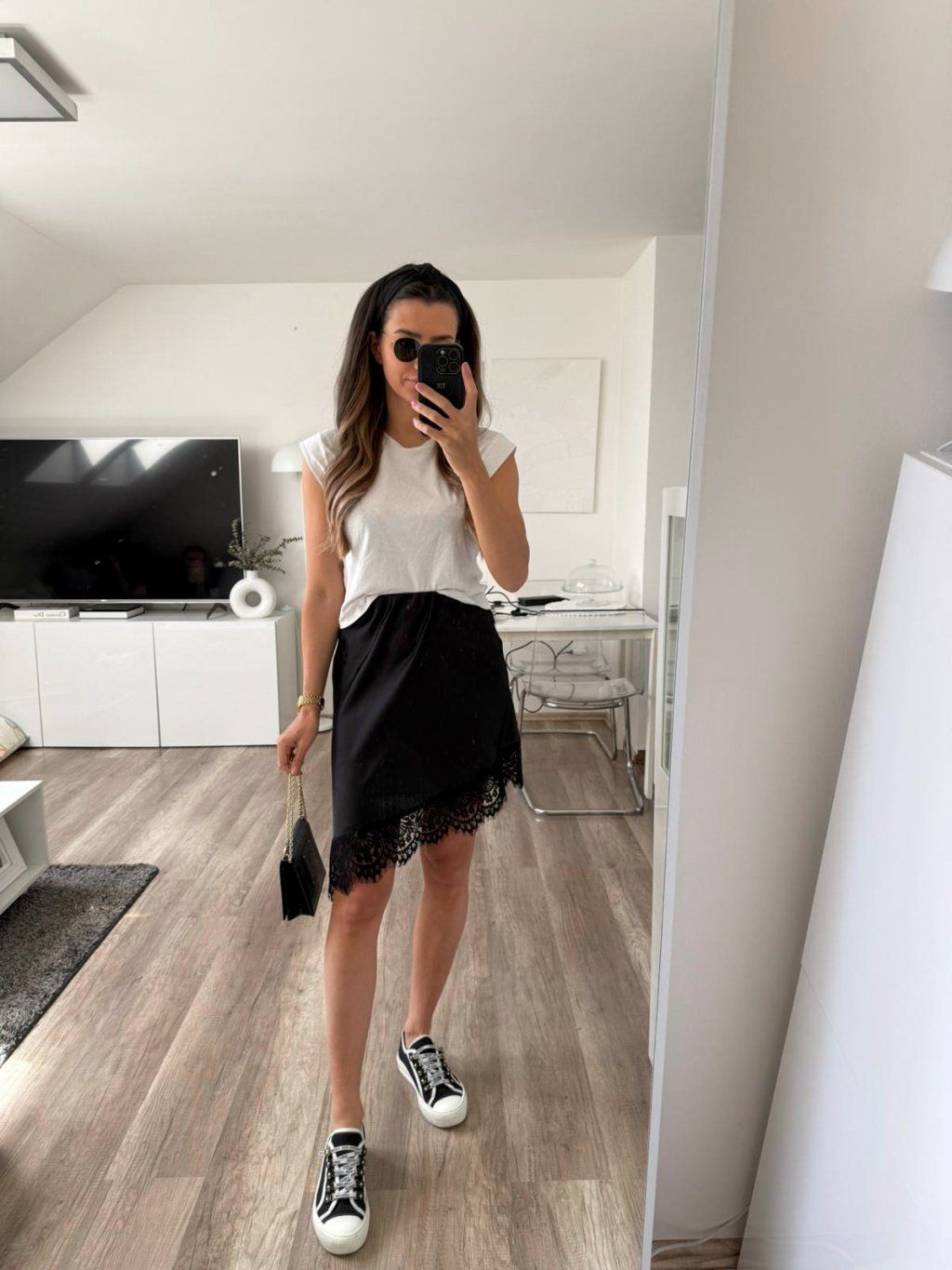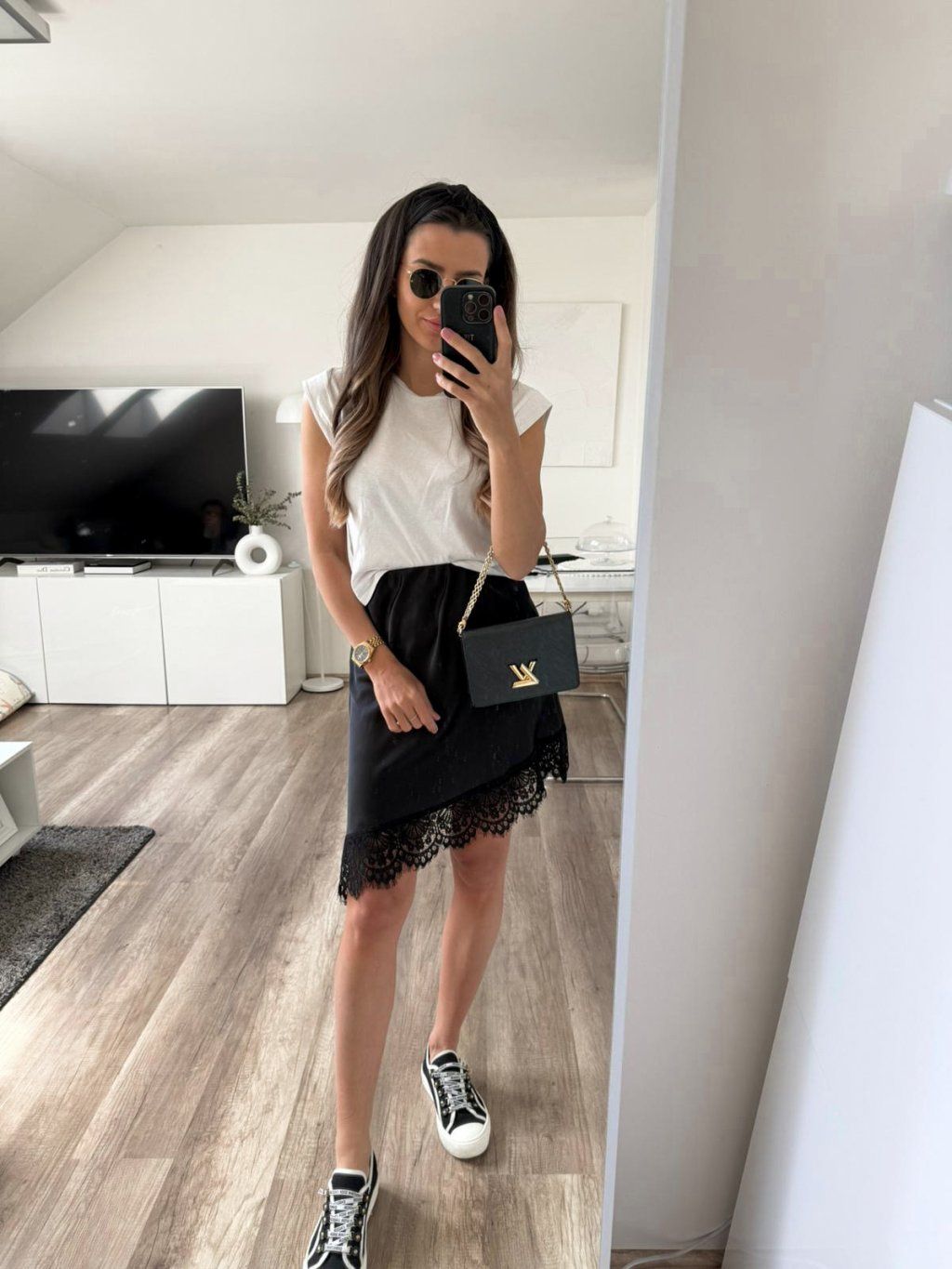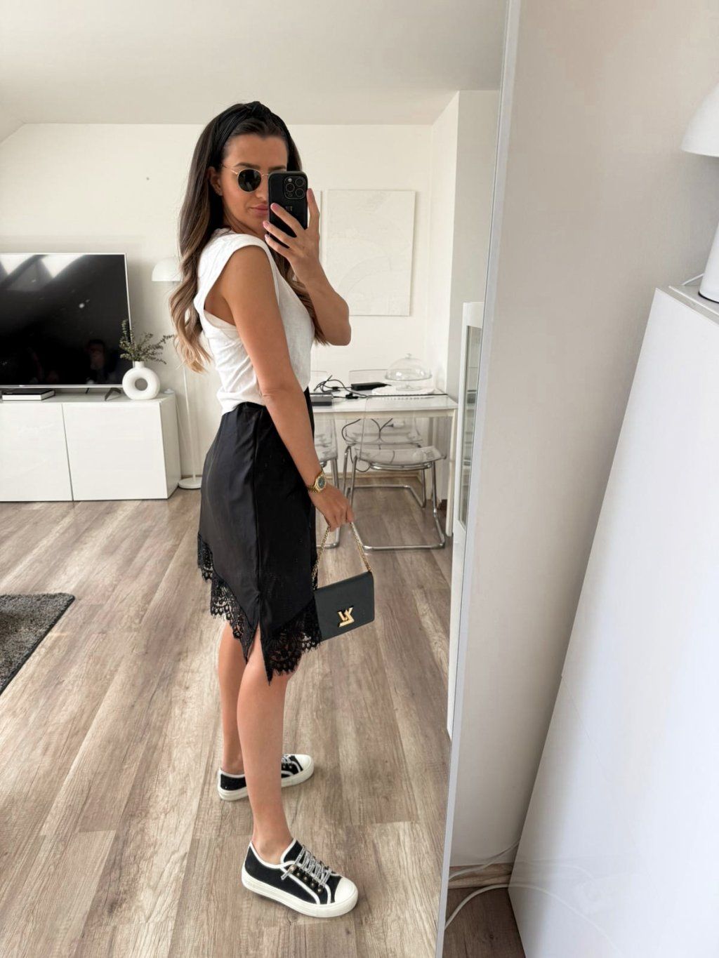 Saténová sukně mírně áčkového střihu. Délka nad kolena, v pase na gumu, spodní lem je ozdoben krajkou. Po stranách jsou lehké rozparky.