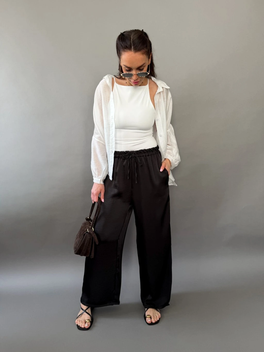 Luxusní dámské široké lesklé kalhoty s gumou v pase. Nakombinujte například s našimi topy a košilemi a vytvořte si tak pohodlný, svěží a stylový jarní outfit. Kalhoty jsou spíše kratšího střihu a budou sedět postavě do 168 cm.
