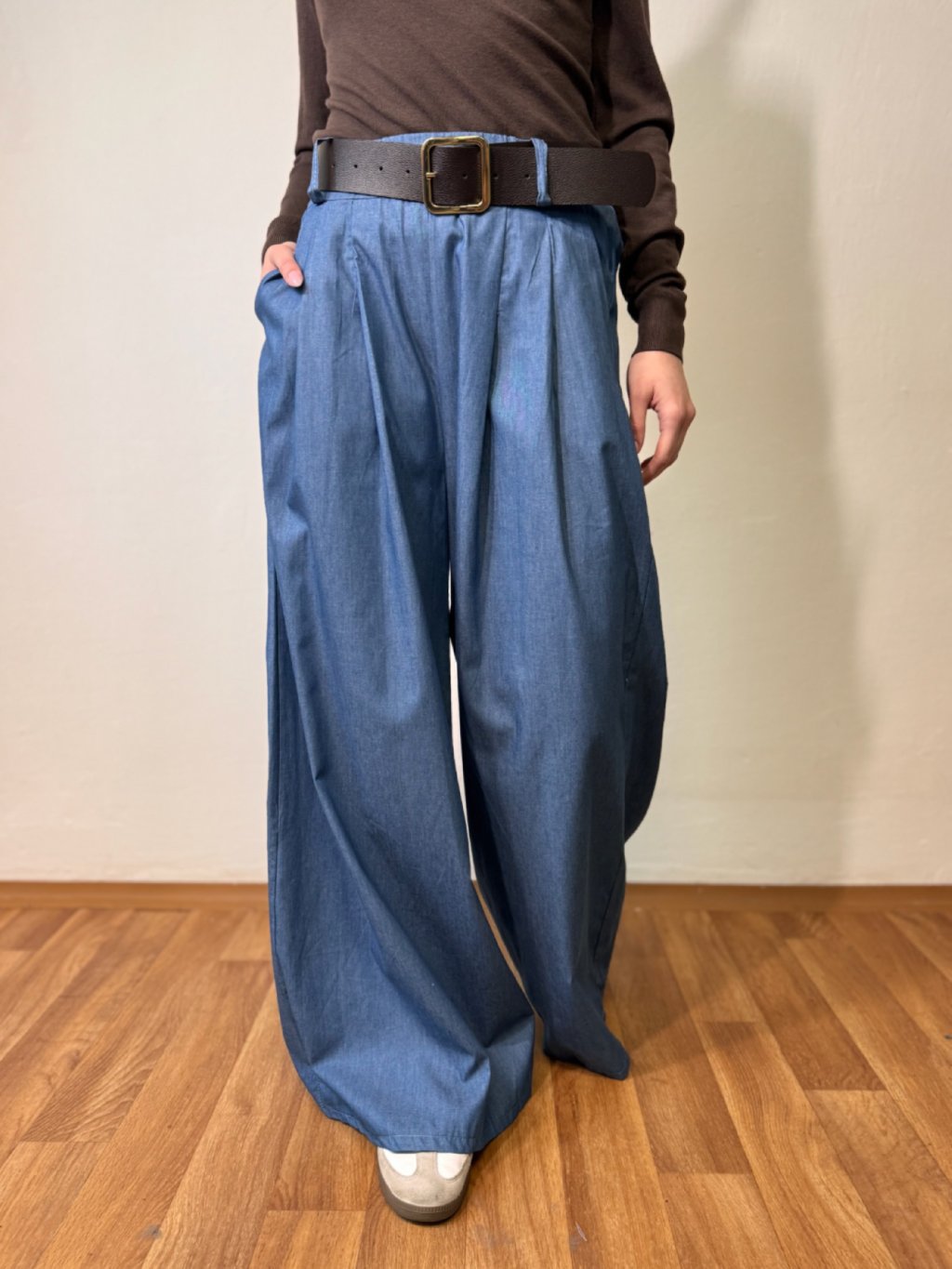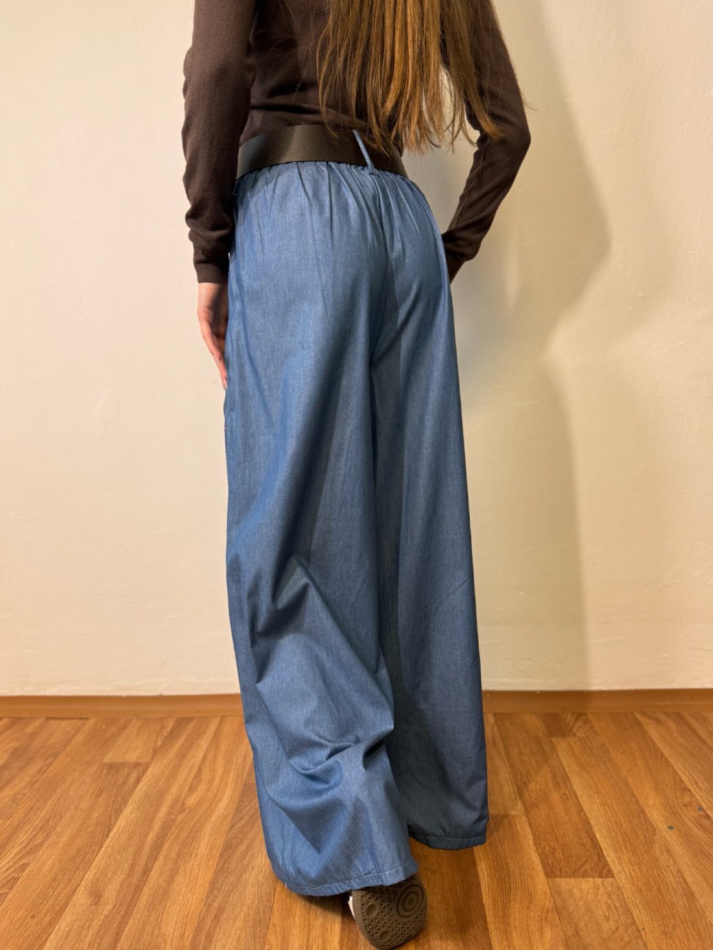 Ležérní široké kalhoty v barvě džínoviny - lehoučký a příjemný kousek z jemného a vzdušného materiálu. Moderní střih širokých kalhot, které vám umožní se celý den cítit komfortně. Součástí je i moderní pásek, který lze odejmout. Lze kombinovat do sportovních i elegantních outfitů. Kalhoty, které potřebuje každá žena ve svém šatníku.