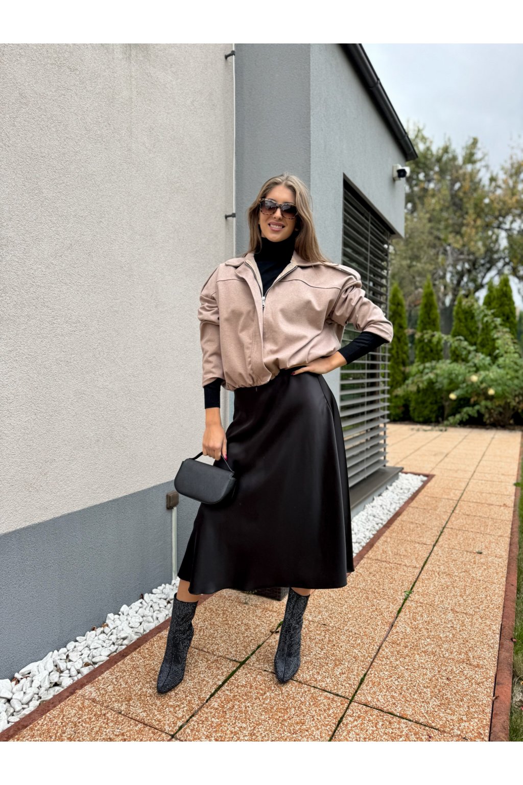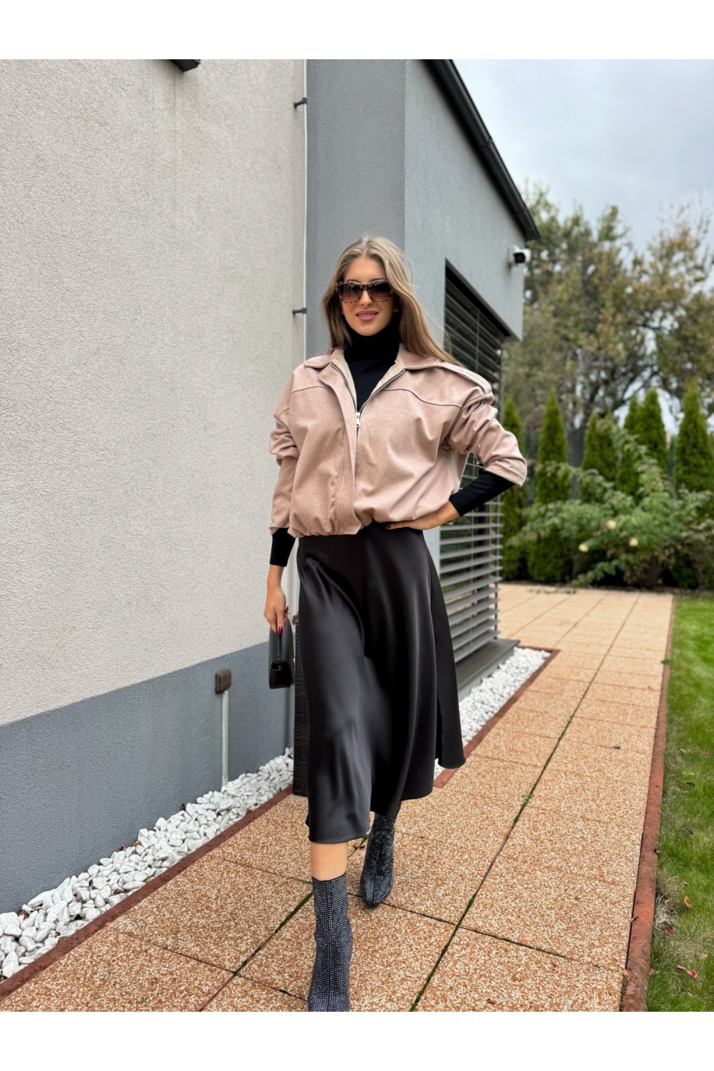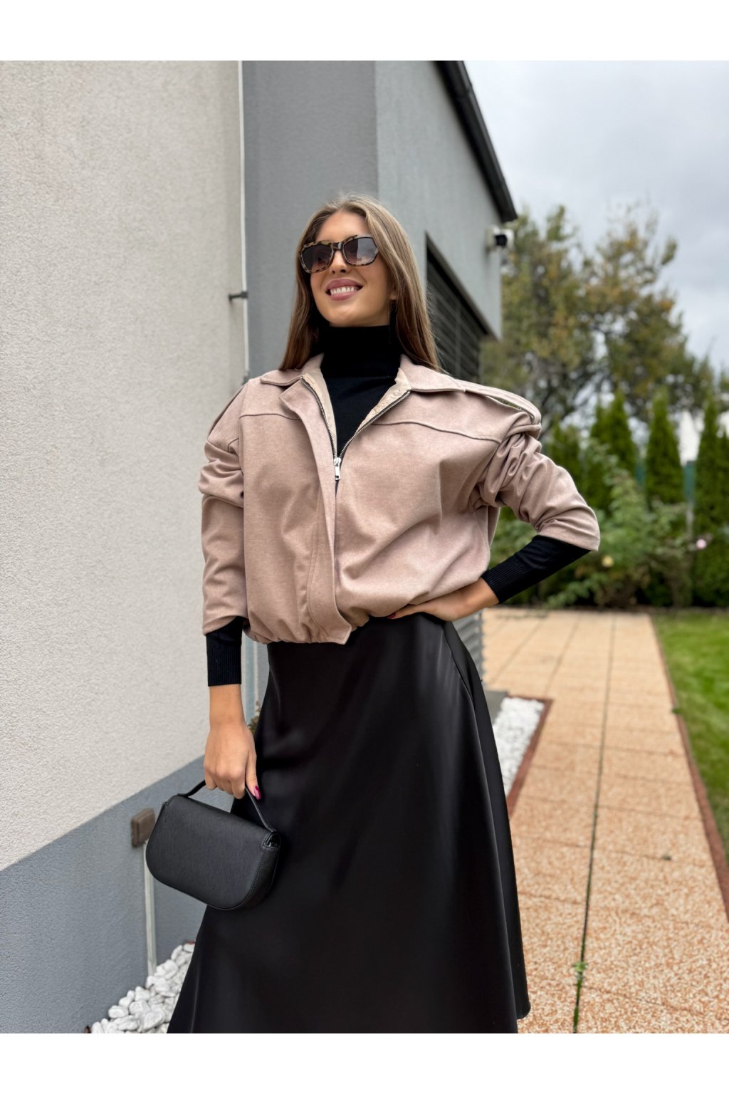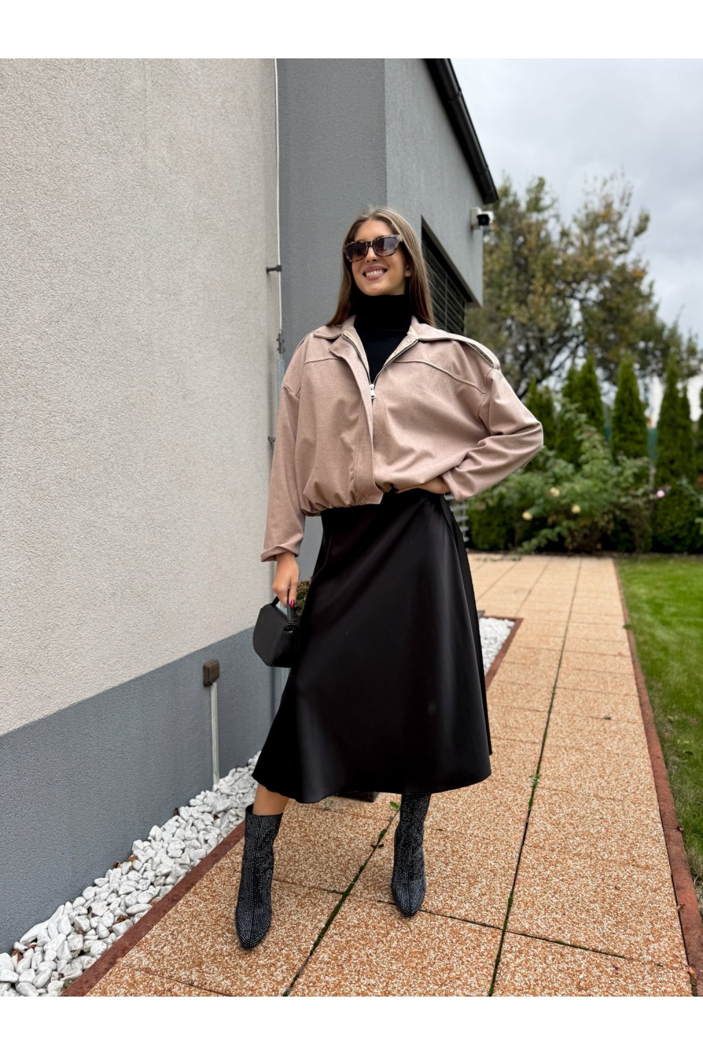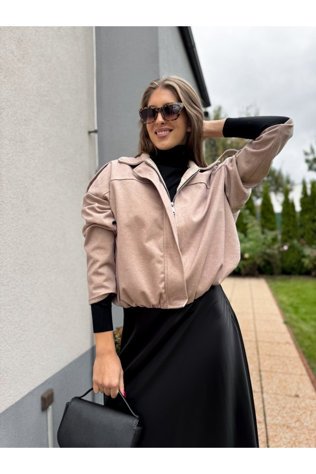Stylový podzimní bomber vyrobený v Itálii z jemného, měkkého a příjemného materiálu. Zapíná se na zip a je doplněn stylovým límečkem a gumou v pase pro pohodlné nošení. Má lehce širší oversize střih, který dodává moderní a pohodlný look. Perfektní volba pro každodenní elegantní i ležérní podzimní outfity.
