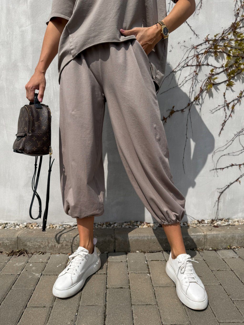 Stylová dámská tepláková souprava. Mikina je řešena jako lehce oversized s rozparkem vzadu. Tepláky mají kapsy po stranách, v pase a dole jsou na gumu.