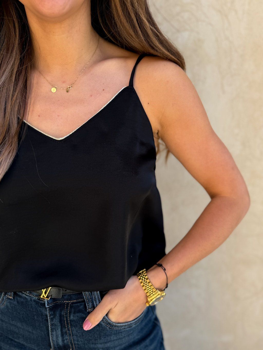 Luxusní saténové tílko. Tílko má nastavitelná ramínka. Nakombinovat můžete například se sakem a riflemi a vytvořit si tak velmi pohodlný a stylový outfit. Ideální i na léto ke kraťáskům nebo v zimě ke svetrům se spadlým ramenem.