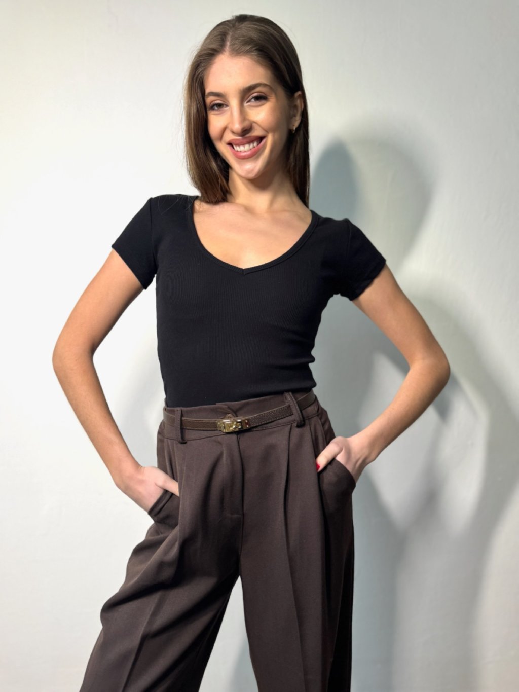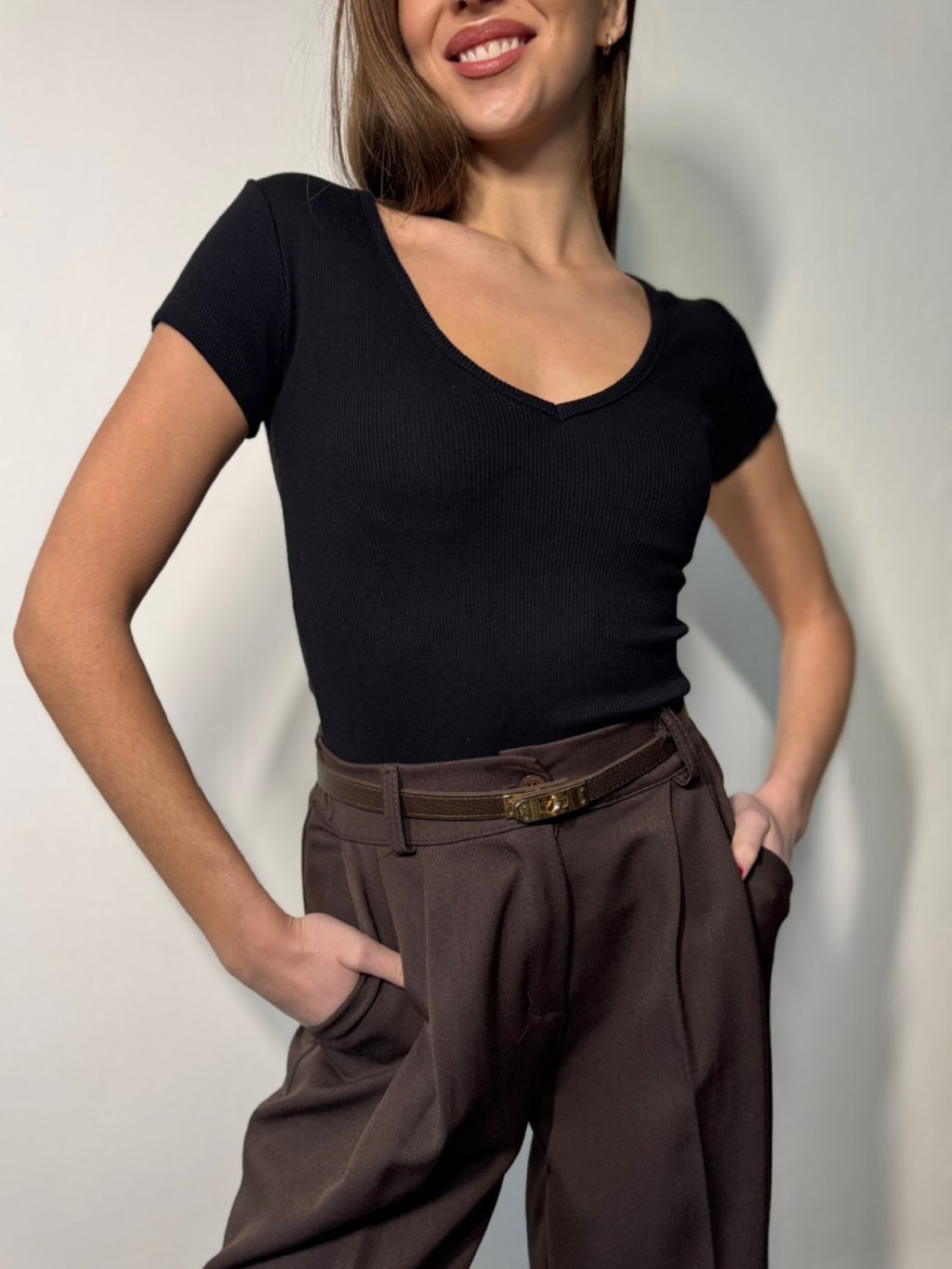 Trendy tričko z žebrovaného materiálu s výstřihem do V. Stylový kousek, který lze nakombinovat v každém outfitu. Jednoduché, klasické, originální. Příjemně sedí, přizpůsobí se každé postavě.